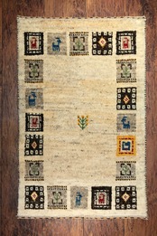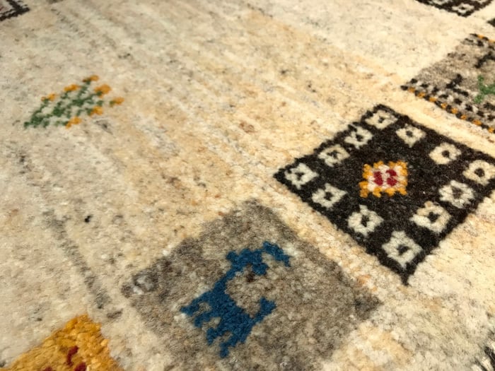 染められていない原毛の明るめのベージュベースの ギャッベです。
