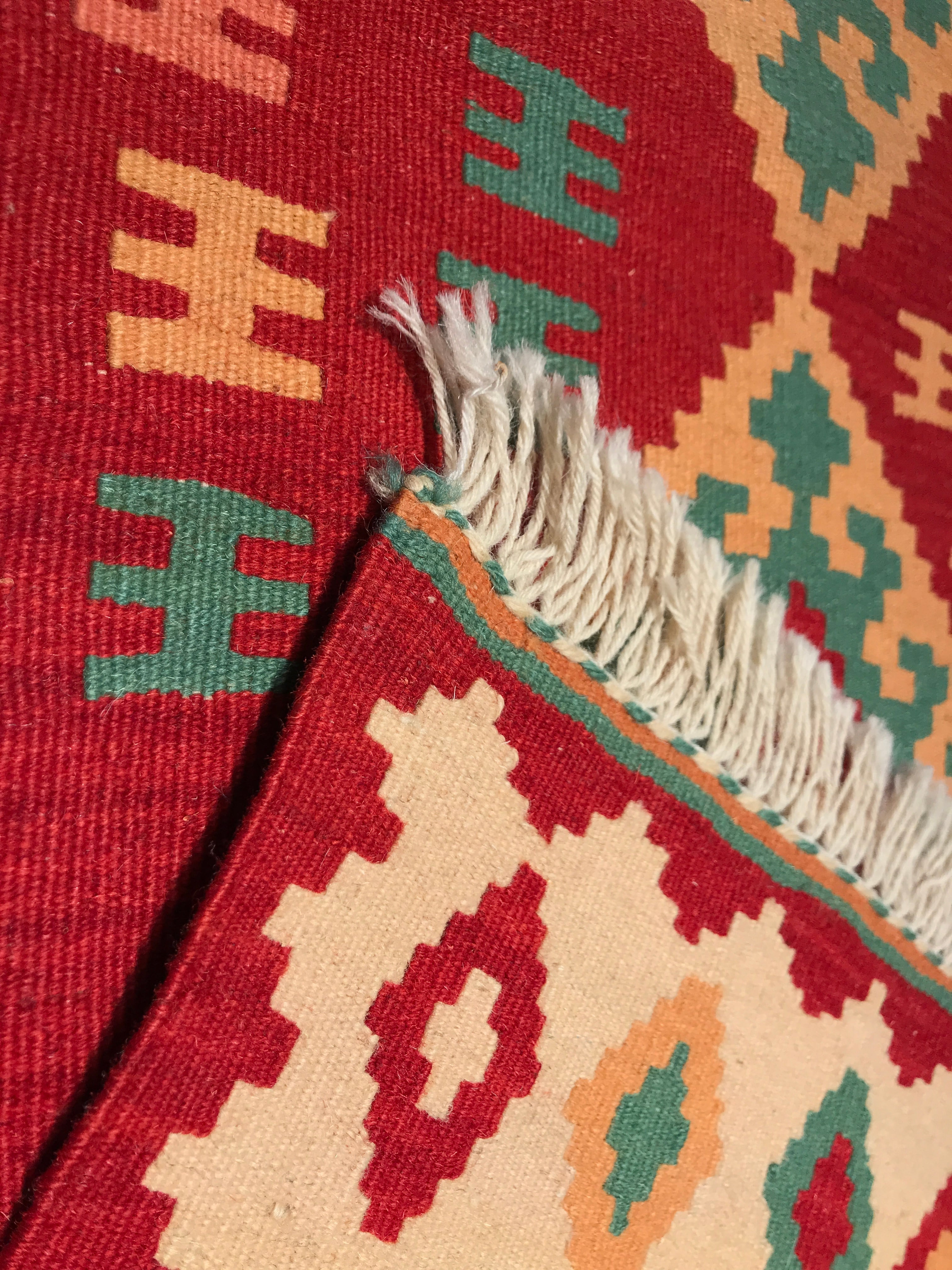 キリムらしい明るい色合いの幾何学文様で印象が強そうなイメージですが、お部屋をスッキリ引き締めてくれる雰囲気を持っています。スタイリッシュなデザインですが伝統的な紋様と南西イランらしい明るい色の組み合わせです。デザインモチーフの幾何学紋様にはお守りのような意味があったり、幸せへの願い等が込められています。