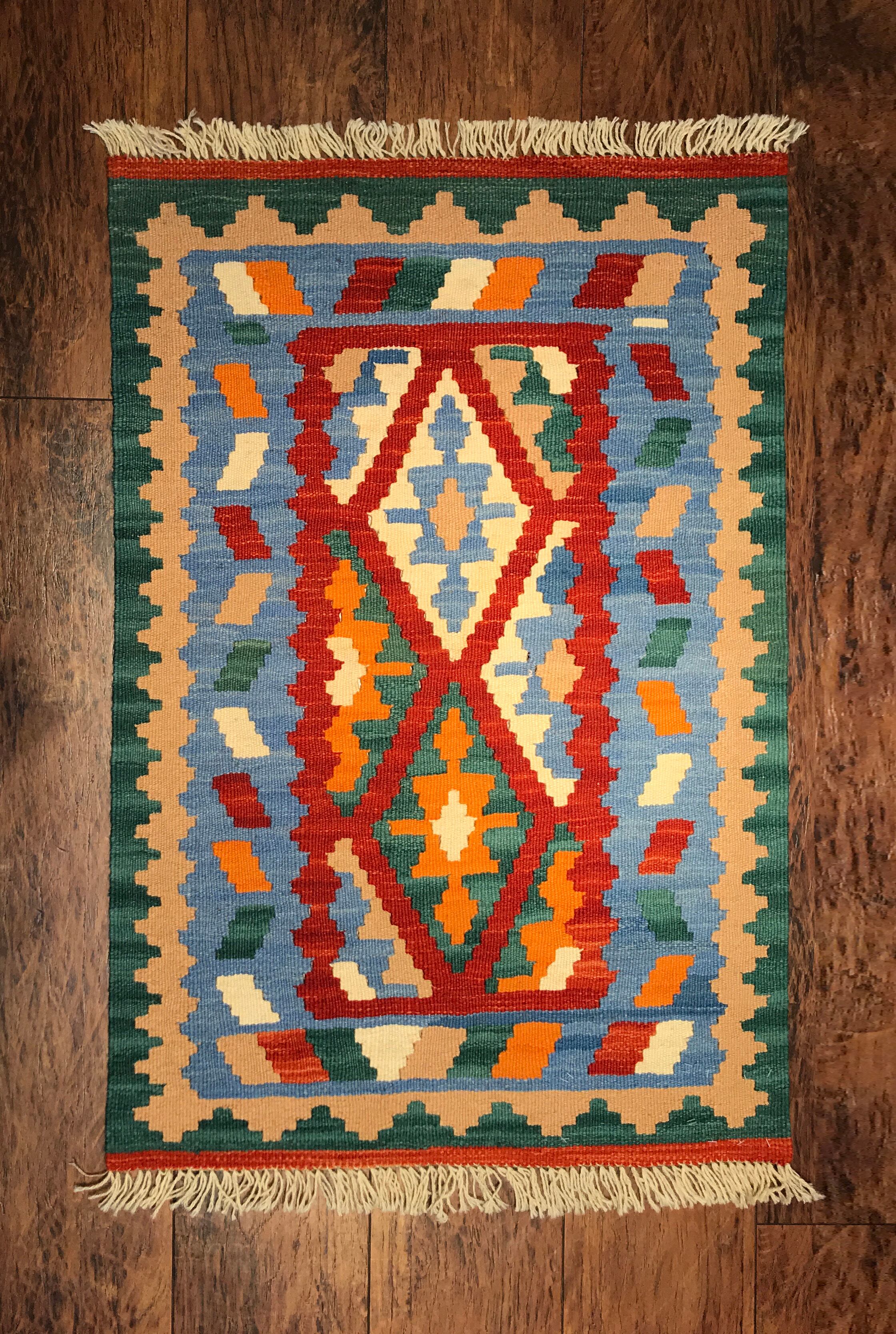 キリムらしい明るい色合いの幾何学文様で印象が強そうなイメージですが、お部屋をスッキリ引き締めてくれる雰囲気を持っています。スタイリッシュなデザインですが伝統的な紋様と南西イランらしい明るい色の組み合わせです。デザインモチーフの幾何学紋様にはお守りのような意味があったり、幸せへの願い等が込められています。