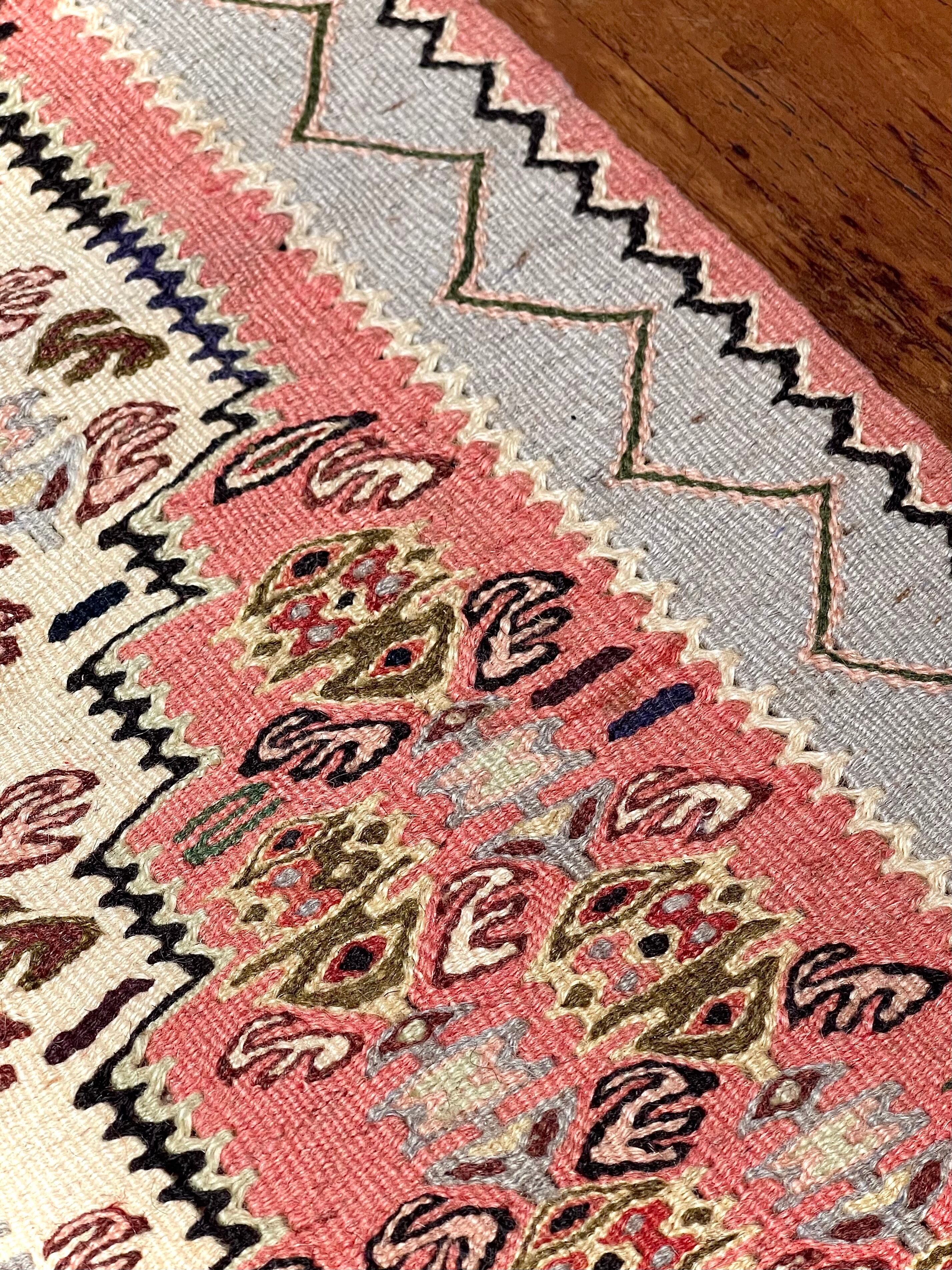 上質なウールを使用した織りの細かいキリムのため薄い織り上がりです。厚みはないものの床の冷たさを感じさせず、また暑い季節でもさらっとしたお使い心地でオールシーズン活躍します。お玄関マットとして、ベッドサイドや洗いやすいのでキッチンマットにもおススメです。軽量のため、画鋲などで壁に留めることができ、気軽にタペストリーとしてもお楽しみ頂けます。