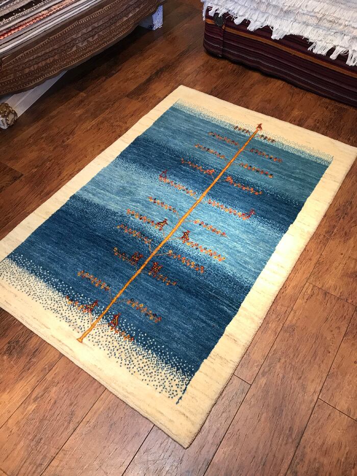 藍染めのブルーのグラデーションが美しいギャッベです。樹木のデザインは長寿を祈るモチーフとされています。