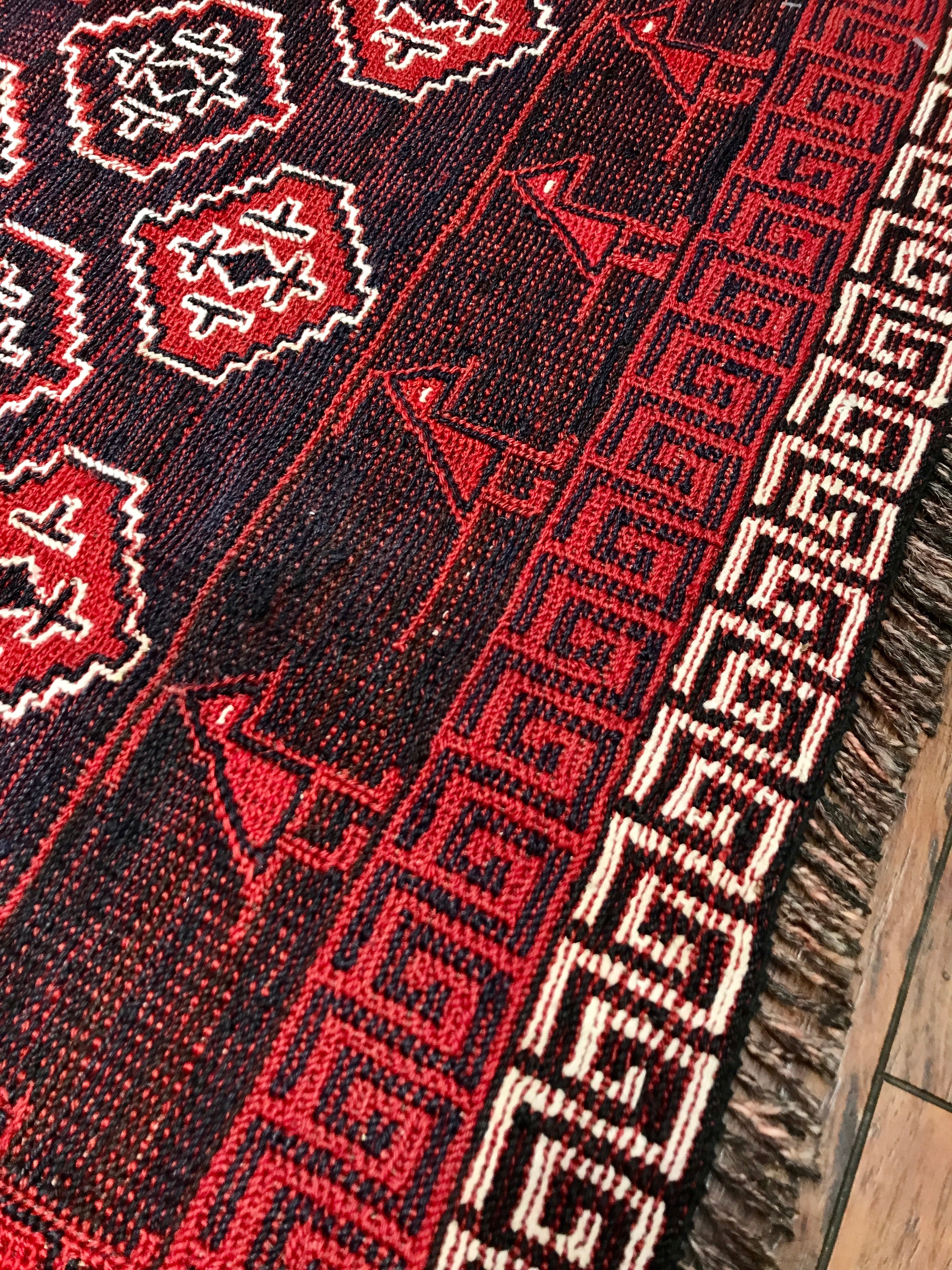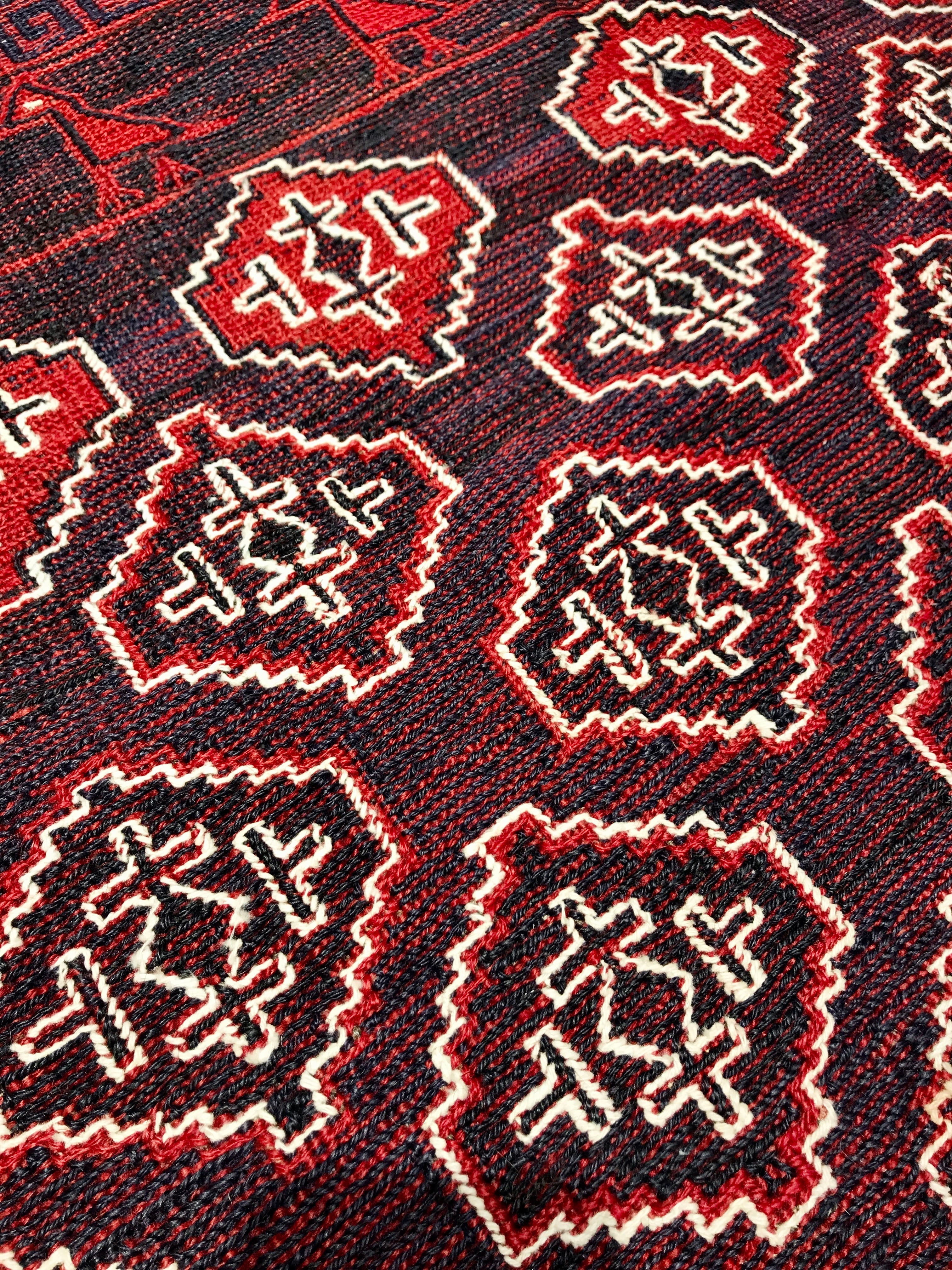 東イラン、グーチャン産の袋物だったのを開いて一枚に仕立て直したオールドキリムです。