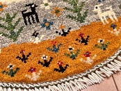 当店では、〈正方形〉と〈円形〉の2種類のタイプのミニギャッベをご用意致しております。円形タイプは、より細めの上質なウールが用いられていることから、織りが細かく、曲線や細密な表現が活かされた景色や動物(ライオン・ラクダ)など、個性的なデザインが揃います。