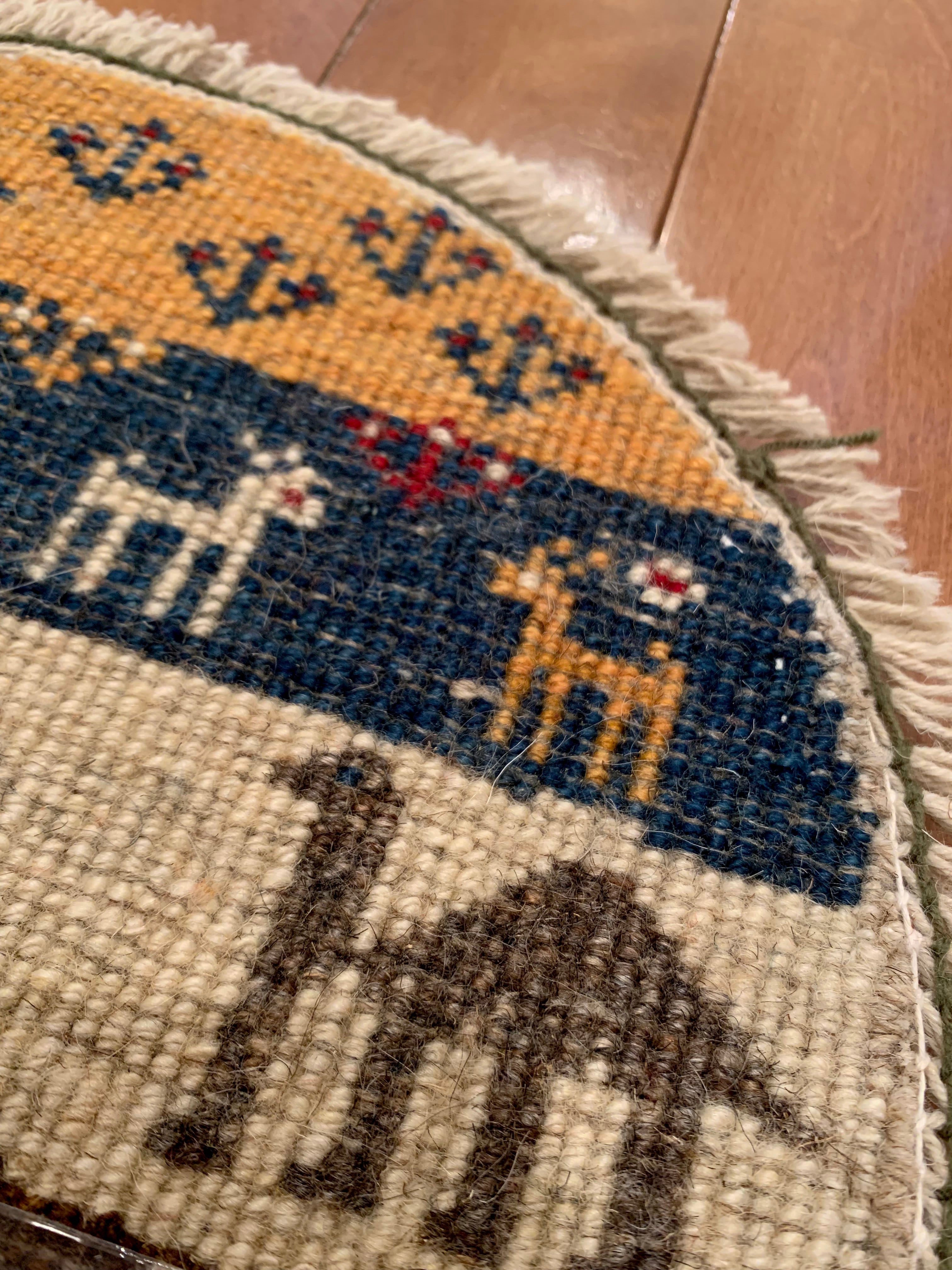 当店では、〈正方形〉と〈円形〉の2種類のタイプのミニギャッベをご用意致しております。円形タイプは、より細めの上質なウールが用いられていることから、織りが細かく、曲線や細密な表現が活かされた景色や動物(ライオン・ラクダ)など、個性的なデザインが揃います。