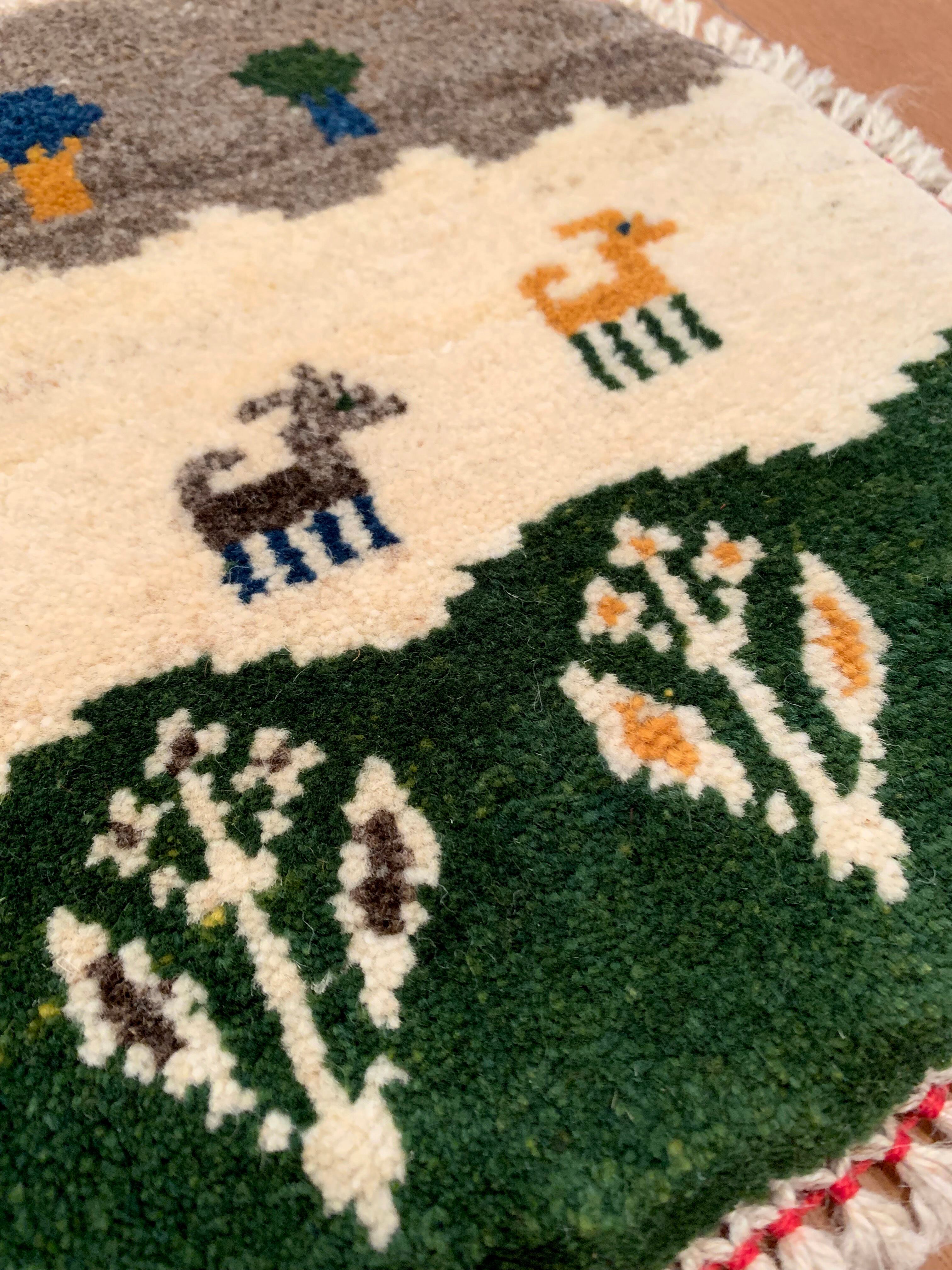 当店では、〈正方形〉と〈円形〉の2種類のタイプのミニギャッベをご用意致しております。円形タイプは、より細めの上質なウールが用いられていることから、織りが細かく、曲線や細密な表現が活かされた景色や動物(ライオン・ラクダ)など、個性的なデザインが揃います。