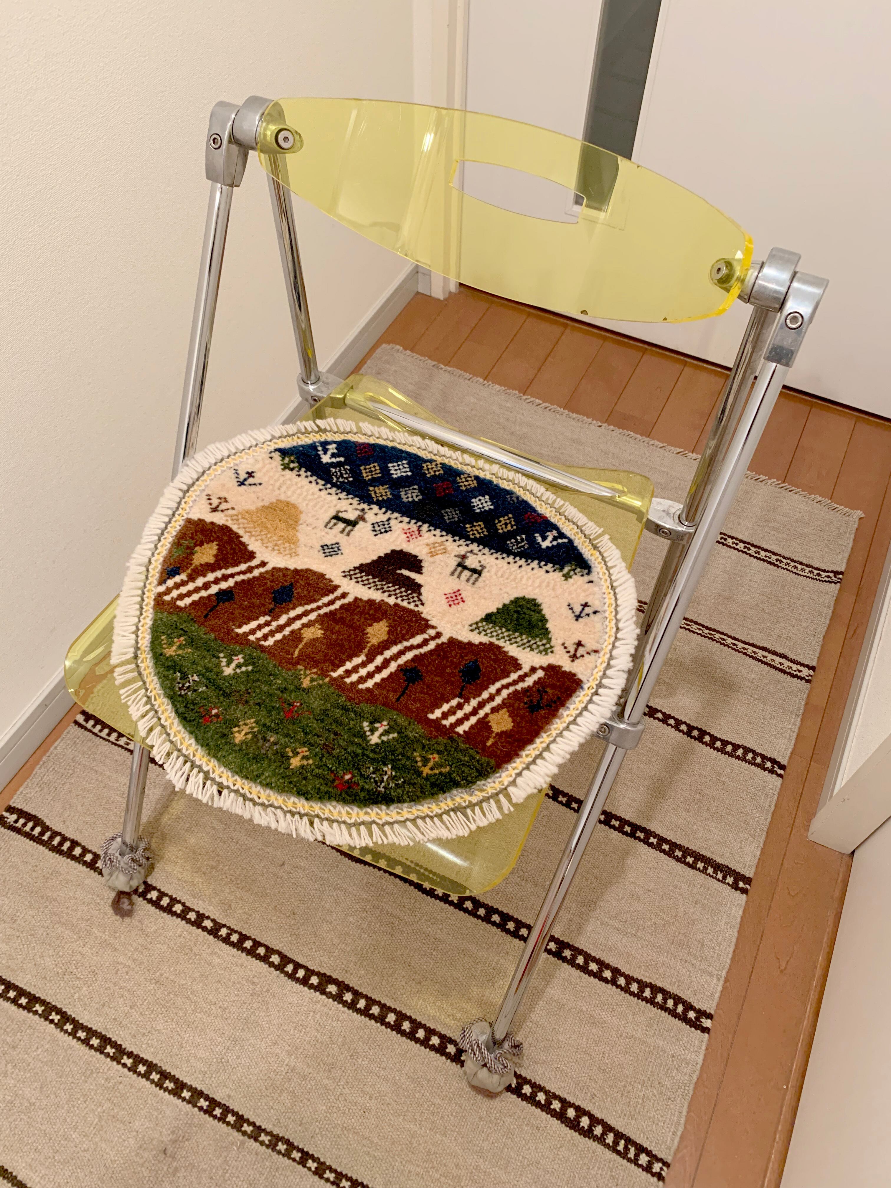 通常タイプのお椅子の座面にお使い頂いても、自然に見えるサイズ感です。座面が円形のお椅子には、是非丸いミニギャッベを合わせたいですね!周囲にフサがつくと、より華やかな印象になります♪