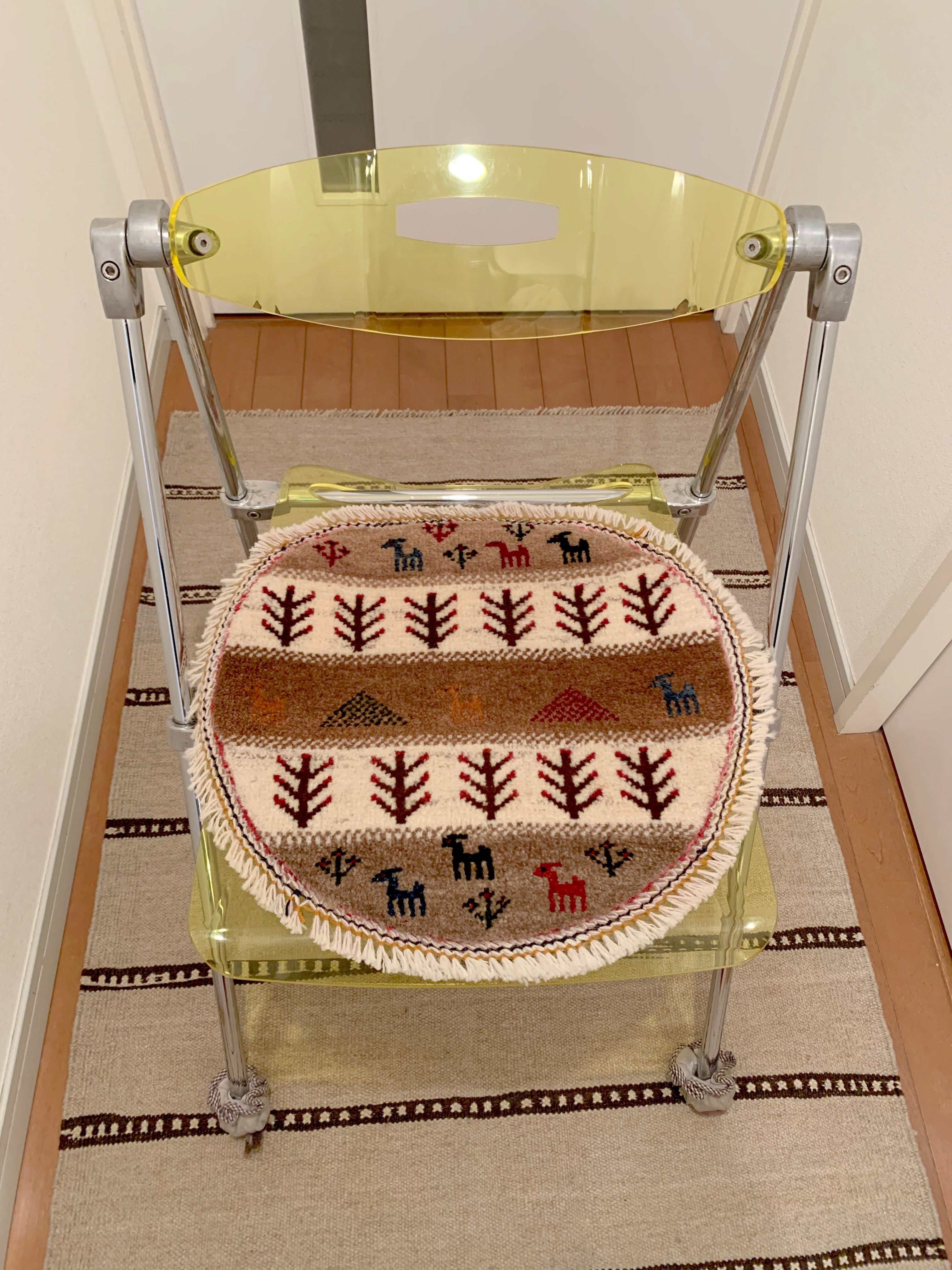 通常タイプのお椅子の座面にお使い頂いても、自然に見えるサイズ感です。座面が円形のお椅子には、是非丸いミニギャッベを合わせたいですね!周囲にフサがつくと、より華やかな印象になります♪