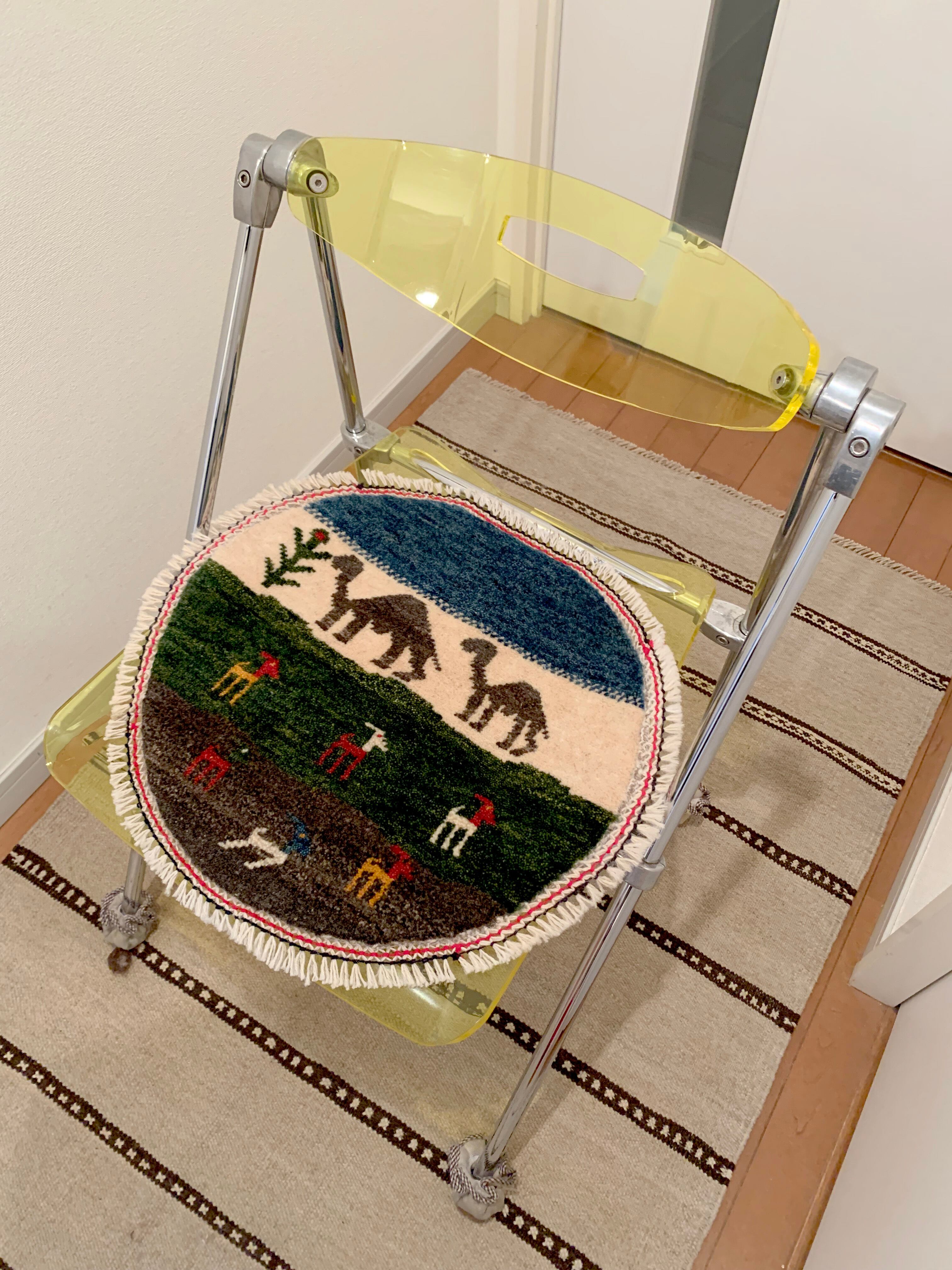 通常タイプのお椅子の座面にお使い頂いても、自然に見えるサイズ感です。座面が円形のお椅子には、是非丸いミニギャッベを合わせたいですね!周囲にフサがつくと、より華やかな印象になります♪