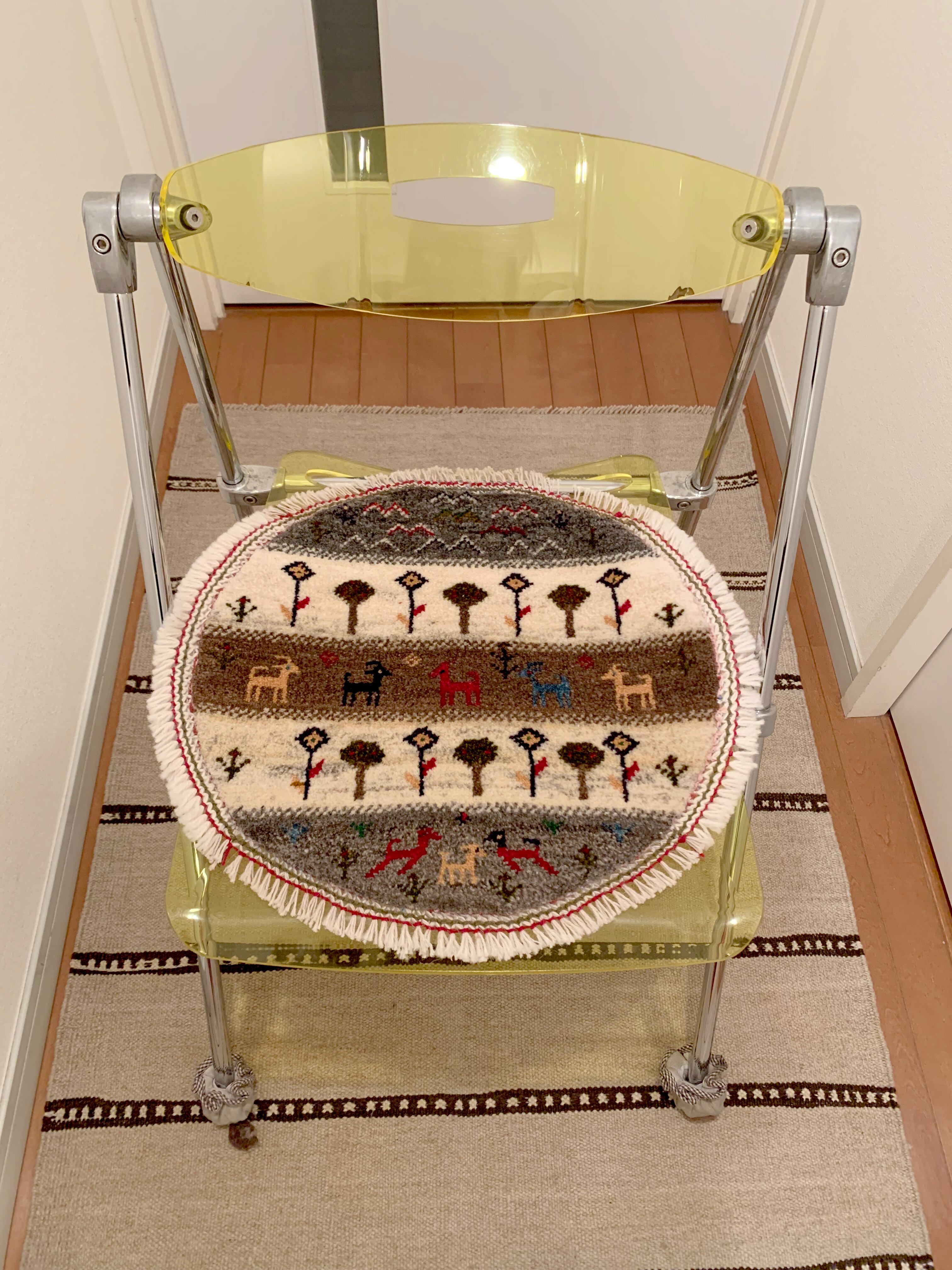 通常タイプのお椅子の座面にお使い頂いても、自然に見えるサイズ感です。座面が円形のお椅子には、是非丸いミニギャッベを合わせたいですね!周囲にフサがつくと、より華やかな印象になります♪