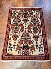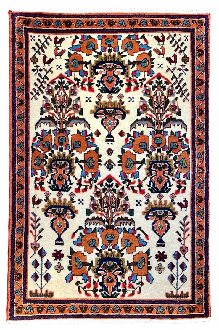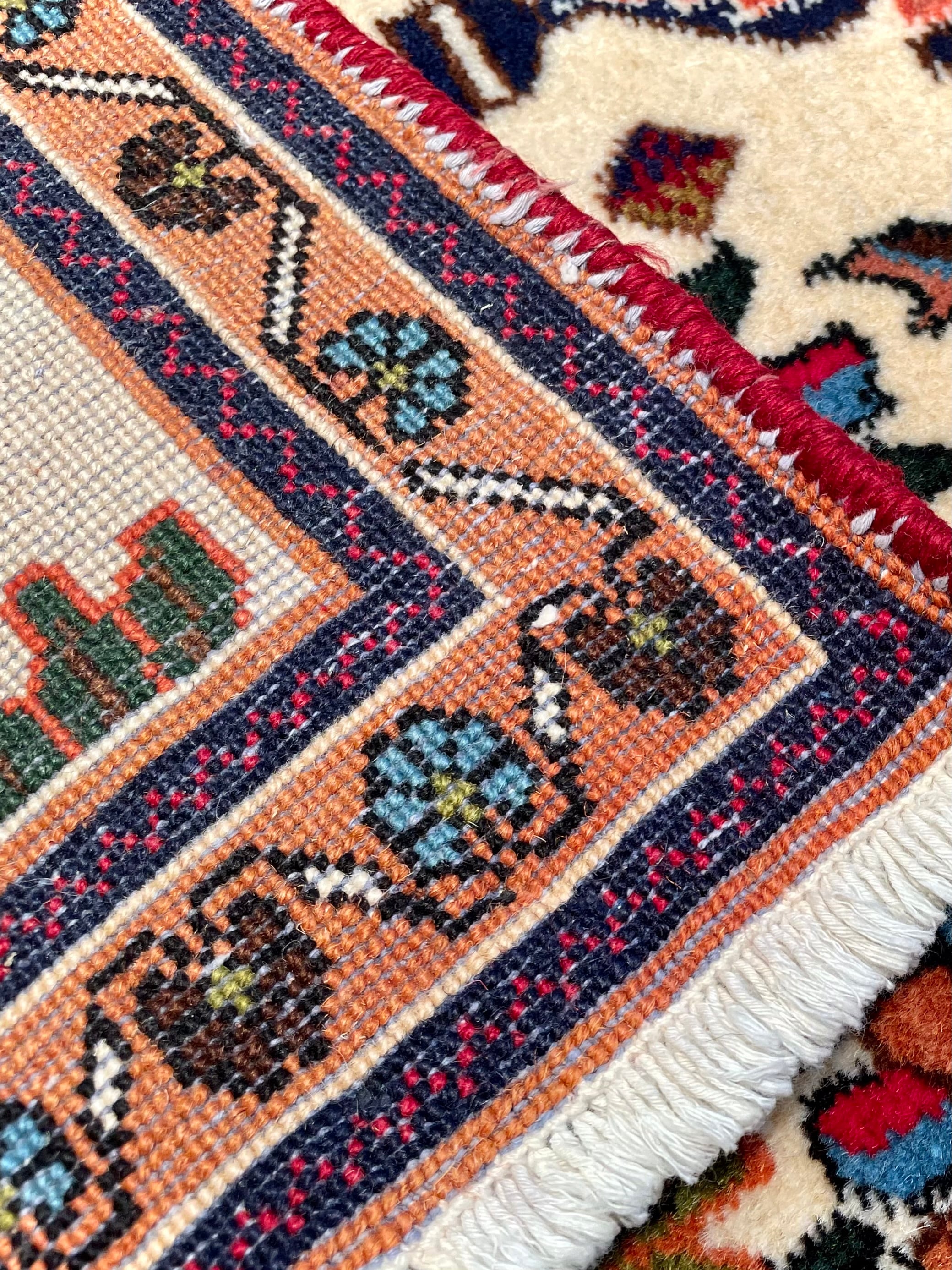 南イランのこの地域には、アフシャール族系の人々が多く暮らしています。アフシャール族のルーツはトルキャマン族で、11-12世紀のセルジューク朝期に、北西イランとアナトリア付近に移動してきたことが始まりと言われています。王朝が変わり体勢が変わる毎に、強制移住や分裂を繰り返し、集住エリアが変わっていきました。このような移動の背景から、各地を転々としてきたアフシャール族の絨毯のデザインのバリエーションは幅広く、大きく分けて特徴的なものとしては ①菱形のメダリオン ②花瓶の連続紋様 ③スプレーフラワーなどがあります。