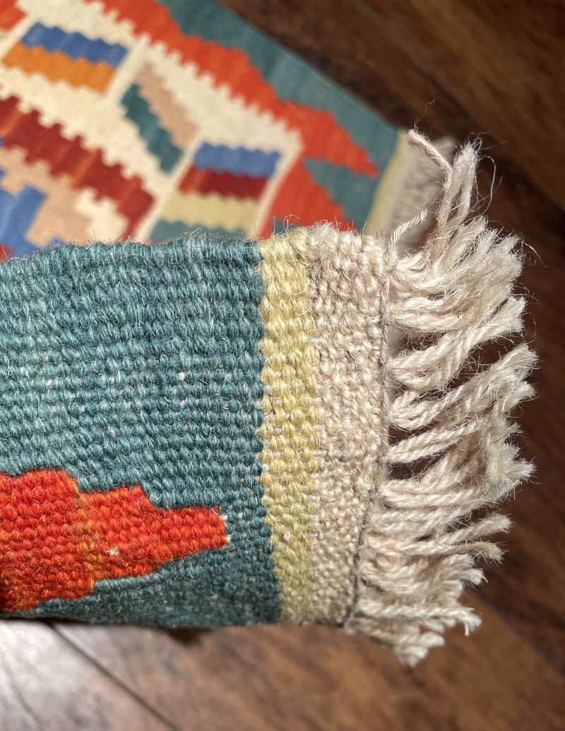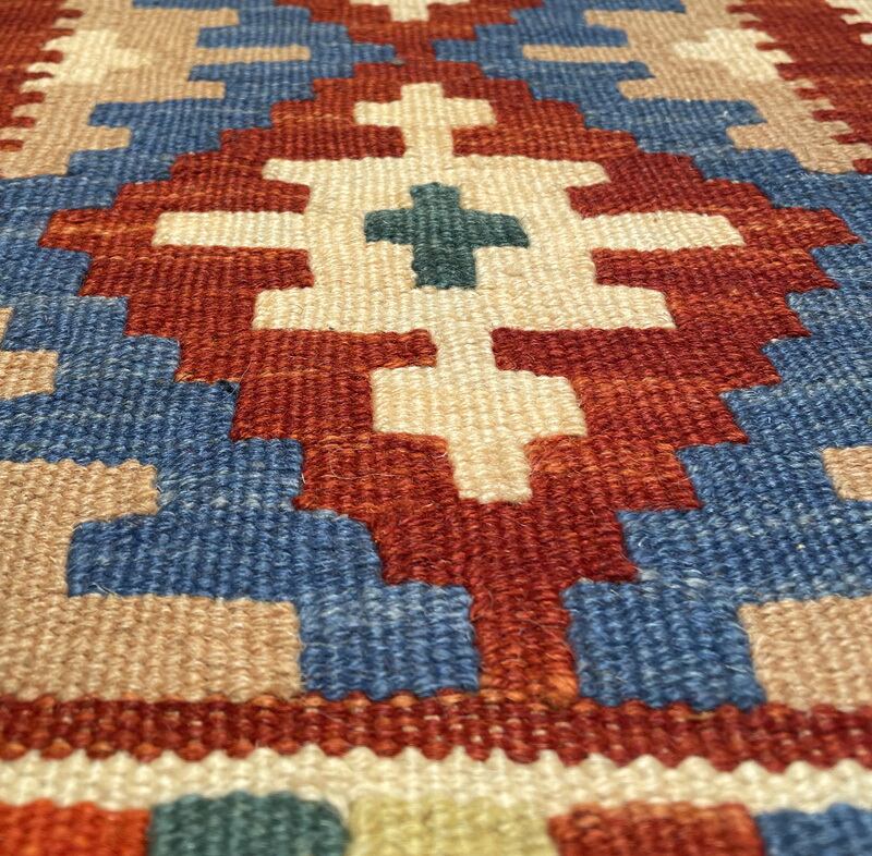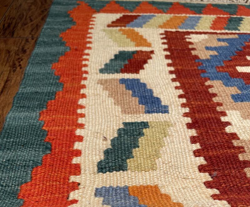 薄い織り上がりのキリムですが、ウールで織られているので、床の冷たさを感じさせず、また暑い季節でもスッキリとしたお使い心地で、オールシーズン活躍します。