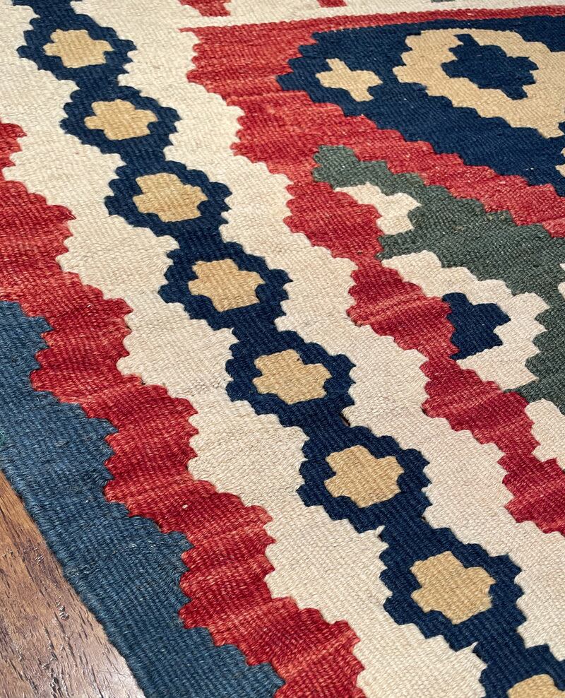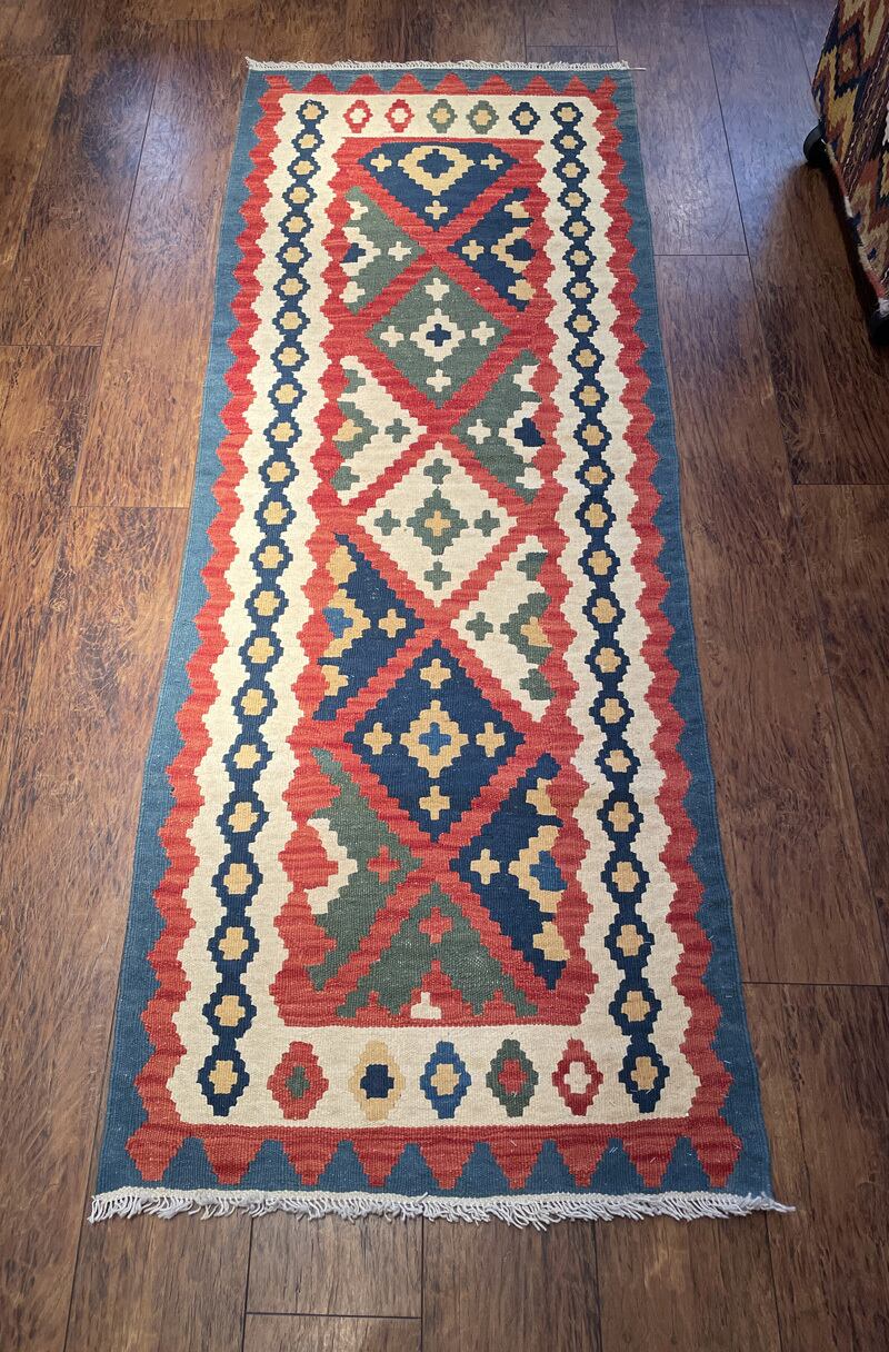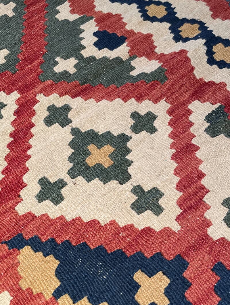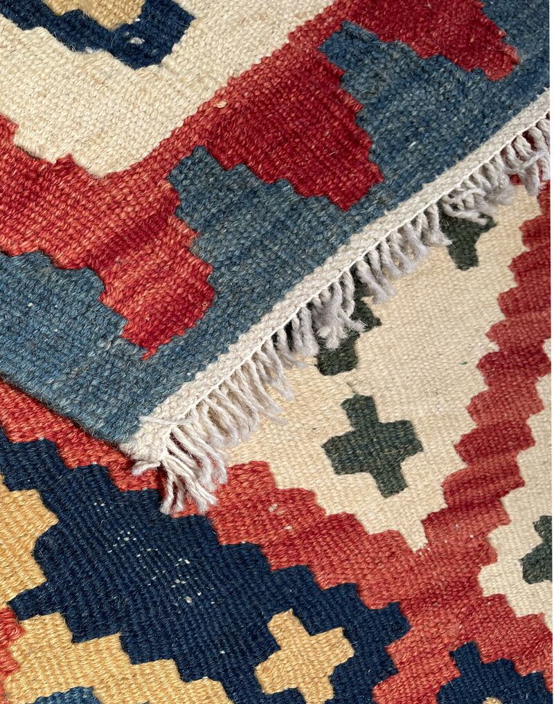 薄い織り上がりのキリムですが、ウールで織られているので、床の冷たさを感じさせず、また暑い季節でもスッキリとしたお使い心地で、オールシーズン活躍します。