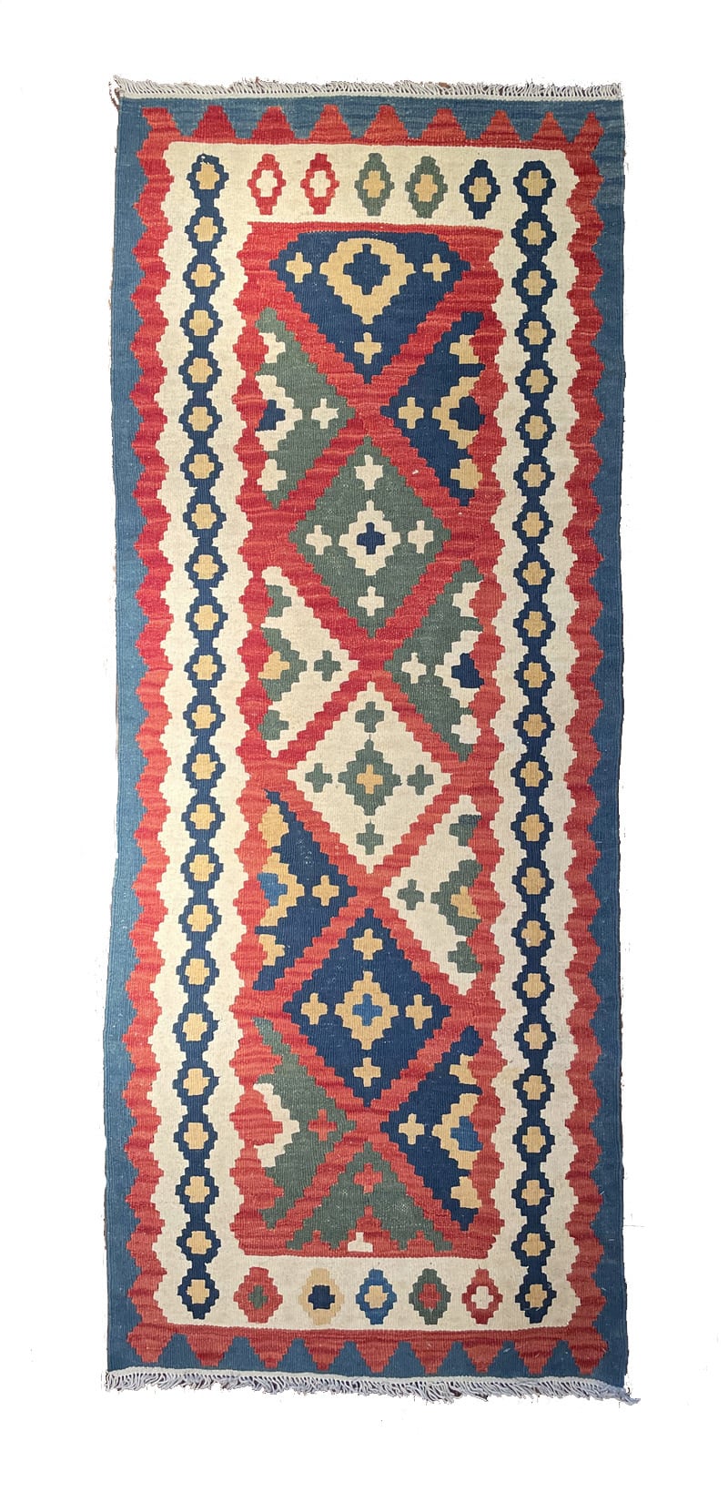 キリムらしい明るい色合いの幾何学紋様で、一見印象が強そうなイメージですが、お部屋をスッキリ引き締め、メリハリをもたらしてくれます。