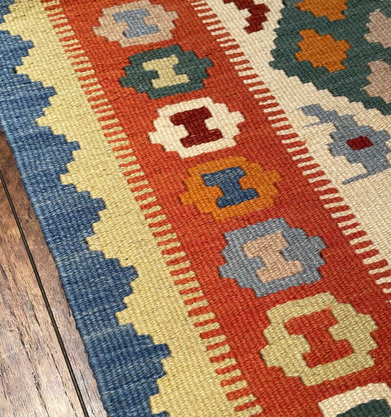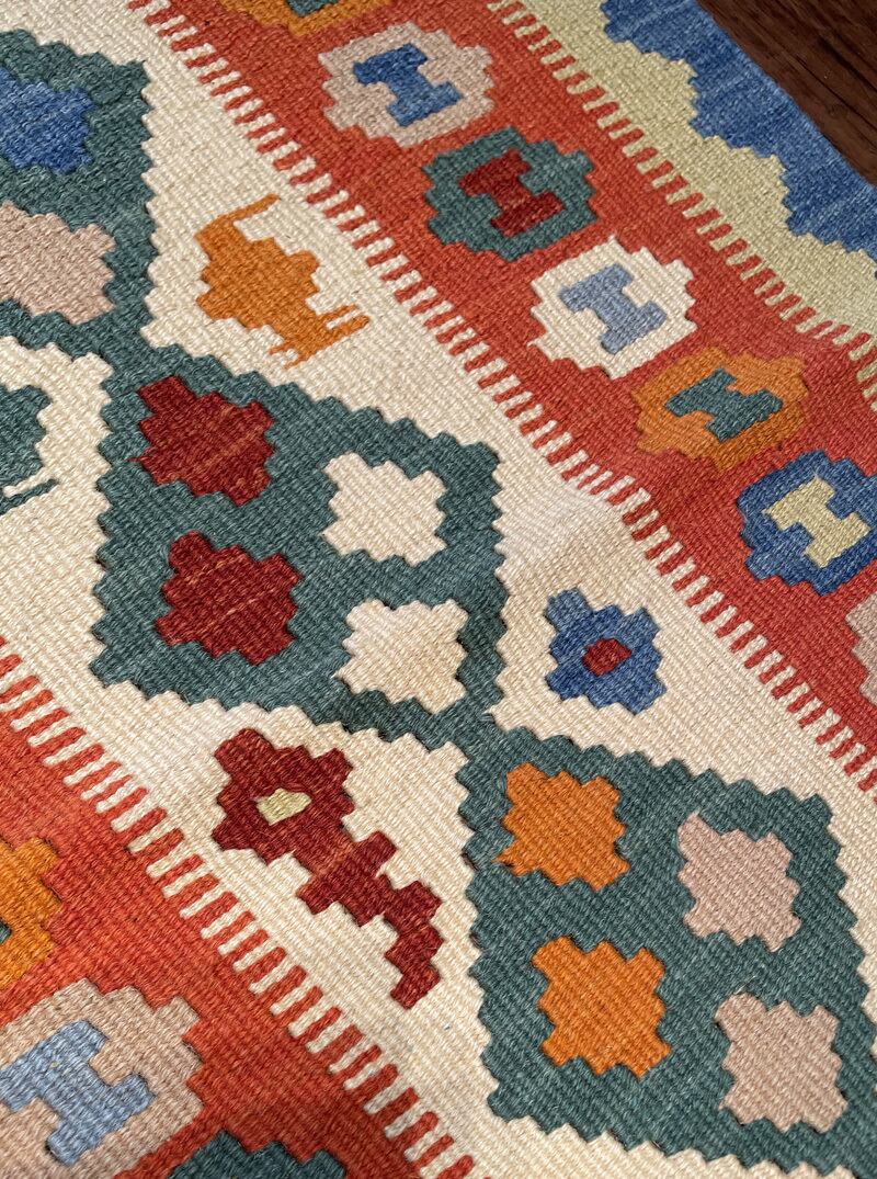 薄い織り上がりのキリムですが、ウールで織られているので、床の冷たさを感じさせず、また暑い季節でもスッキリとしたお使い心地で、オールシーズン活躍します。
