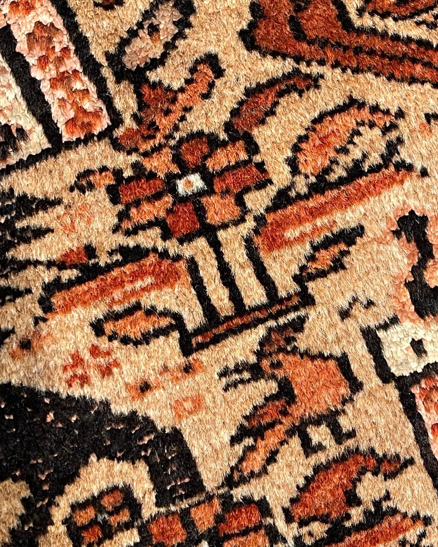 個性的な印象ですが、西イランの部族絨毯やキリムはもちろん、エレガント系のペルシャ絨毯にも合い、インテリアを選ばない不思議な魅力がある絨毯です。