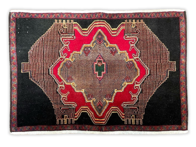 デザインのベースはクルド族らしい菱形ですが、中心から変形し左右に広がっていく形式、また細かな紋様を織り込まなかった単色部分の色の存在感など...どこを切りとっても、個性的で異彩を放つ一枚です。
