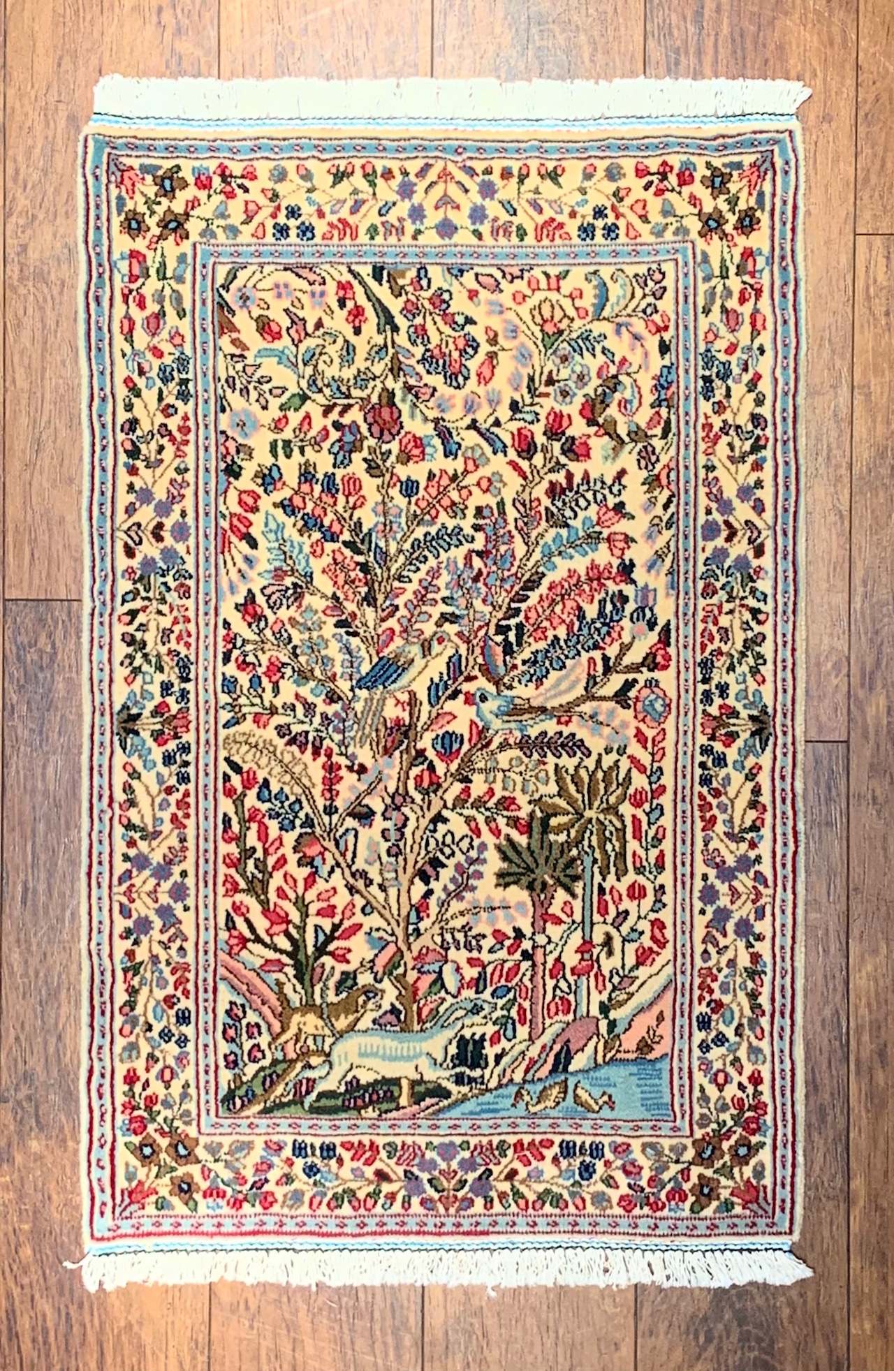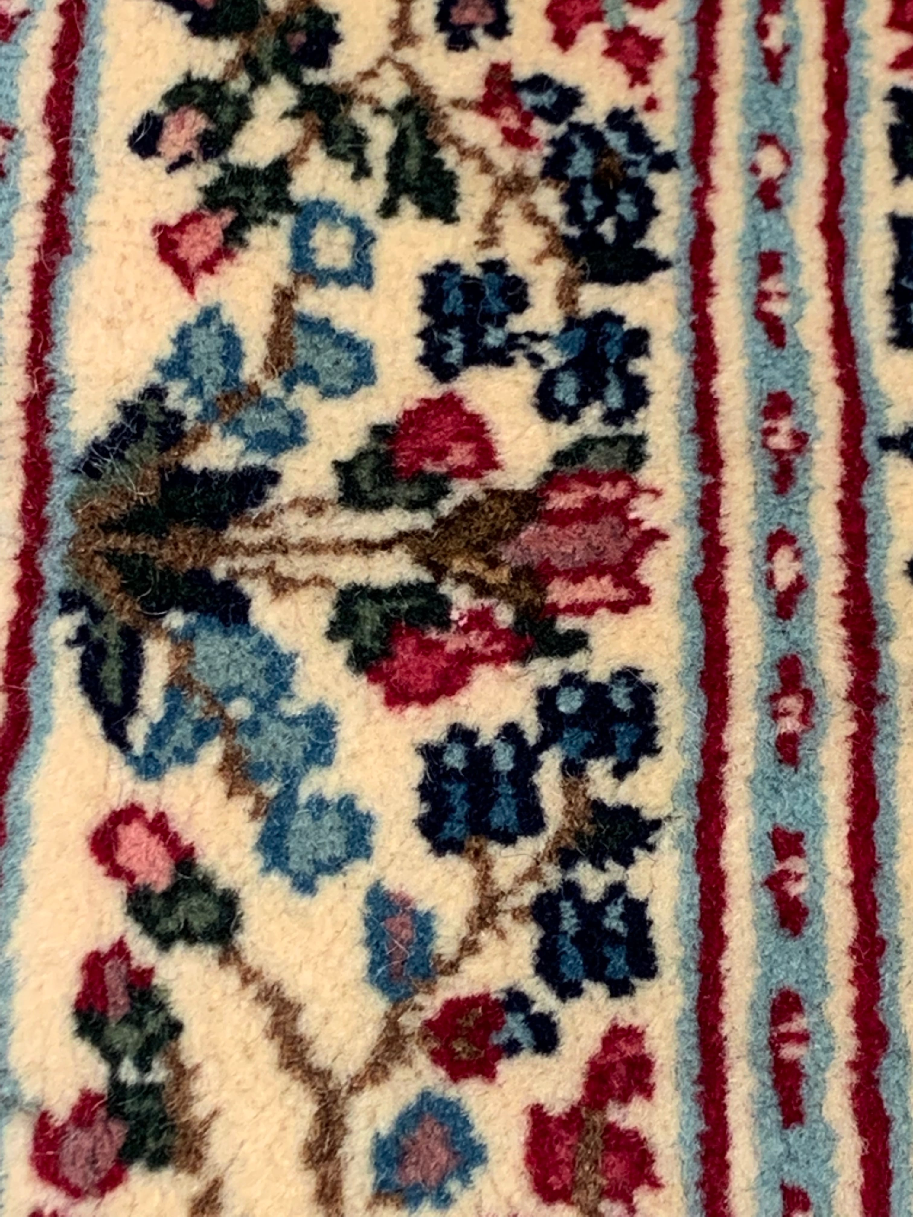 ケルマンの絨毯のデザインには、この地で先に行われていたショール生産の影響が見られます。ケルマンの美しいショールに関しては、マルコ・ポーロもその存在に触れており、当時のヨーロッパでは広く好まれていました。こうした歴史の中で、ケルマン独自の美的感覚が養われ、他に類をみない華やかな絨毯のデザインを作り上げています。