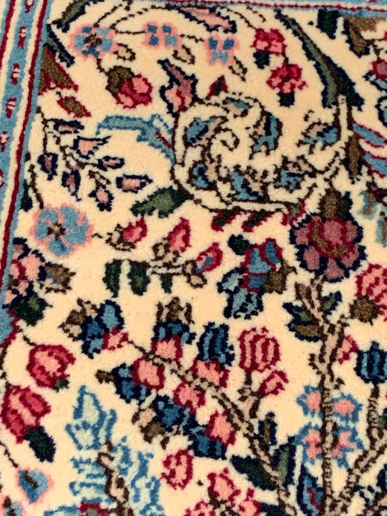 まるで花畑を広げたかような華やかな印象に。見応えのあるケルマンのデザインは、タペストリーとしてお楽しみ頂くことも多いです。タペストリー加工も併せてお承り致します。