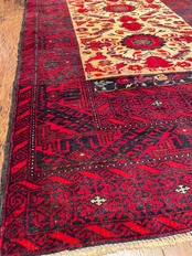 バルーチ族の絨毯は個性的な印象ですが、西イランの部族絨毯やキリムはもちろん、都市で織られた正統派のペルシャ絨毯にも良く合い、インテリアを選ばない不思議な魅力がある絨毯です。織り上がりは1cm程度でそれほど分厚くはありませんが、しっかりとしており織り目が詰まった絨毯です。