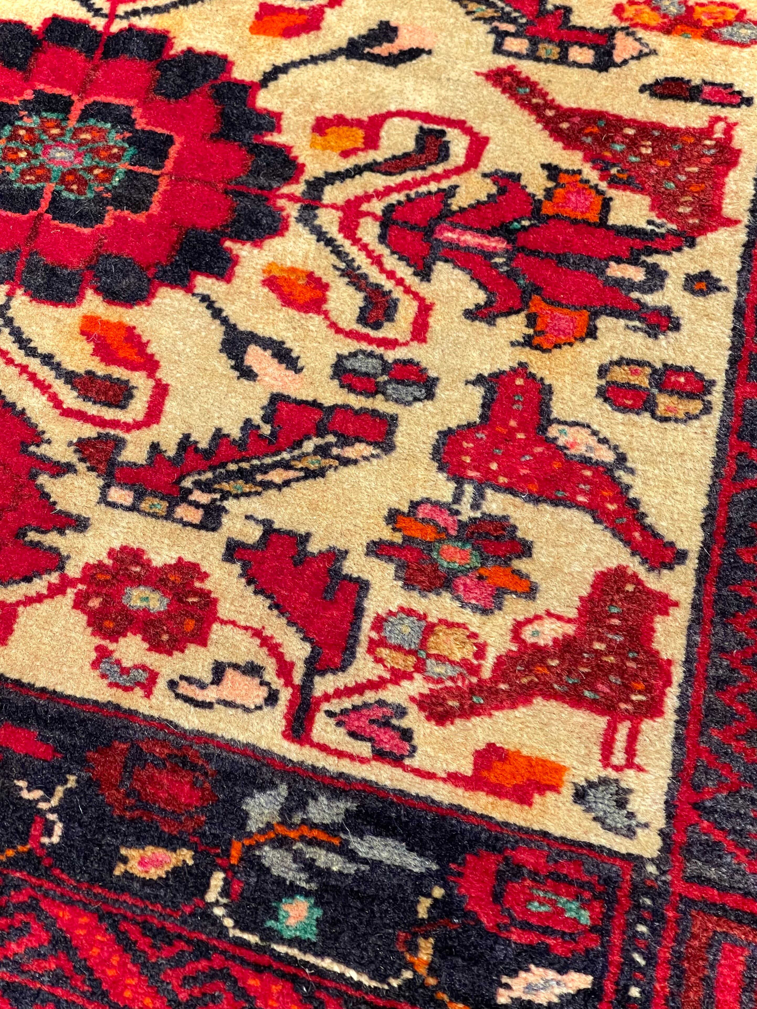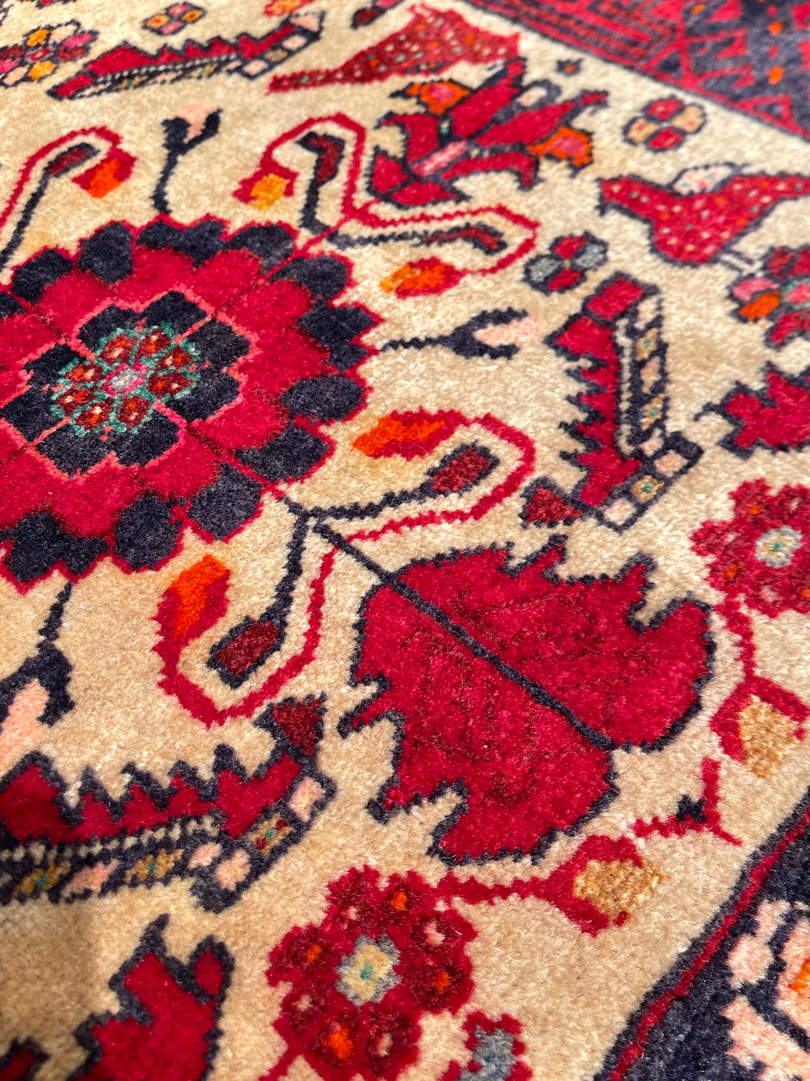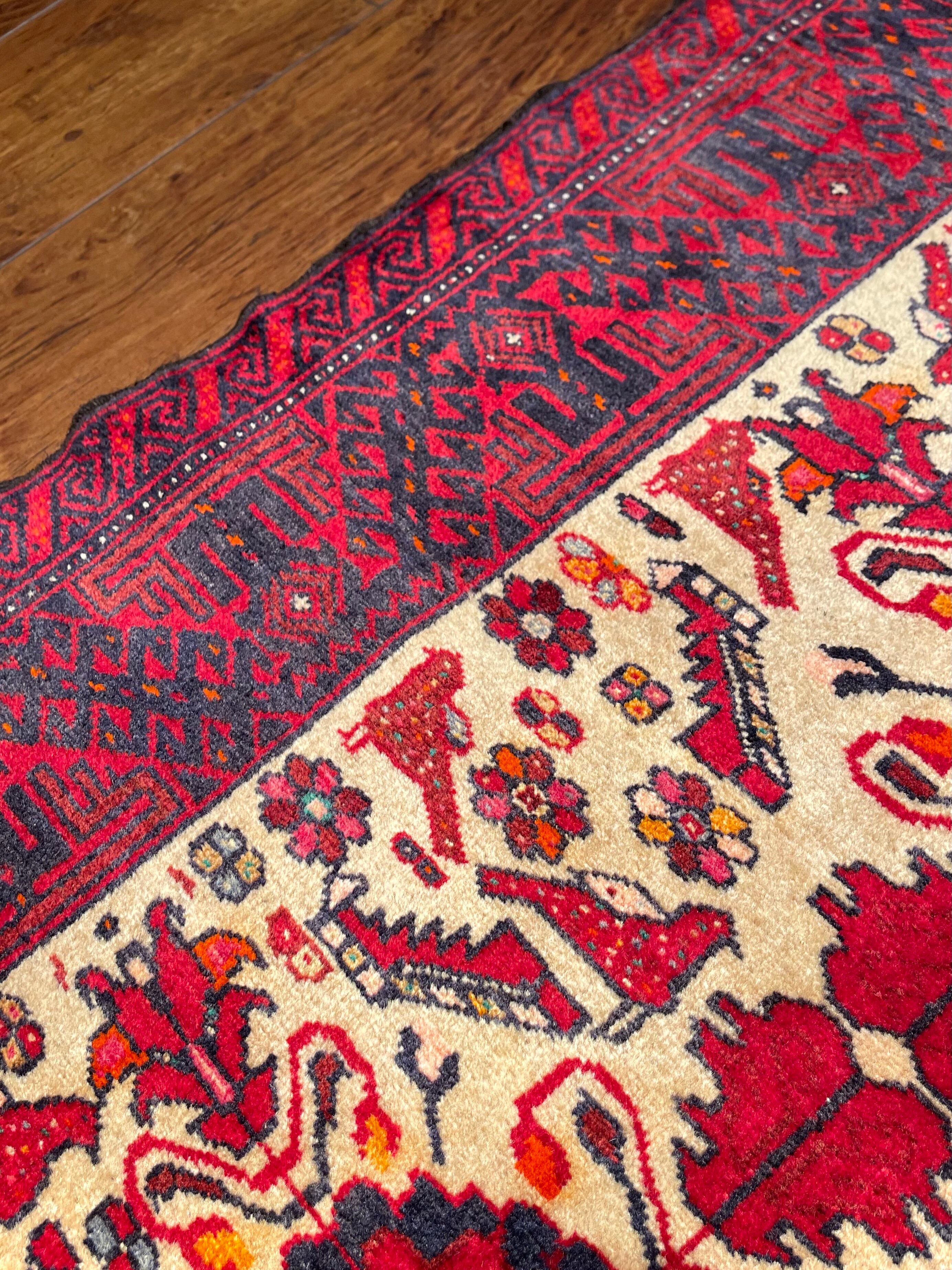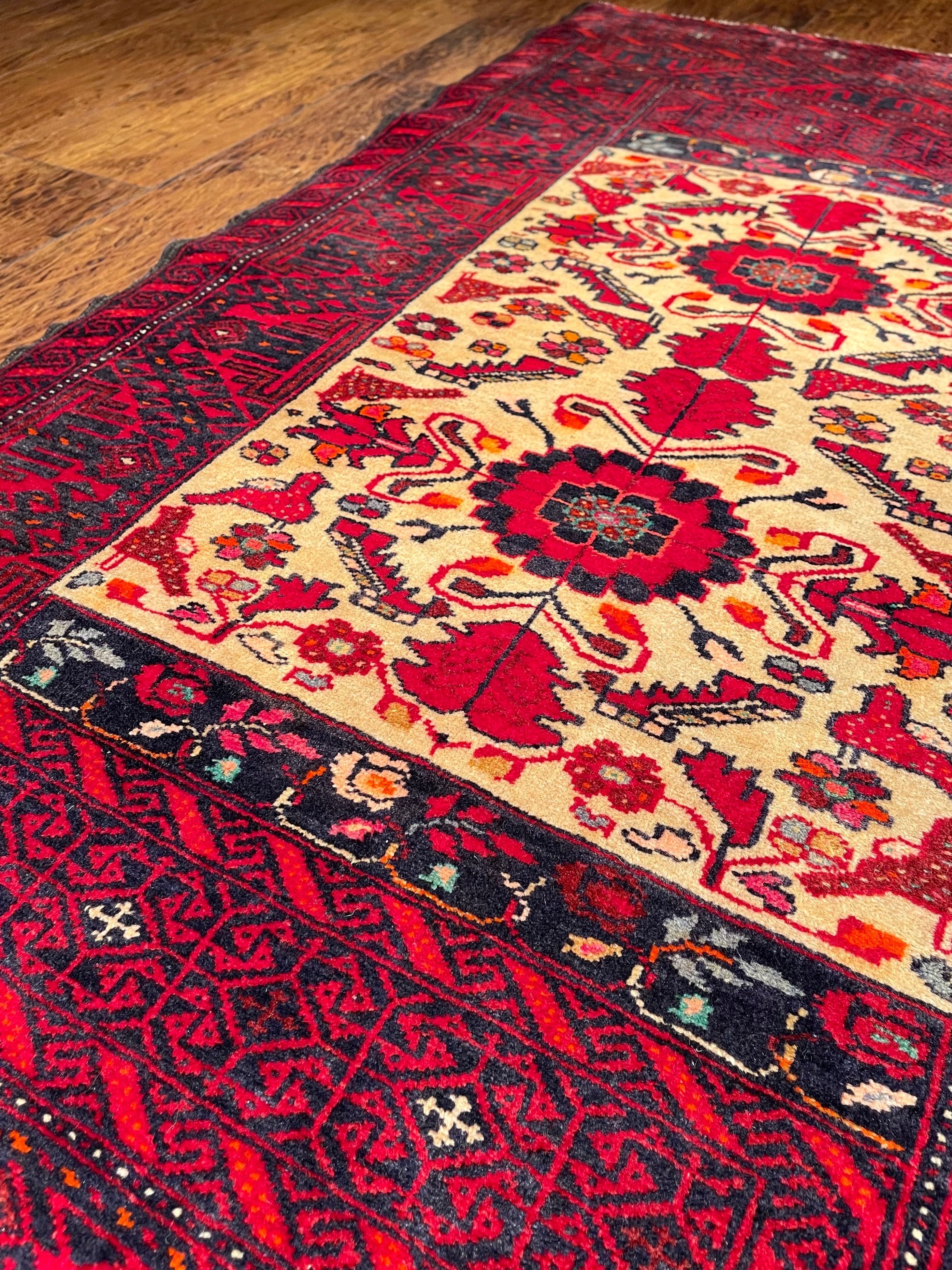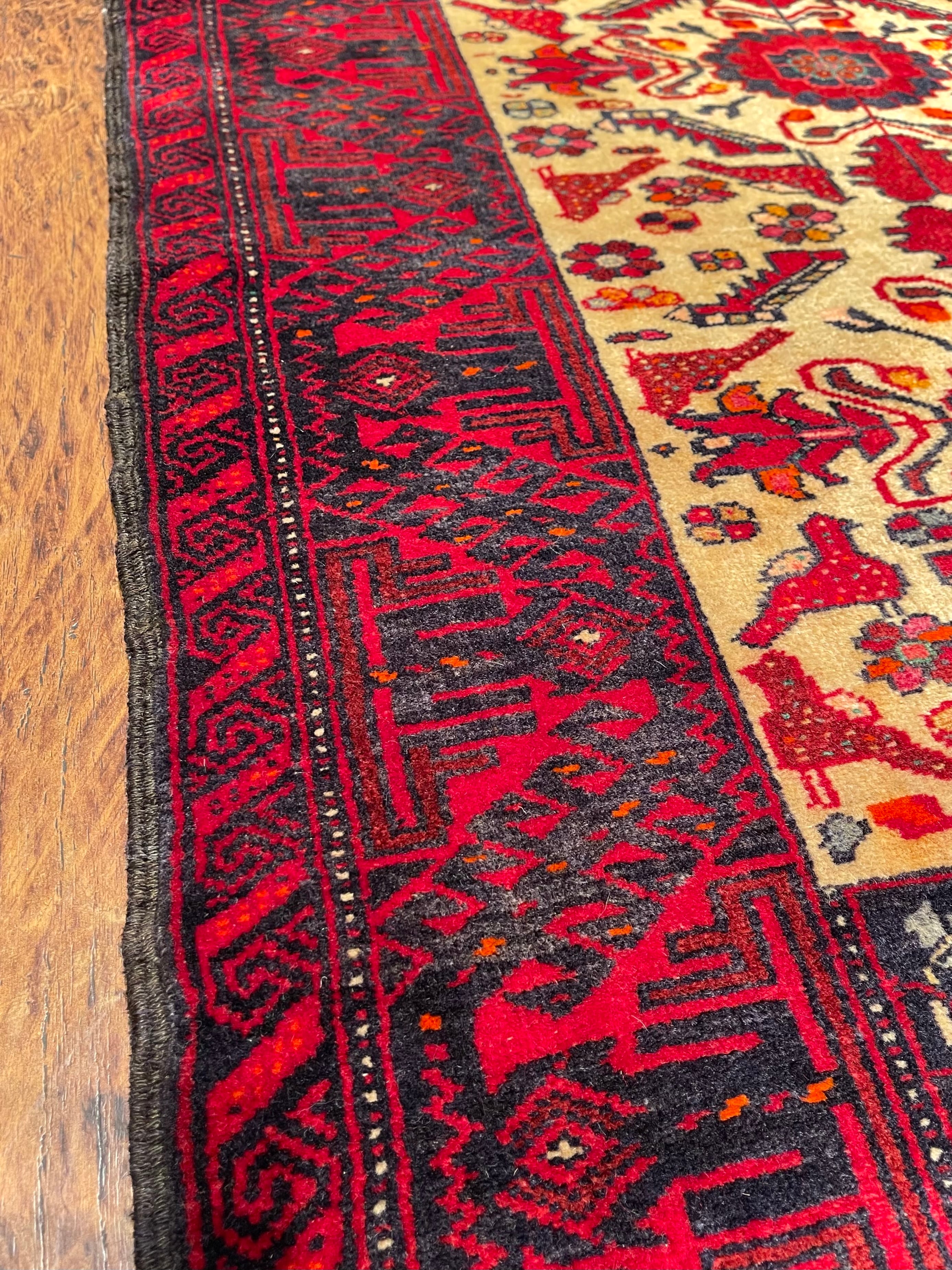バルーチ族は東イラン、アフガニスタン、パキスタンに渡り住んでいる部族ですが、絨毯を織っているのは東イランと西アフガニスタンにいるバルーチ族だと言われています。バルーチ族の絨毯は重厚な色合いのものが多く、東洋的で渋い印象ですが、実は幾何学紋様へと姿を変えた動物柄が多く含まれています。
