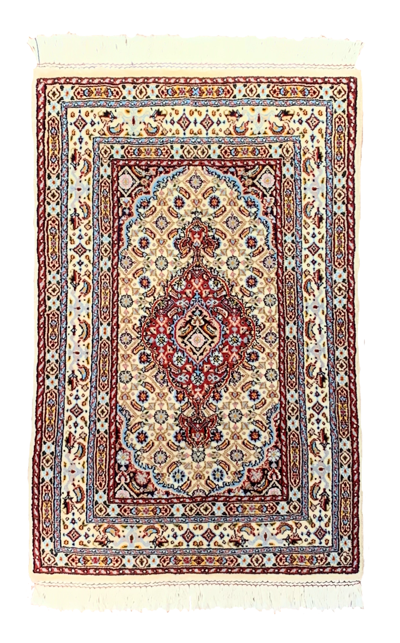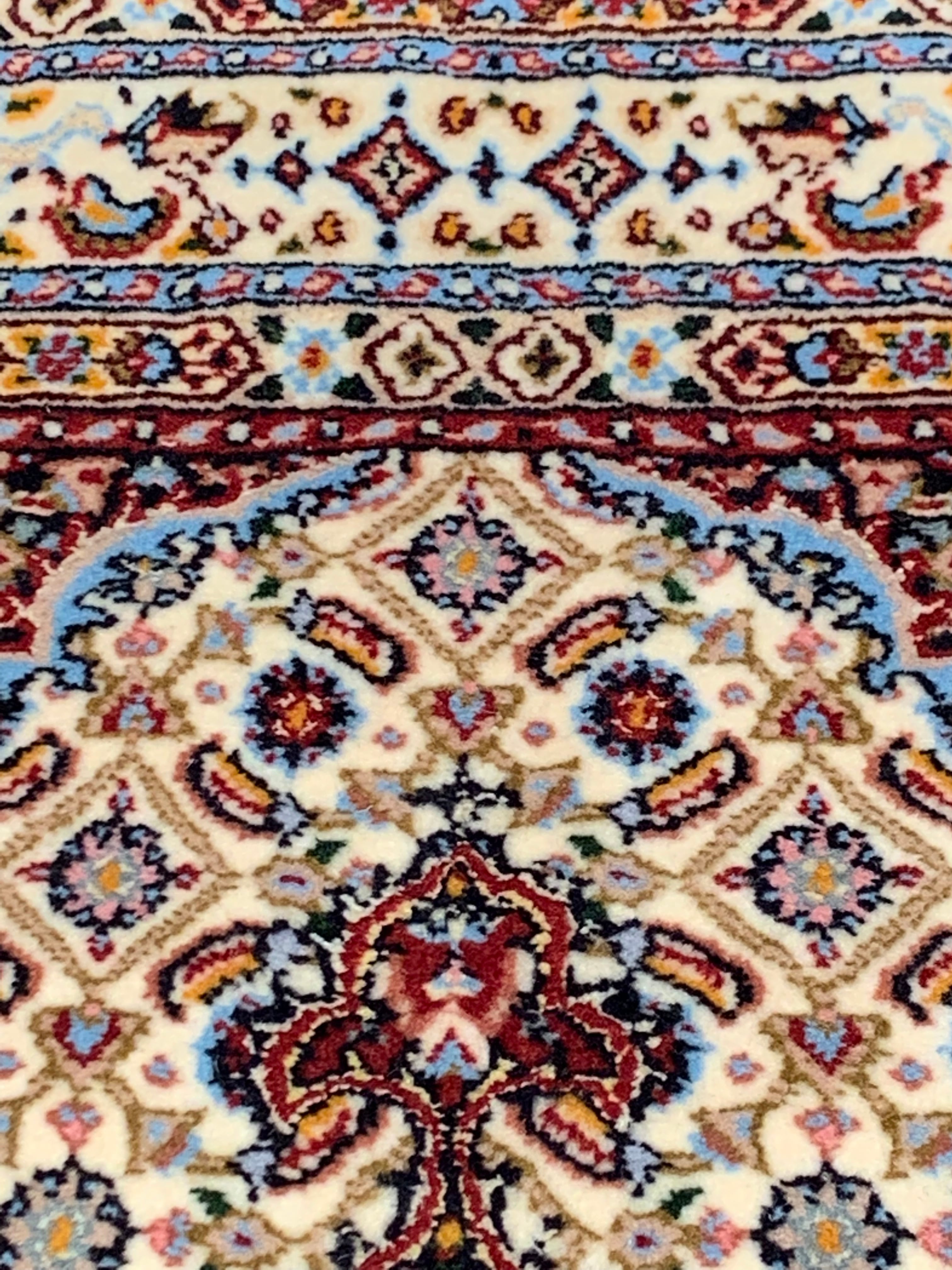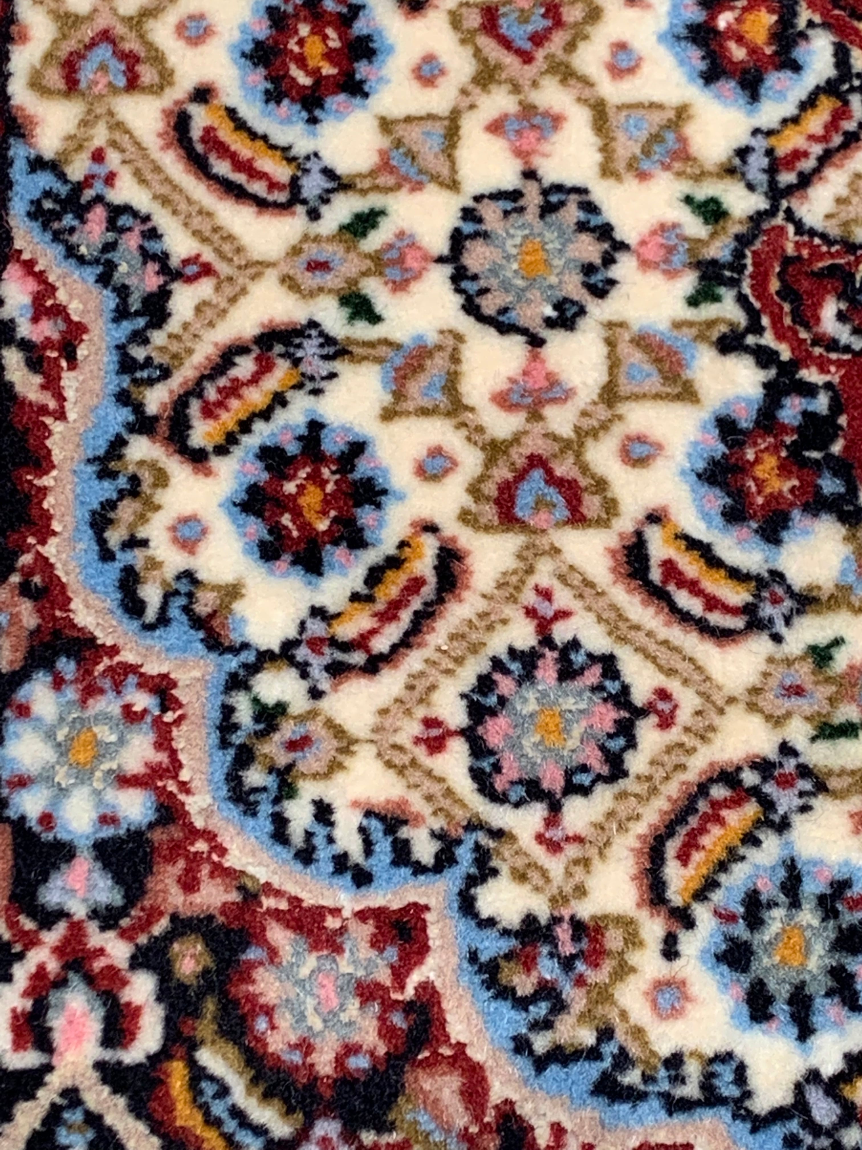 細やかな連続紋様が基調部分を埋め尽くす「マヒ」と呼ばれるデザインで織られています。マヒは北西イランのタブリーズでも織られている、ペルシャ絨毯を代表するデザインの一つです。ビルジャンドのタイプは中央のメダリオンが丸みを帯びていて柔らかな印象があります。ウールを基調とし、更にシルクが織り混ぜられていることから、デザインをより立体的・躍動的に見せています。空間を選ばず馴染みやすく、当店では和室などに合わせて頂くことも多い産地です。