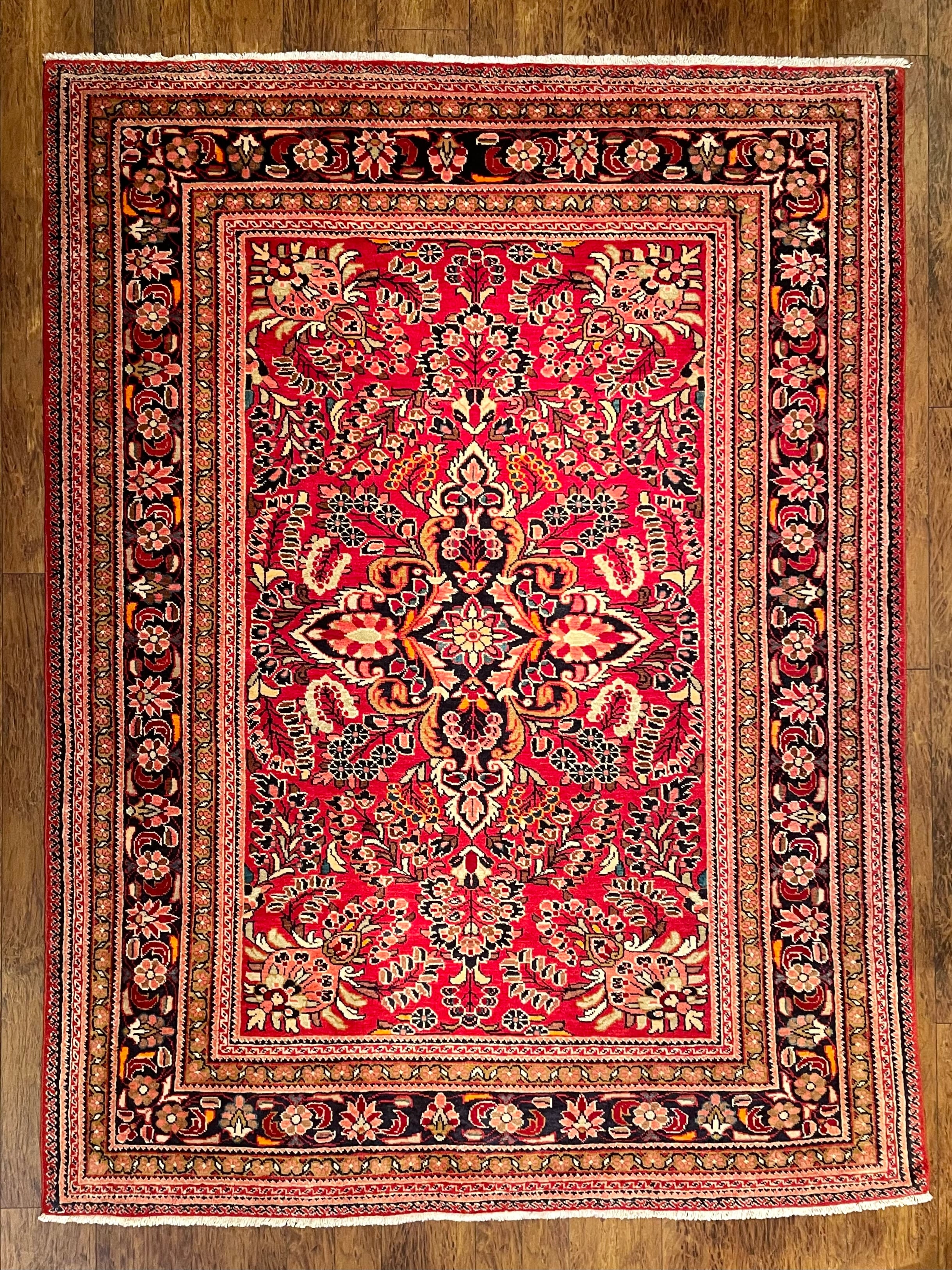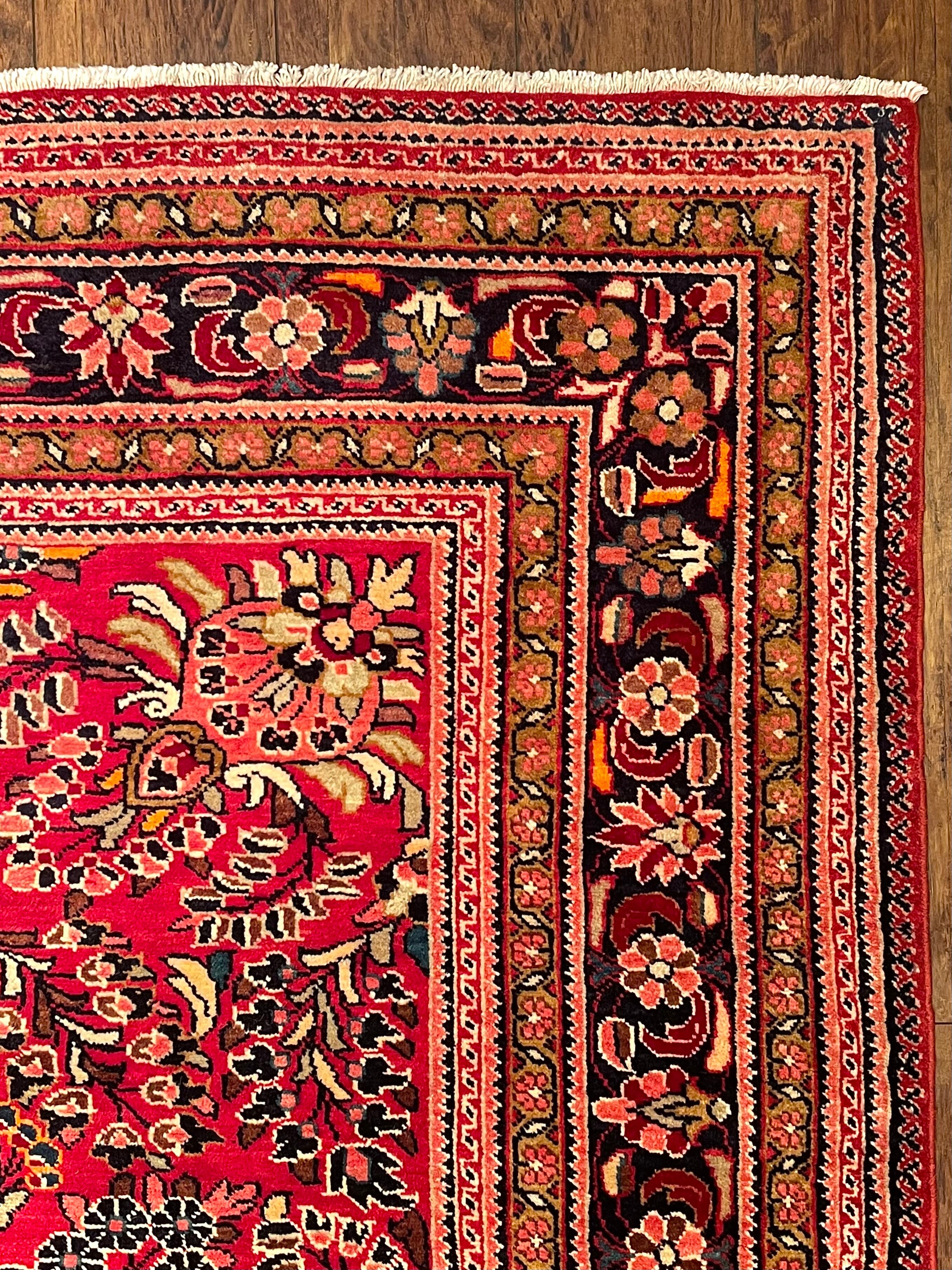 赤いフィールドに大ぶりの花々が配されたデザイン。ペルシャ絨毯でお馴染みのアラベスク紋様が「ない!」ことに気がつきましたか?1900年代初期から織られるようになり、この地域で主流のデザインとなりました。