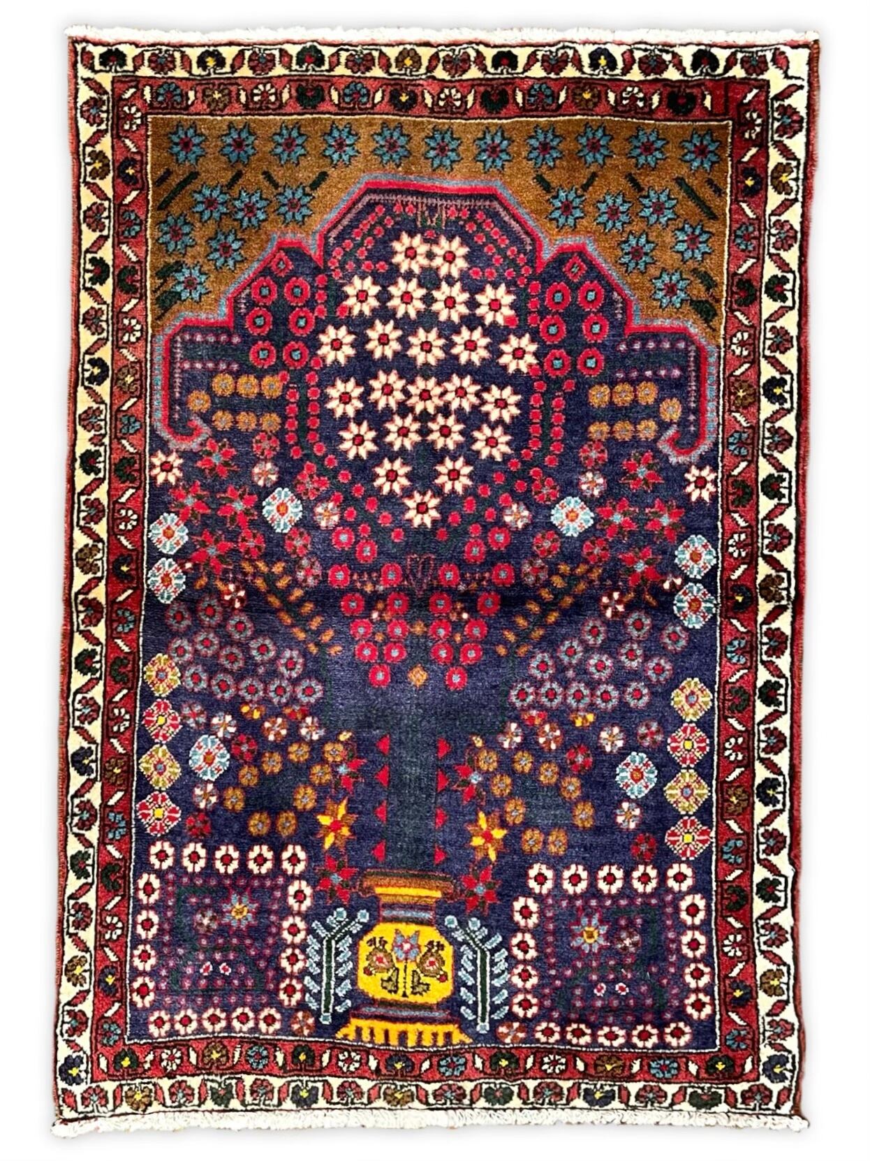 南イランのシャハレババークには、定住するアフシャール族系の人々が多く暮らしています。アフシャール族のルーツはトルキャマン族で、11-12世紀のセルジューク朝期に、北西イランとアナトリア付近に移動してきたことが始まりと言われています。王朝が変わり体勢が変わる毎に、強制移住や分裂を繰り返し、集住エリアが変わっていきました。このような移動の背景から、各地を転々としてきたアフシャール族の絨毯のデザインのバリエーションは幅広く、大きく分けて特徴的なものとしては ①菱形のメダリオン ②花瓶の連続紋様 ③スプレーフラワーなどがあります。