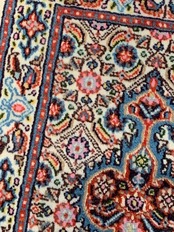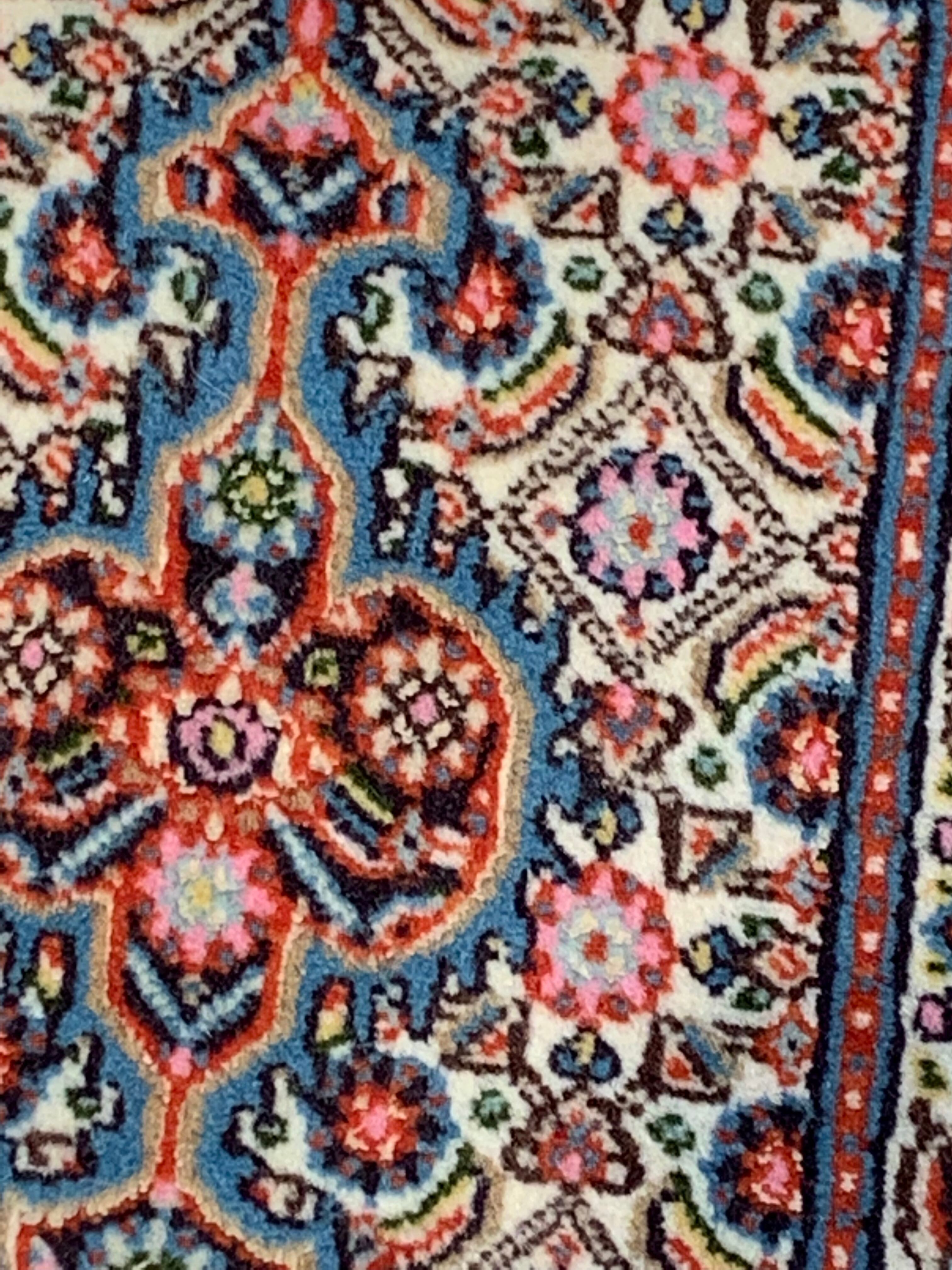 細やかな連続紋様が基調部分を埋め尽くす「マヒ」と呼ばれるデザインで織られています。マヒは北西イランのタブリーズでも織られている、ペルシャ絨毯を代表するデザインの一つです。ビルジャンドのタイプは中央のメダリオンが丸みを帯びていて柔らかな印象があります。ウールを基調とし、更にシルクが織り混ぜられていることから、デザインをより立体的・躍動的に見せています。空間を選ばず馴染みやすく、当店では和室などに合わせて頂くことも多い産地です。