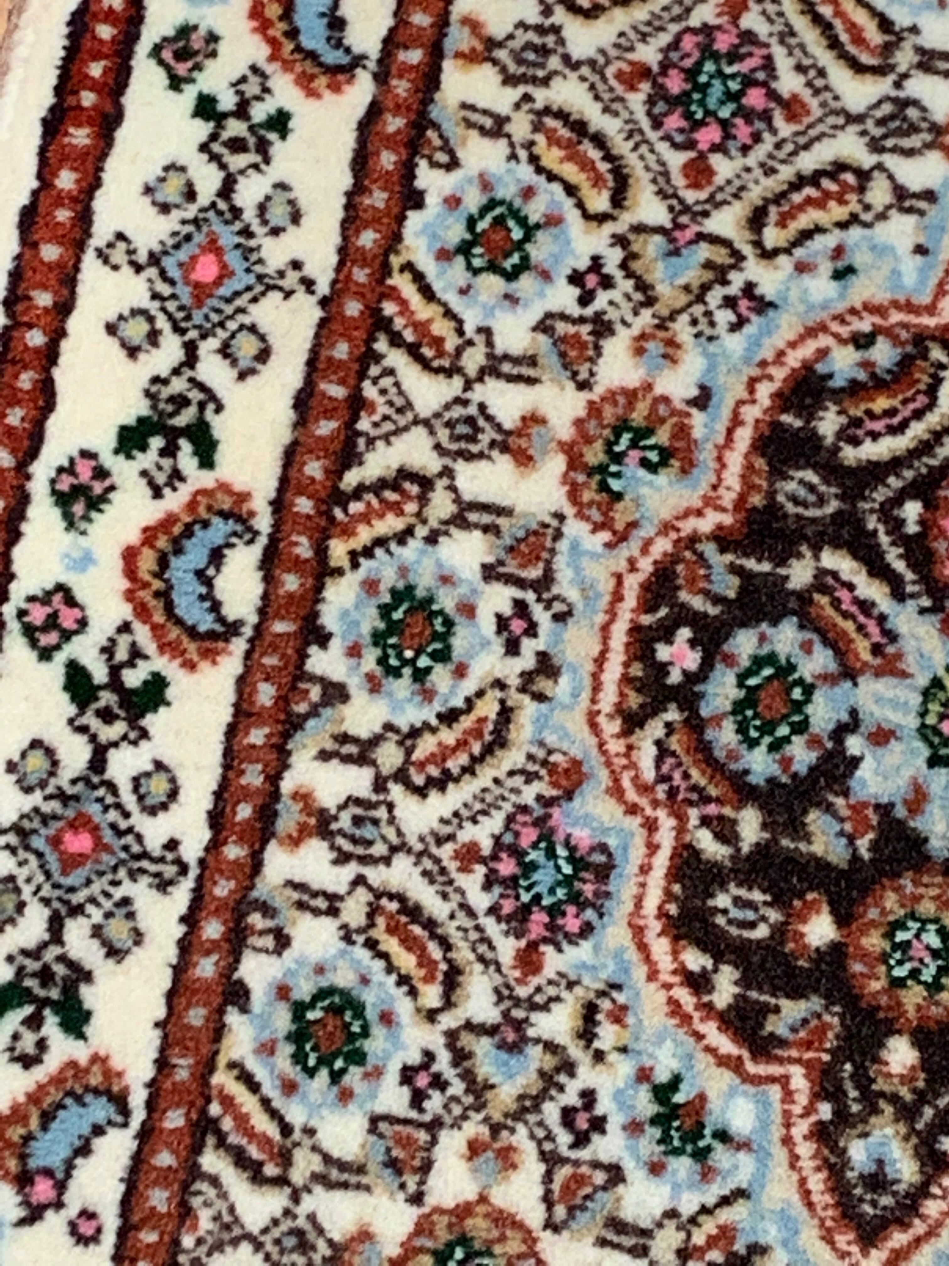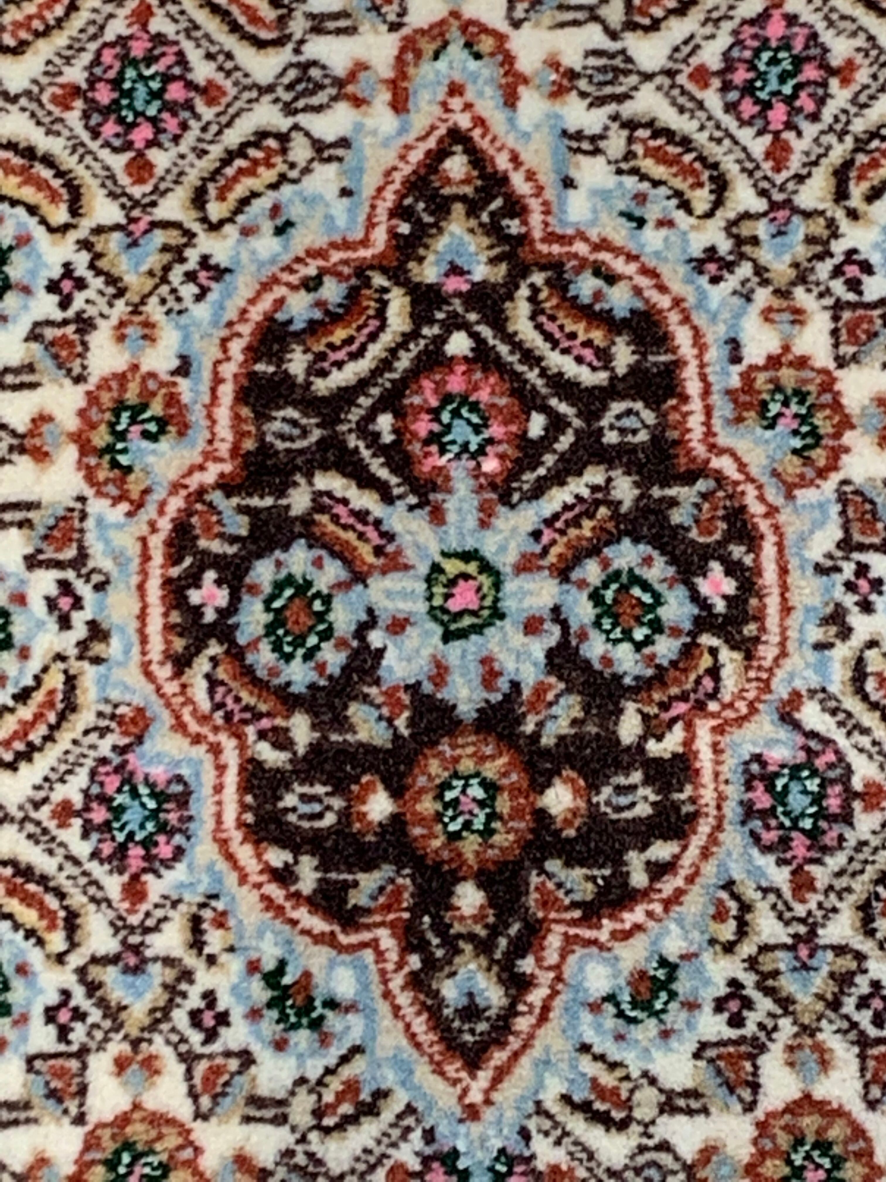 細やかな連続紋様が基調部分を埋め尽くす「マヒ」と呼ばれるデザインで織られています。マヒは北西イランのタブリーズでも織られている、ペルシャ絨毯を代表するデザインの一つです。ビルジャンドのタイプは中央のメダリオンが丸みを帯びていて柔らかな印象があります。ウールを基調とし、更にシルクが織り混ぜられていることから、デザインをより立体的・躍動的に見せています。空間を選ばず馴染みやすく、当店では和室などに合わせて頂くことも多い産地です。