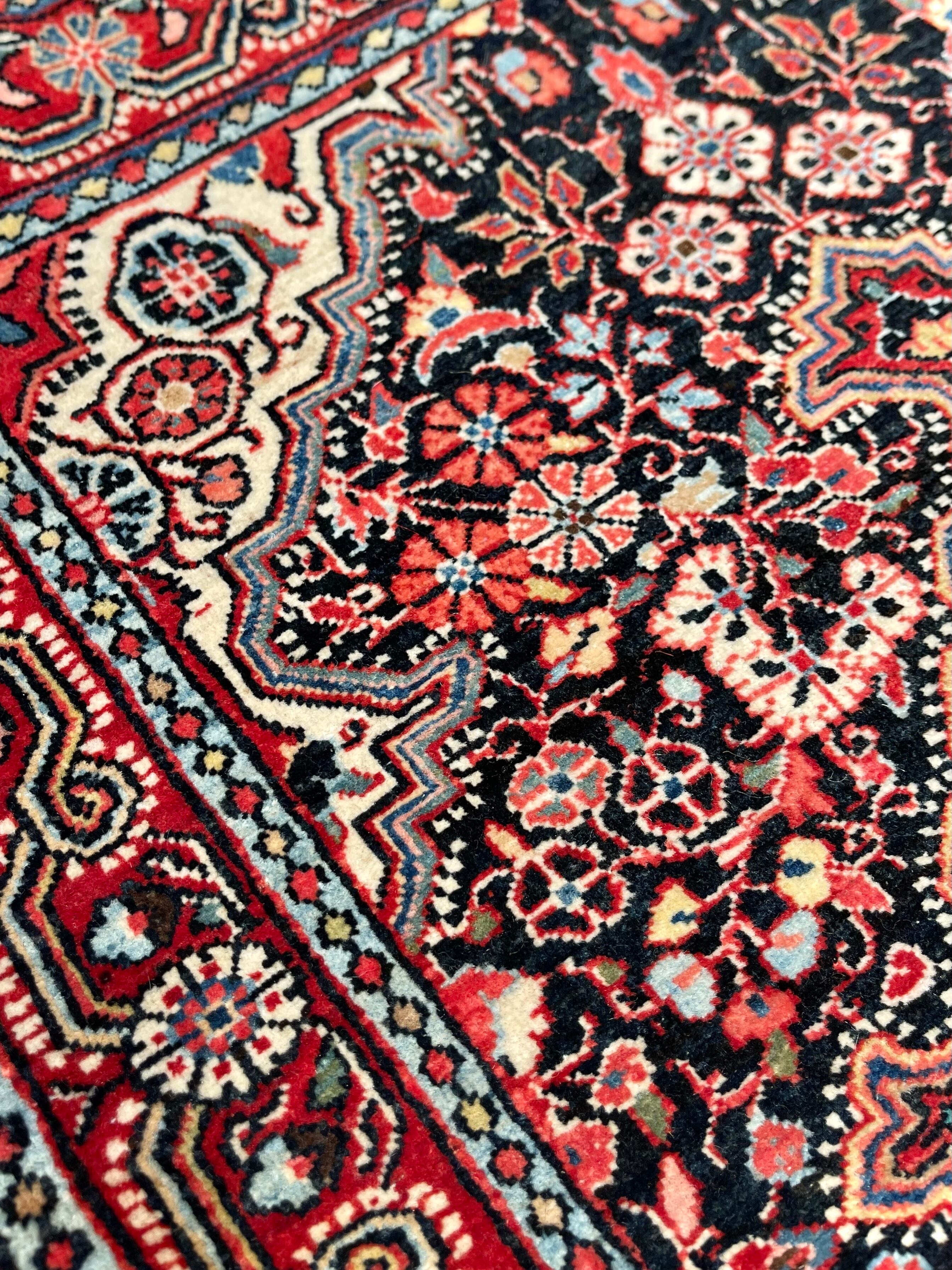 上質なウールで織られた、非常に目の詰まったジョーザンのオールド絨毯です。文字通り隅から隅まで、基調部分からフレームに渡るまでをぎっしりと埋め尽くす、花々のデザインが特徴的な産地です。これは、近隣のサルークと呼ばれる産地のデザインの影響を受けているとされています。