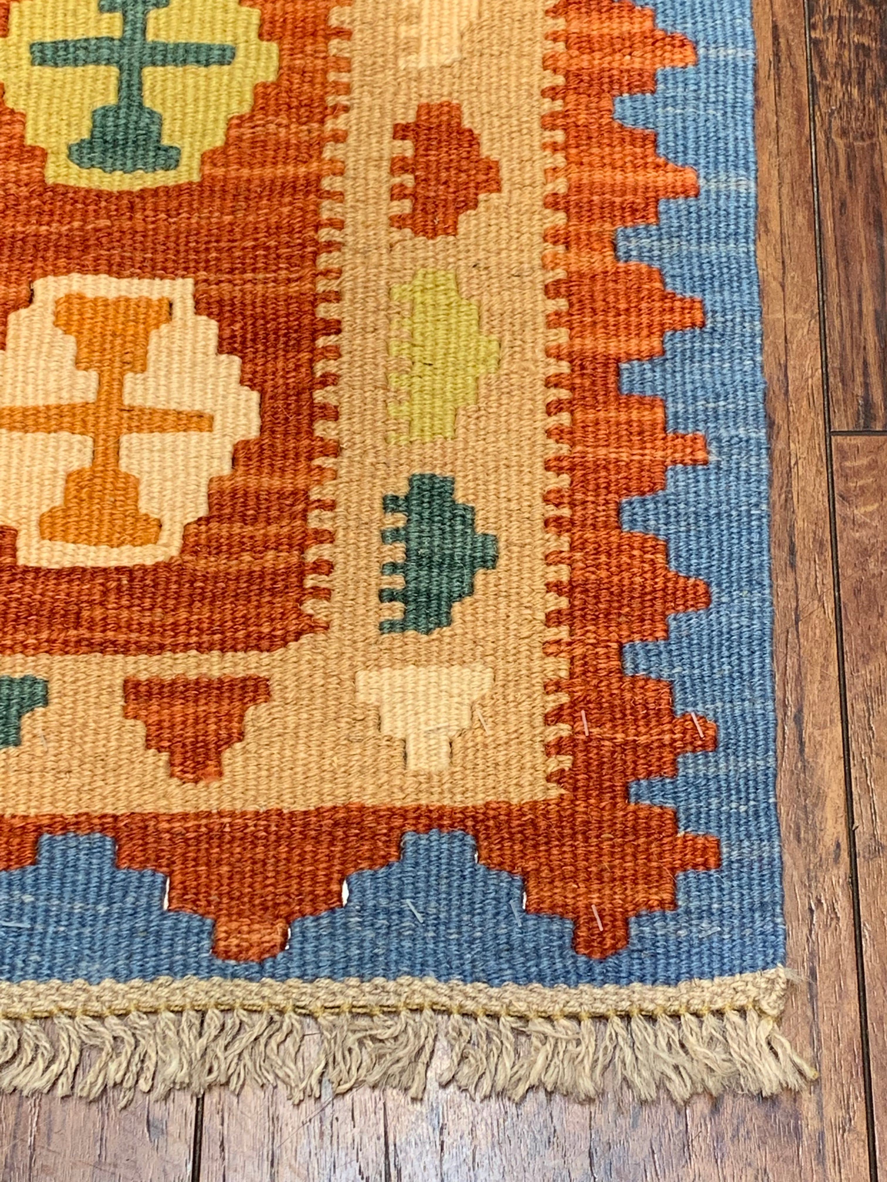 薄い織り上がりのキリムですが、ウールで織られているので、床の冷たさを感じさせず、また暑い季節でもスッキリとしたお使い心地で、オールシーズン活躍します。