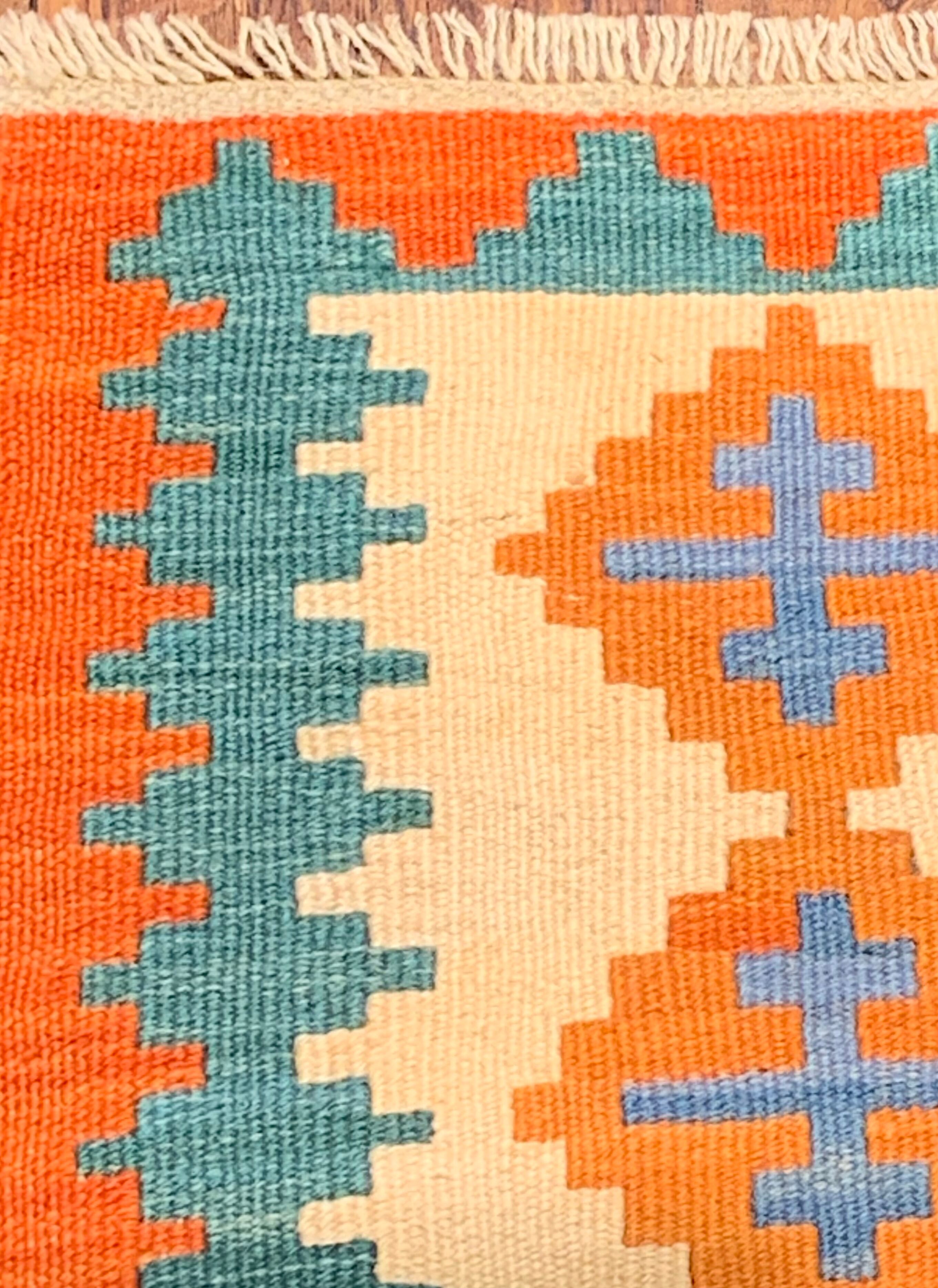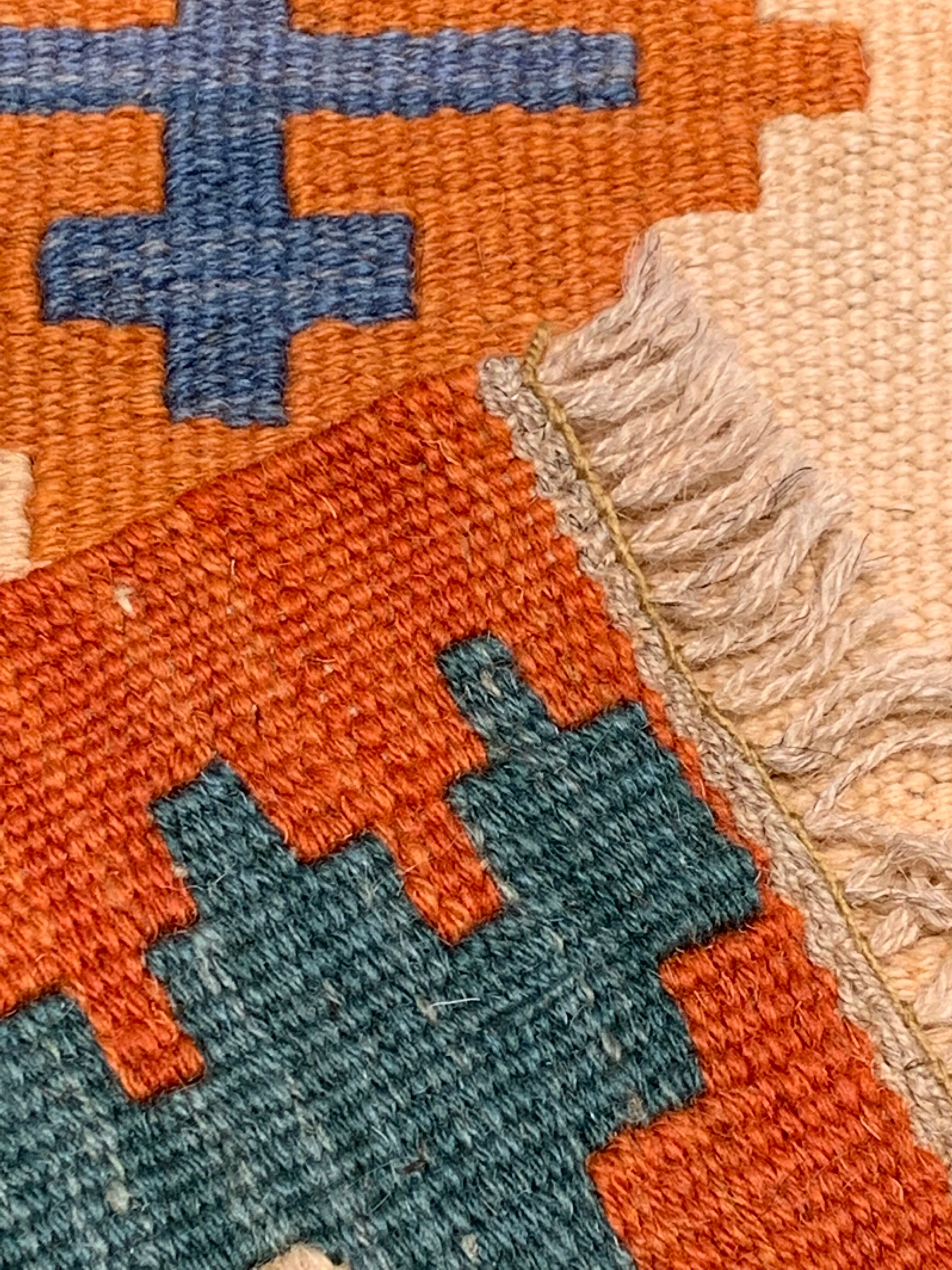 薄い織り上がりのキリムですが、ウールで織られているので、床の冷たさを感じさせず、また暑い季節でもスッキリとしたお使い心地で、オールシーズン活躍します。