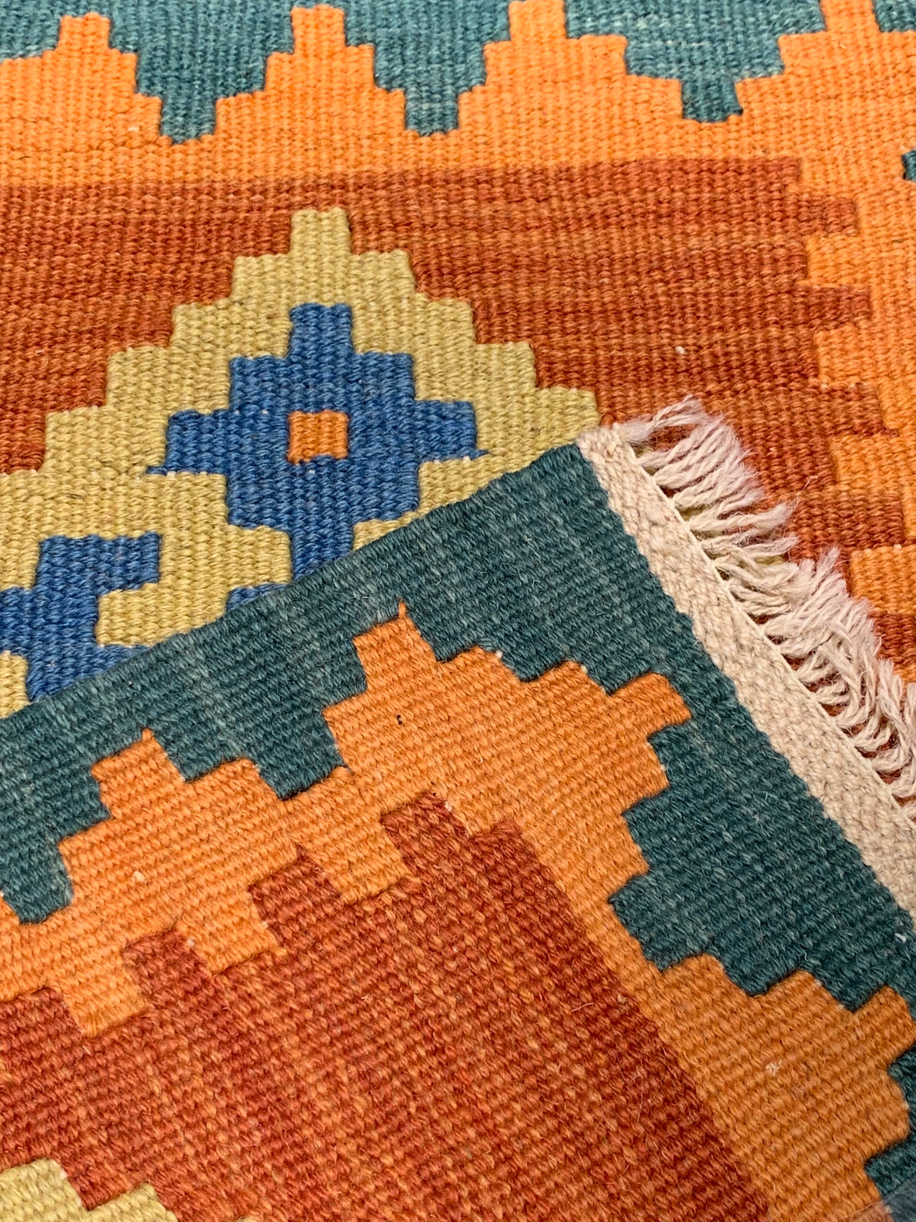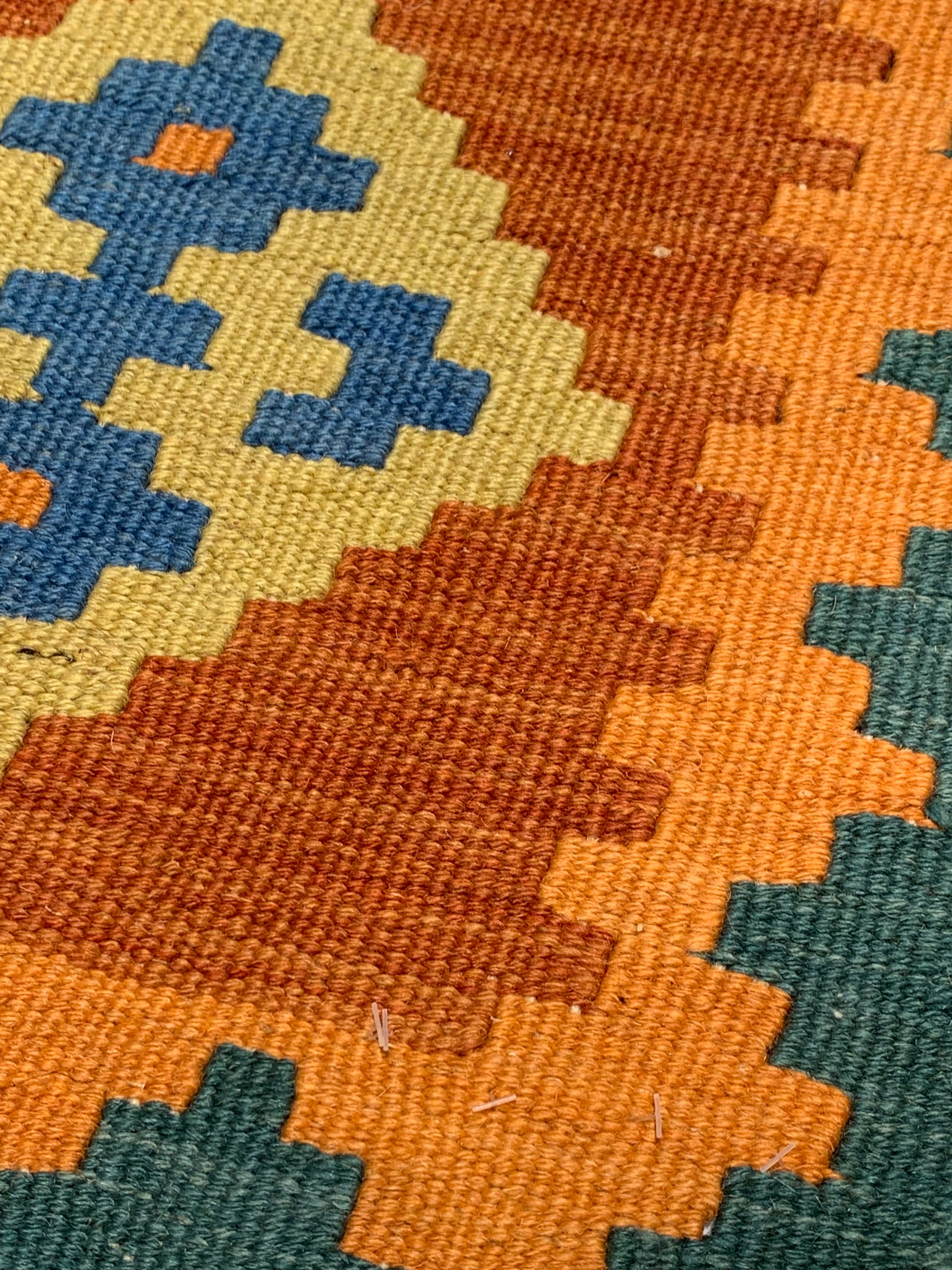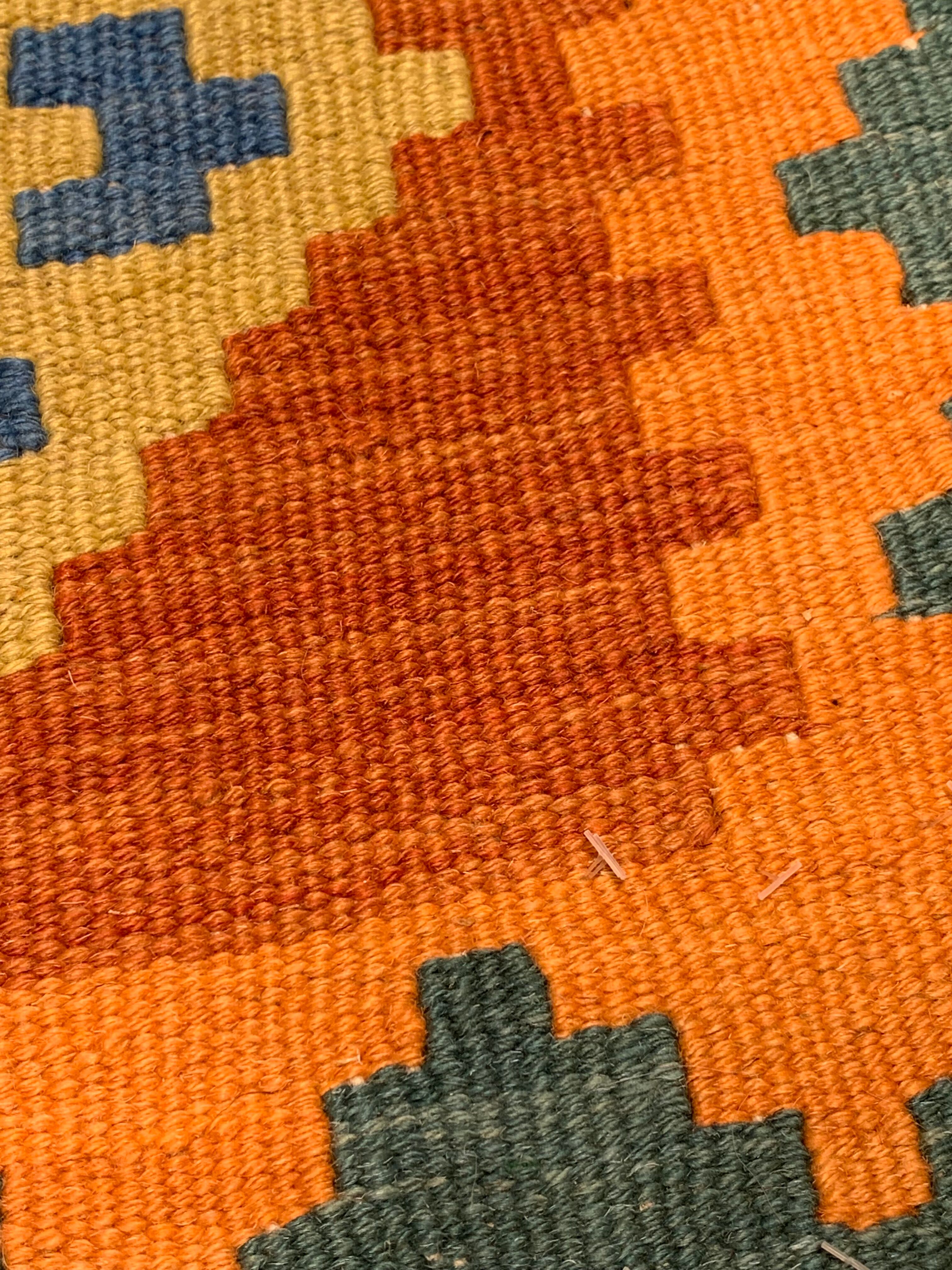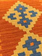 薄い織り上がりのキリムですが、ウールで織られているので、床の冷たさを感じさせず、また暑い季節でもスッキリとしたお使い心地で、オールシーズン活躍します。