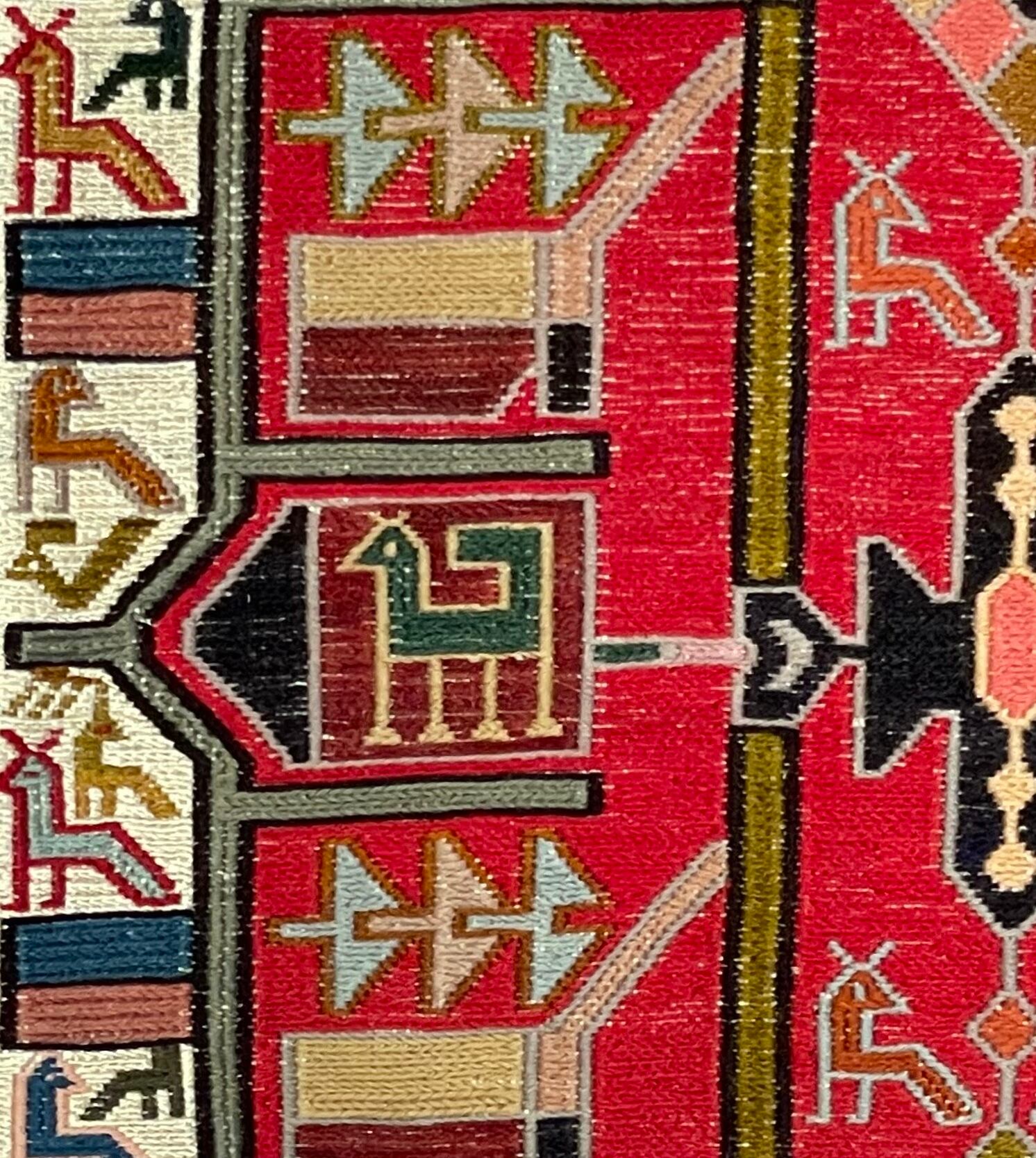 細かな織りの為、デザインが細かくたくさんの色が使われています。そのためそれほど強い色の印象がなく、既にお使いのクッションや周りのカーテンやラグ、他のインテリアにも馴染みやすいです。