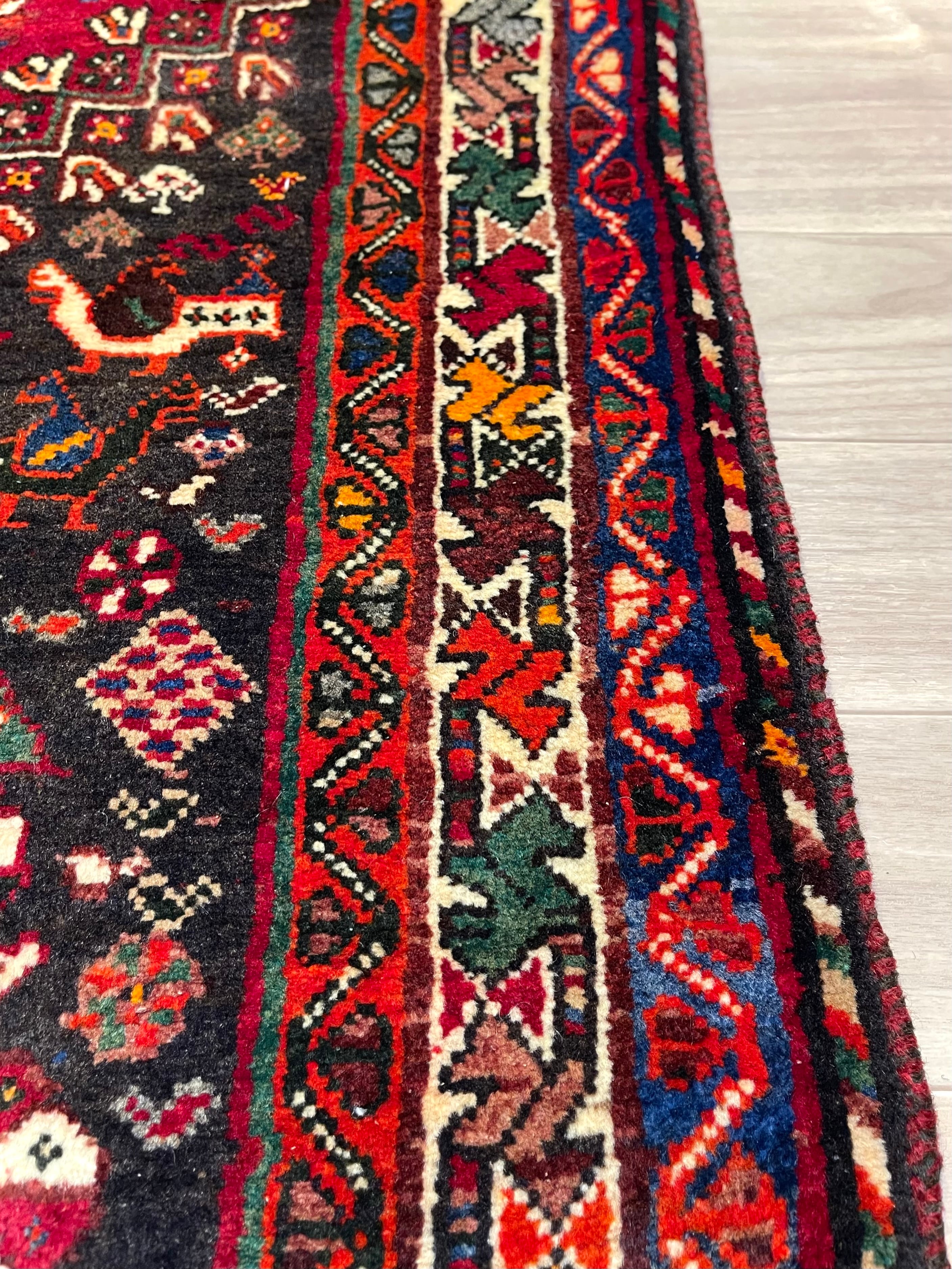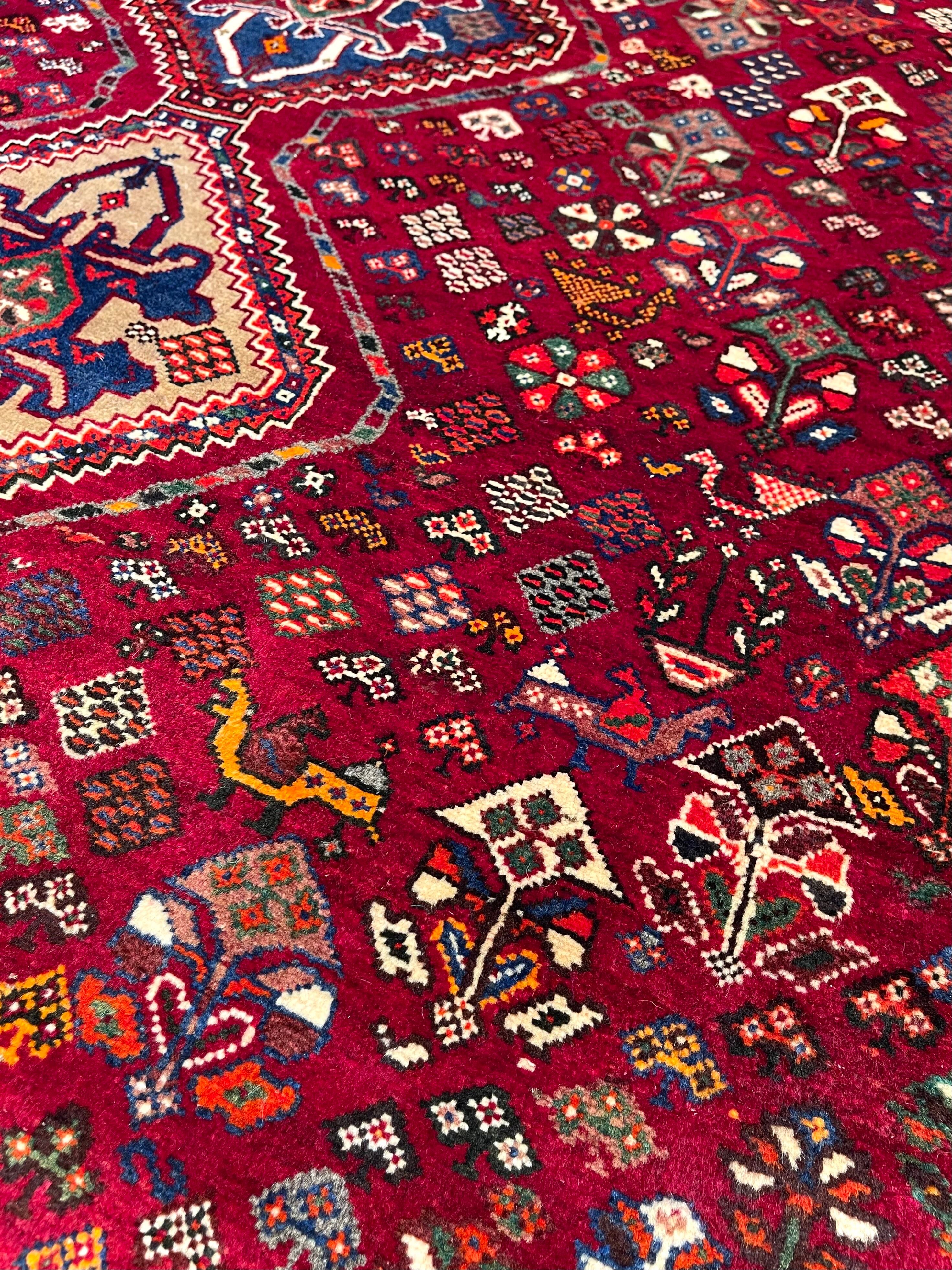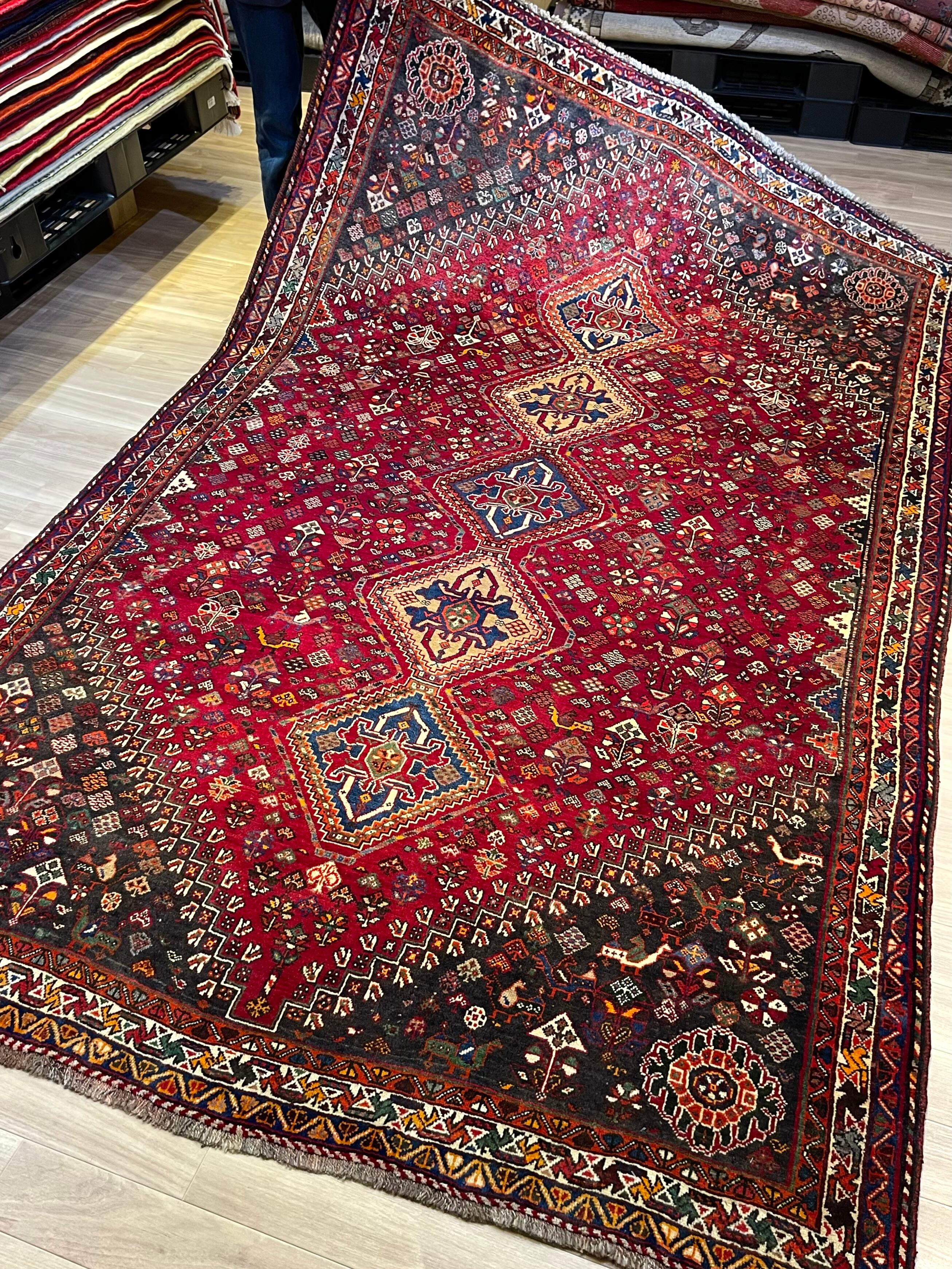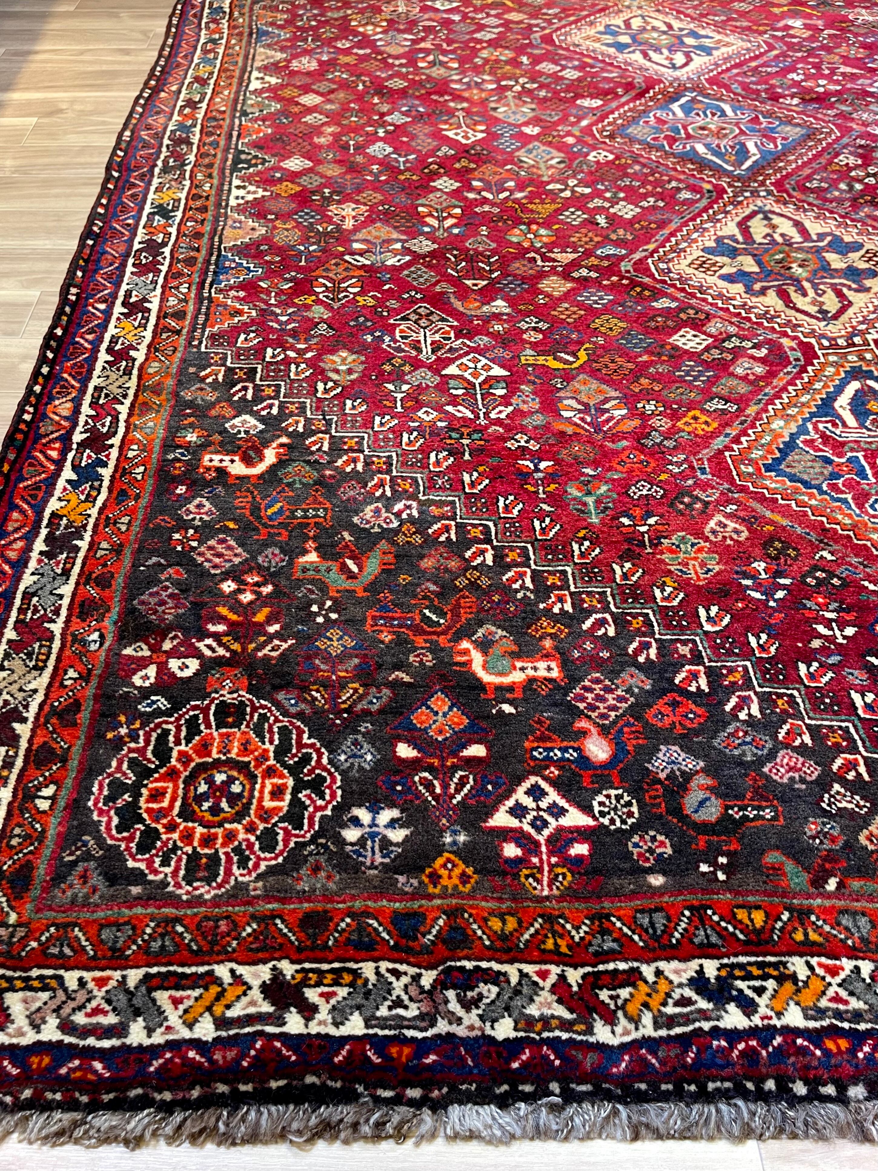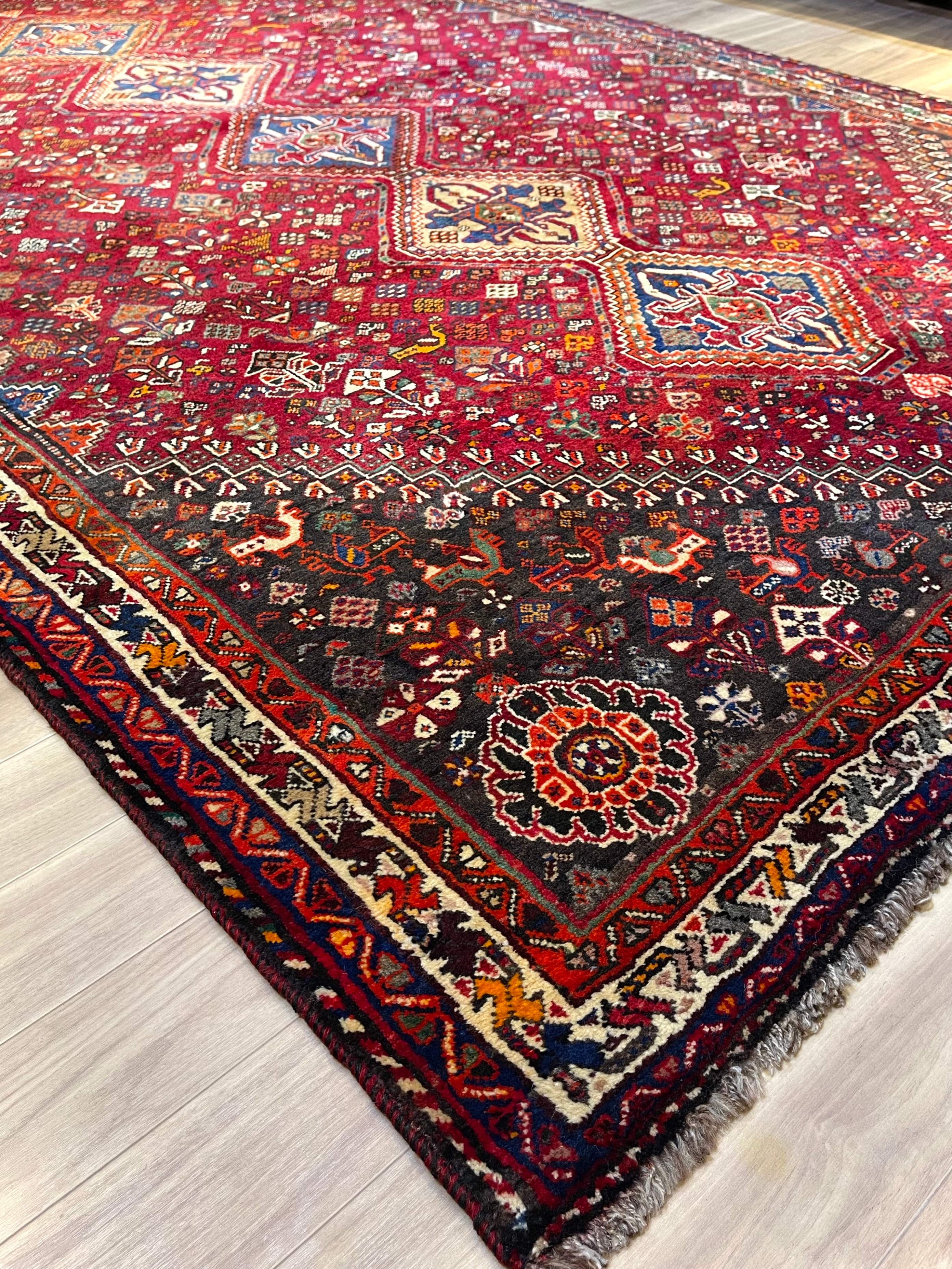 南イランのアバデで織られる絨毯は、菱形で区切られており、絨毯の中心と四隅の合わせて5つのメダリオンで構成される「へバトゥル」と呼ばれるデザインが主流です。基調部分を鳥や馬などといった動物や星、花・樹木などの紋様が隙間なく埋め尽くしています。この地域は遊牧をやめて定住したカシュガイ族の人々が多く暮らすことから、こうした紋様からはギャッベにも共通するようなものが多く見られることも特徴です。