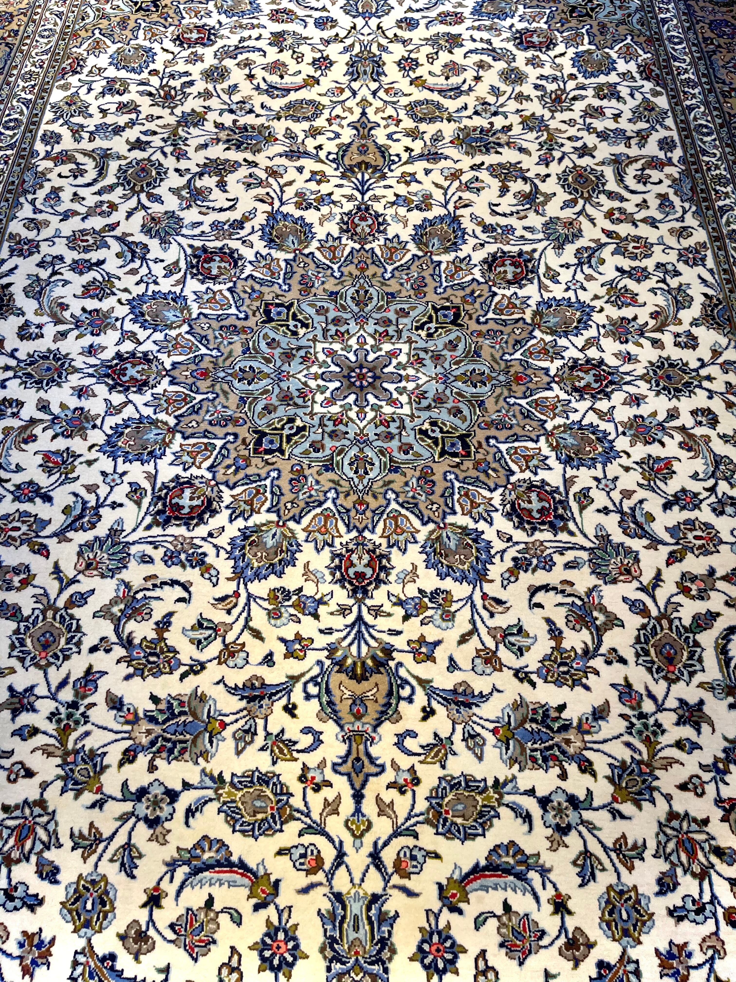カシャーンは極度に乾燥し、農耕に適さない地理的背景から、古くから工芸品の生産に注力してきた街です。現在のカシャーンの絨毯は赤、又はベージュを基調としたものが主流で、中央のメダリオンが縦に長い形状をしていることが多いです。カシャーンの絨毯織りの技術はユネスコの無形文化遺産にも登録されています。