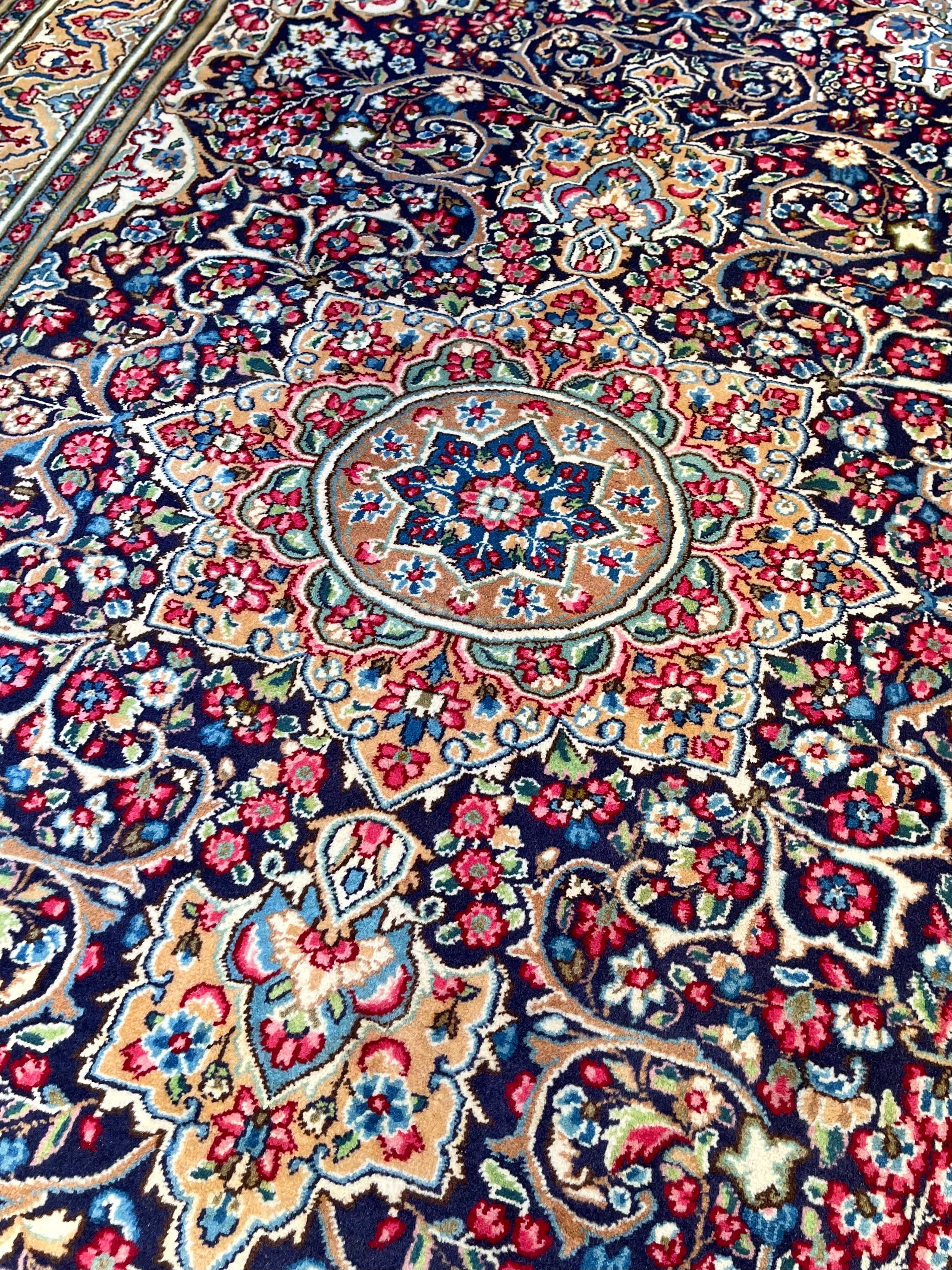 まるで花畑を広げたかような華やかな印象に。見応えのあるケルマンのデザインは、タペストリーとしてお楽しみ頂くことも多いです。タペストリー加工も併せてお承り致します。