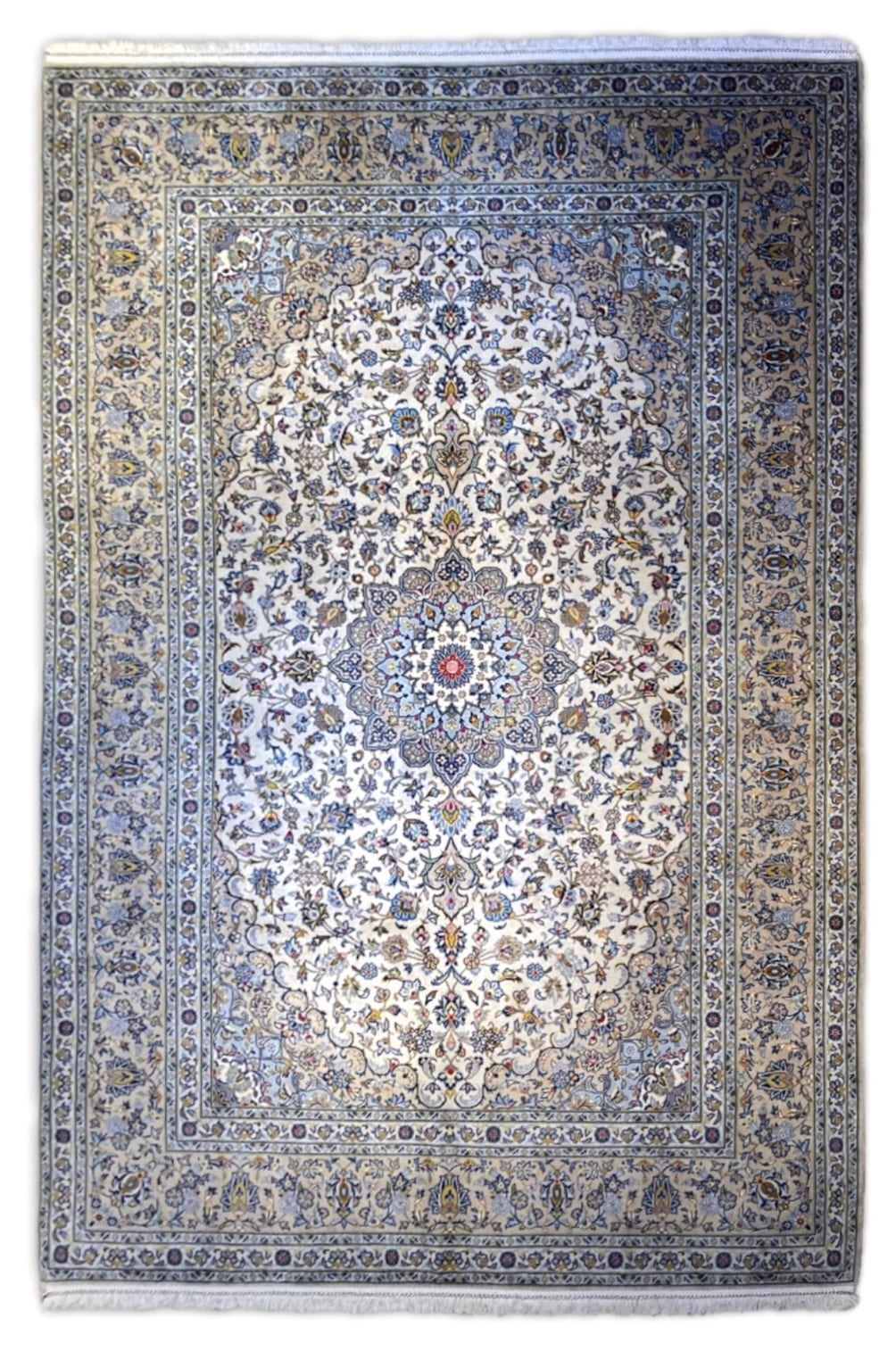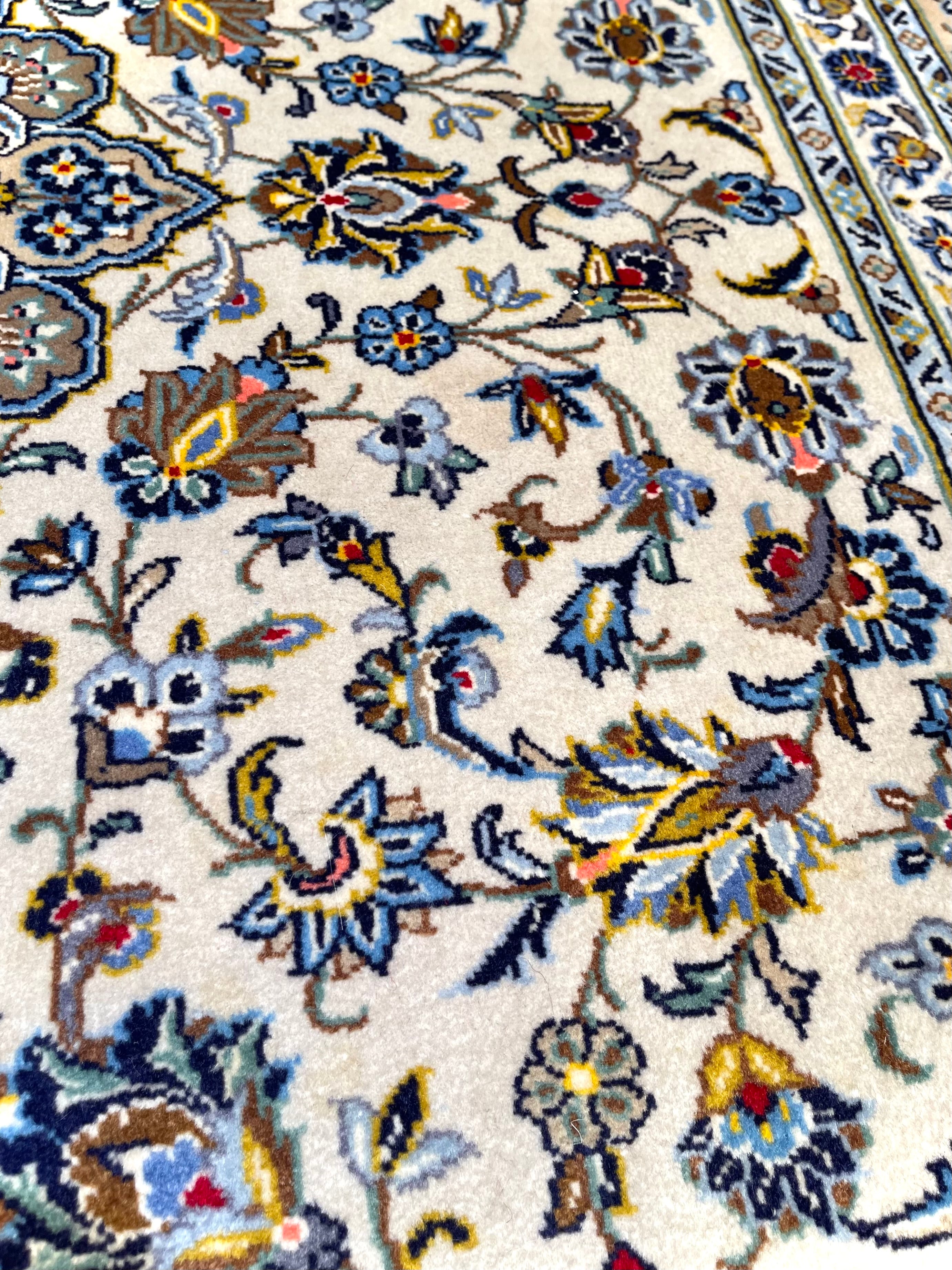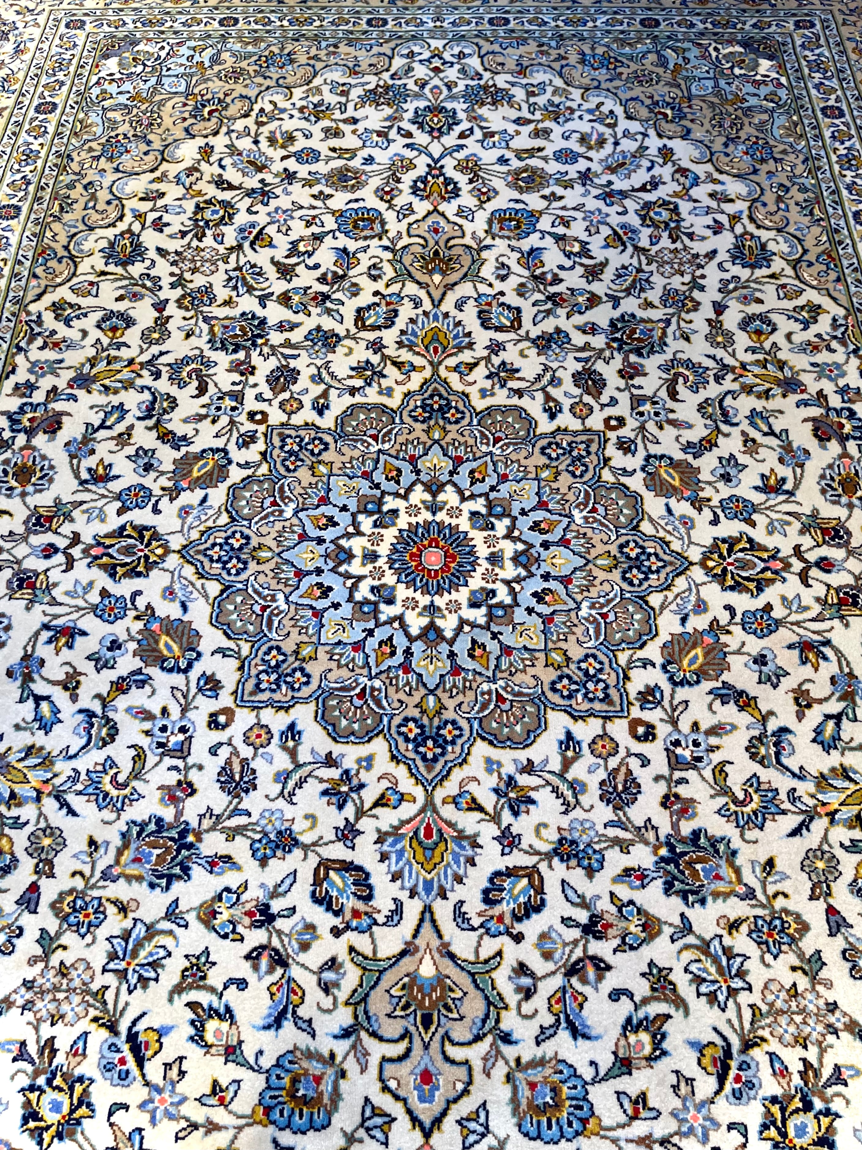 カシャーンは極度に乾燥し、農耕に適さない地理的背景から、古くから工芸品の生産に注力してきた街です。現在のカシャーンの絨毯は赤、又はベージュを基調としたものが主流で、中央のメダリオンが縦に長い形状をしていることが多いです。カシャーンの絨毯織りの技術はユネスコの無形文化遺産にも登録されています。