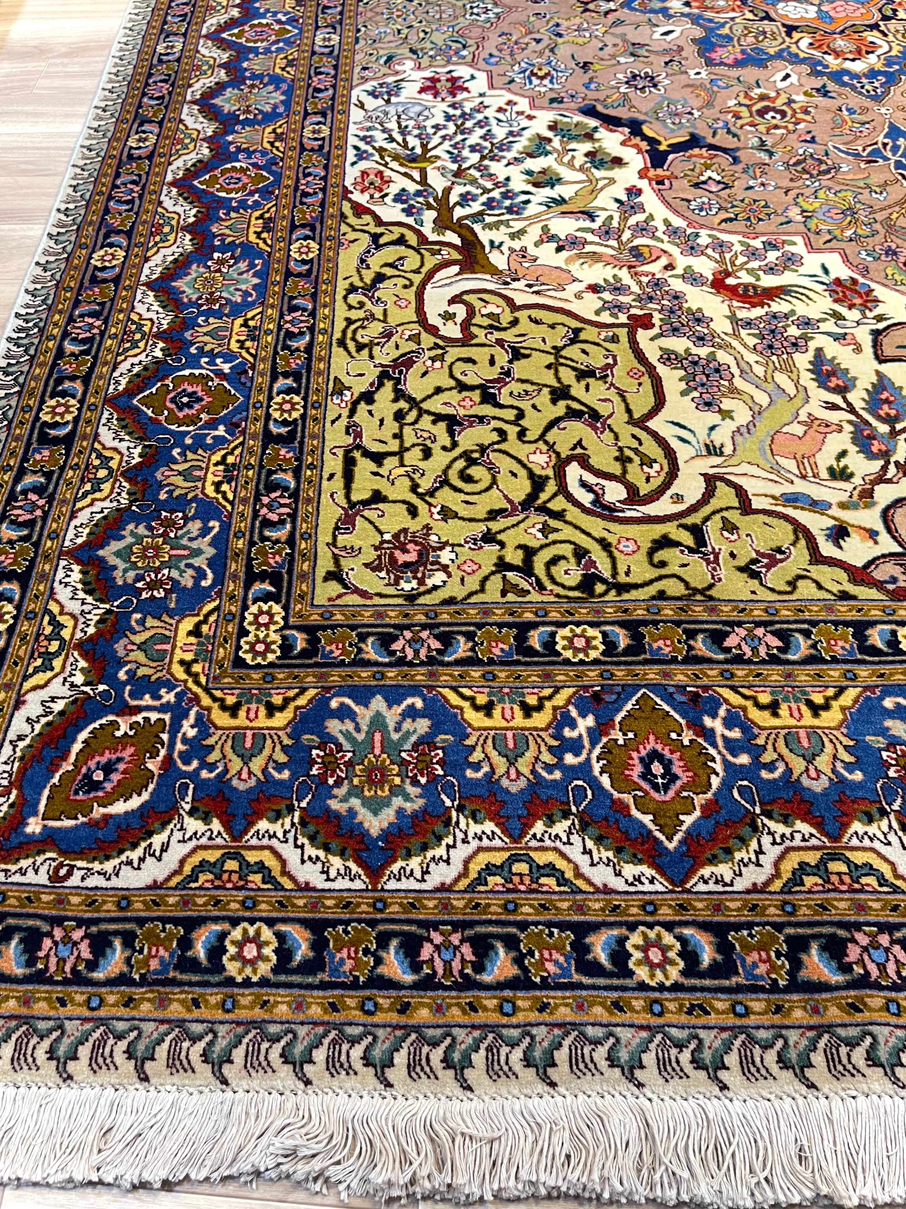 「マヒじゃない!」タブリーズということで、約半世紀前に織られたタブリーズ産のオールド絨毯です。こちらはイラン最北西エリアに古くから伝わる、デザインパターンの一つ。コーナーには花を咲かせ、脈々とした佇まいの樹木に、鹿や鳥が集い、アオシスを構成します。ひっそり身を潜めるオオカミにもご注目。