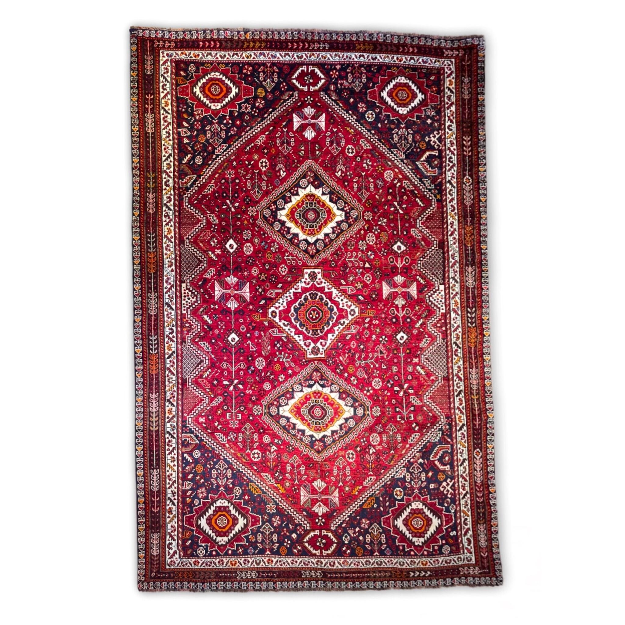南イランのアバデで織られる絨毯は、菱形で区切られており、絨毯の中心と四隅の合わせて5つのメダリオンで構成される「へバトゥル」と呼ばれるデザインが主流です。基調部分を鳥や馬などといった動物や星、花・樹木などの紋様が隙間なく埋め尽くしています。この地域は遊牧をやめて定住したカシュガイ族の人々が多く暮らすことから、こうした紋様からはギャッベにも共通するようなものが多く見られることも特徴です。