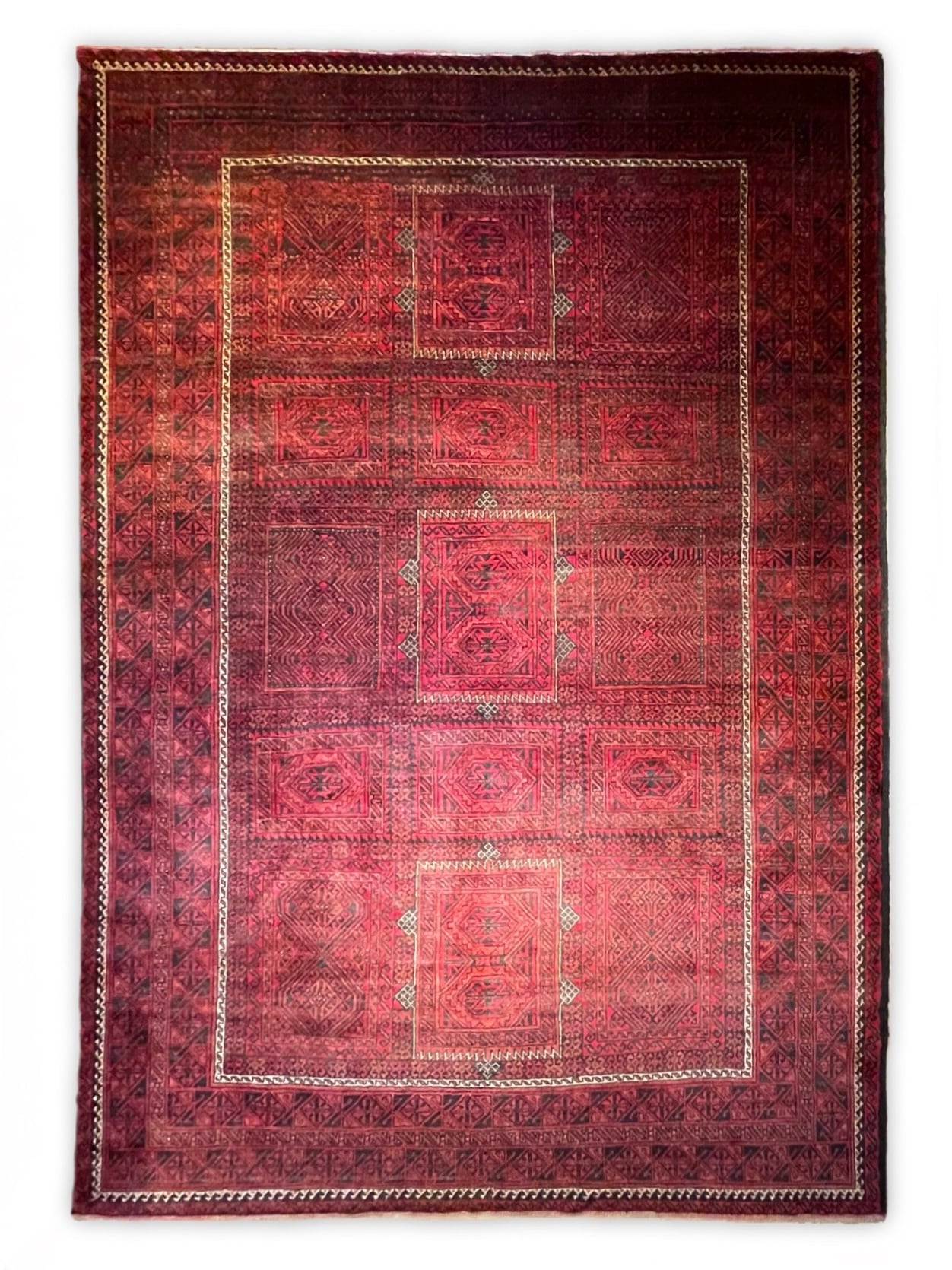 バルーチ族は東イラン、アフガニスタン、パキスタンに渡り住んでいる部族ですが、絨毯を織っているのは東イランと西アフガニスタンにいるバルーチ族だと言われています。バルーチ族の絨毯は重厚な色合いのものが多く、東洋的で渋い印象ですが、実は幾何学紋様へと姿を変えた動物柄が多く含まれています。