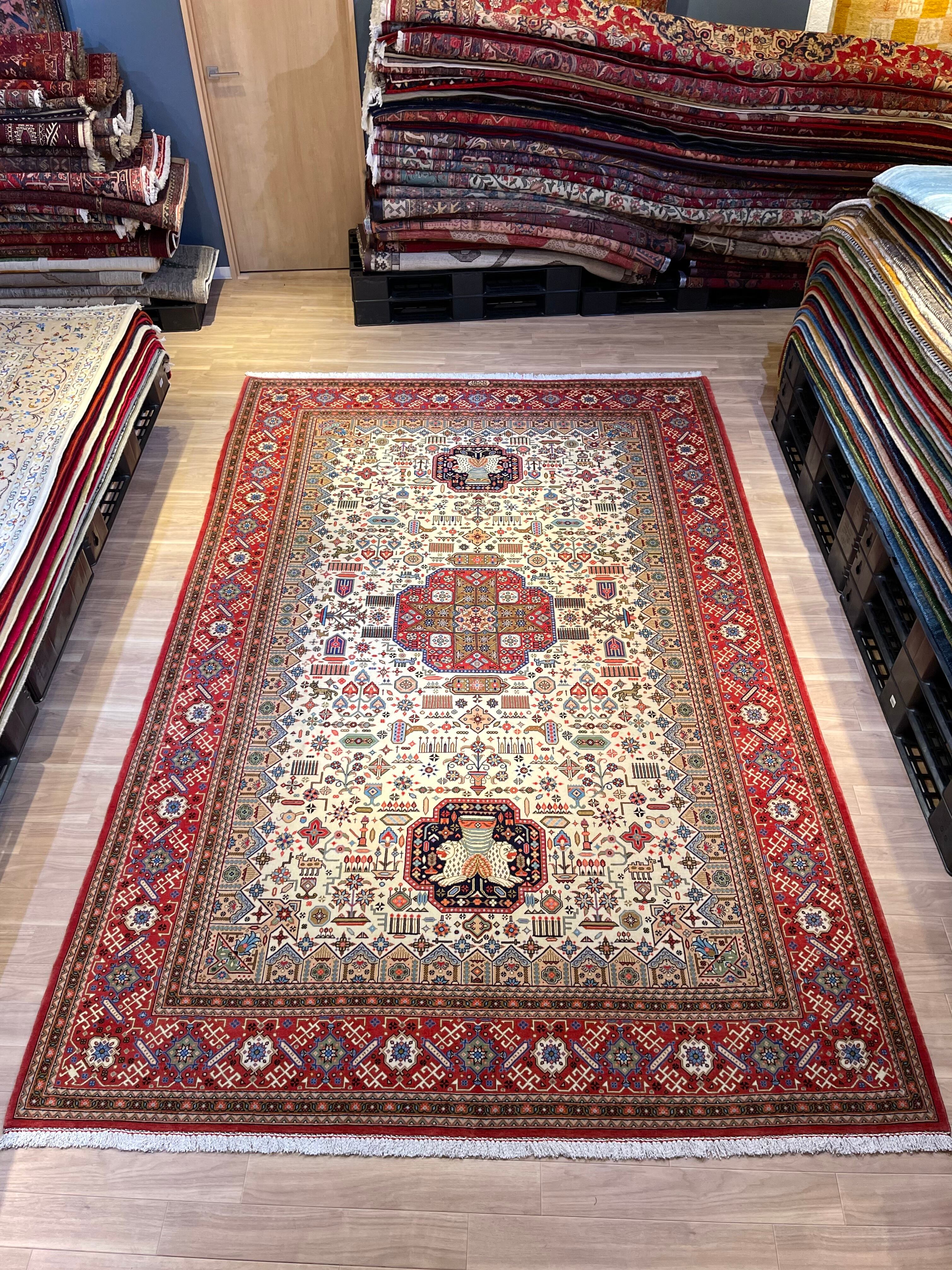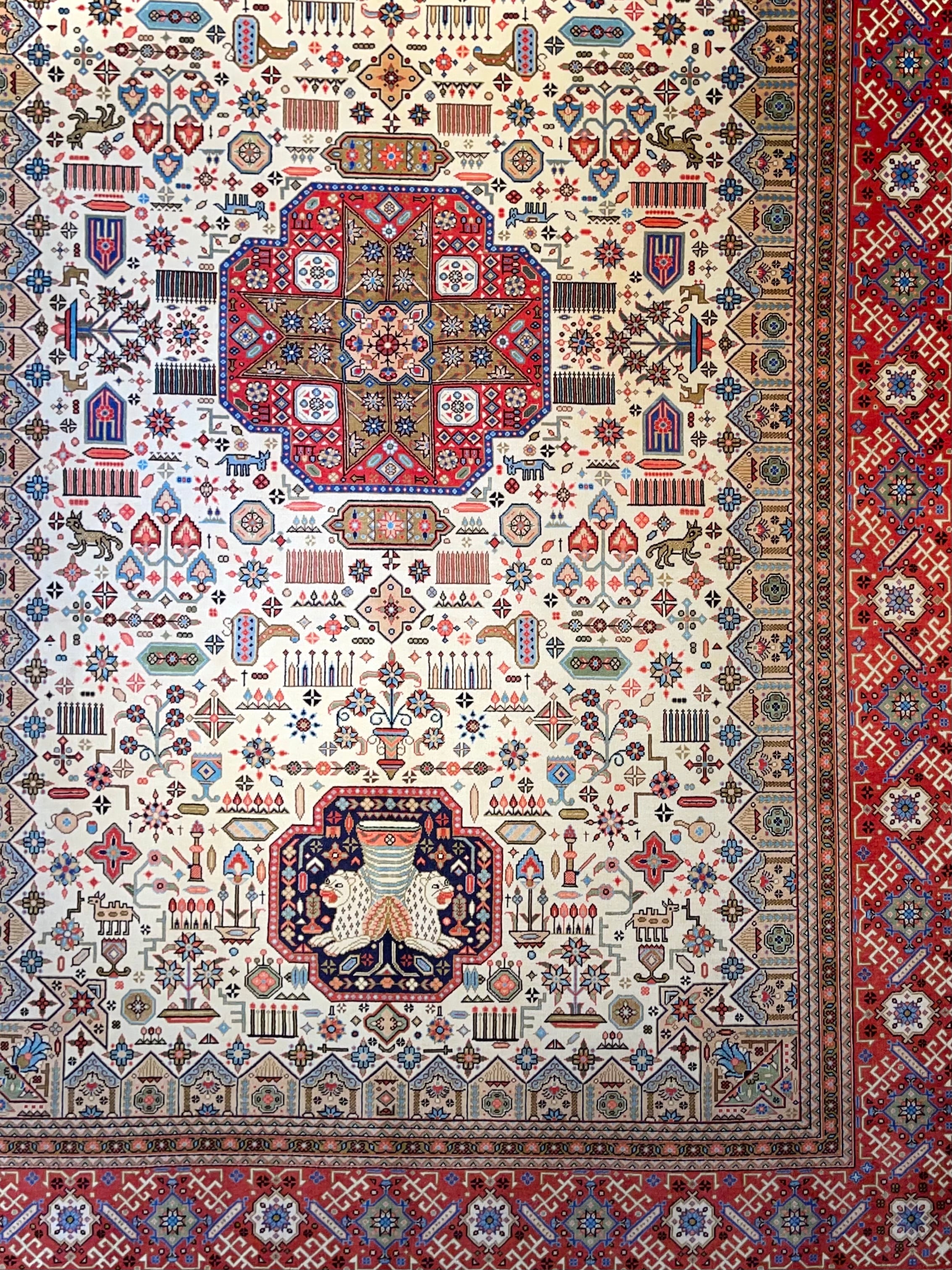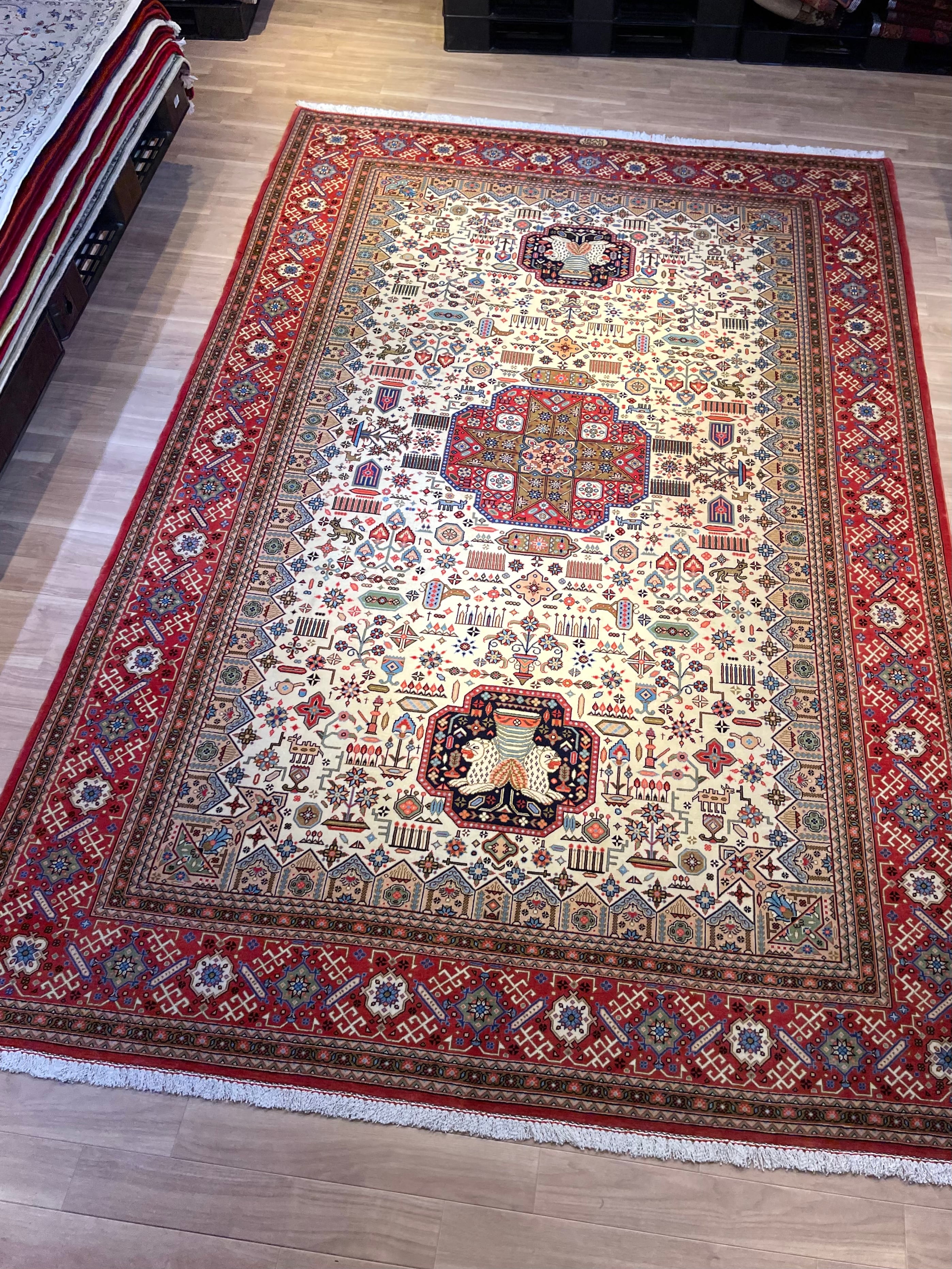 こちらは上質な極細のコルクウールで緻密に織られたクム産のお品です。アケメネス朝ペルシャの「金の盃」など、イランの紀元前の古代遺跡を彷彿とさせる、個性的なモチーフが数多く織り込まれたピースとなっております。