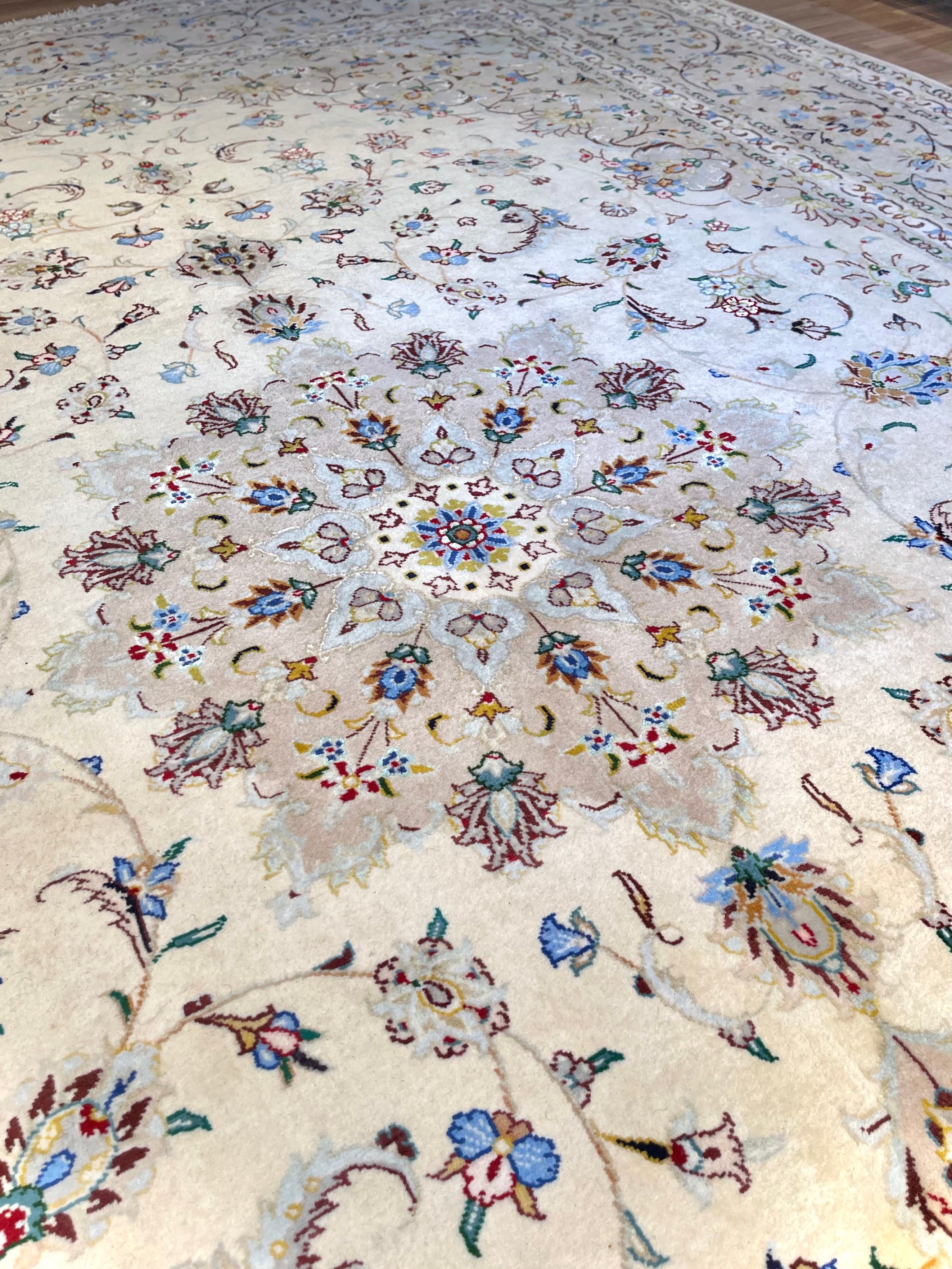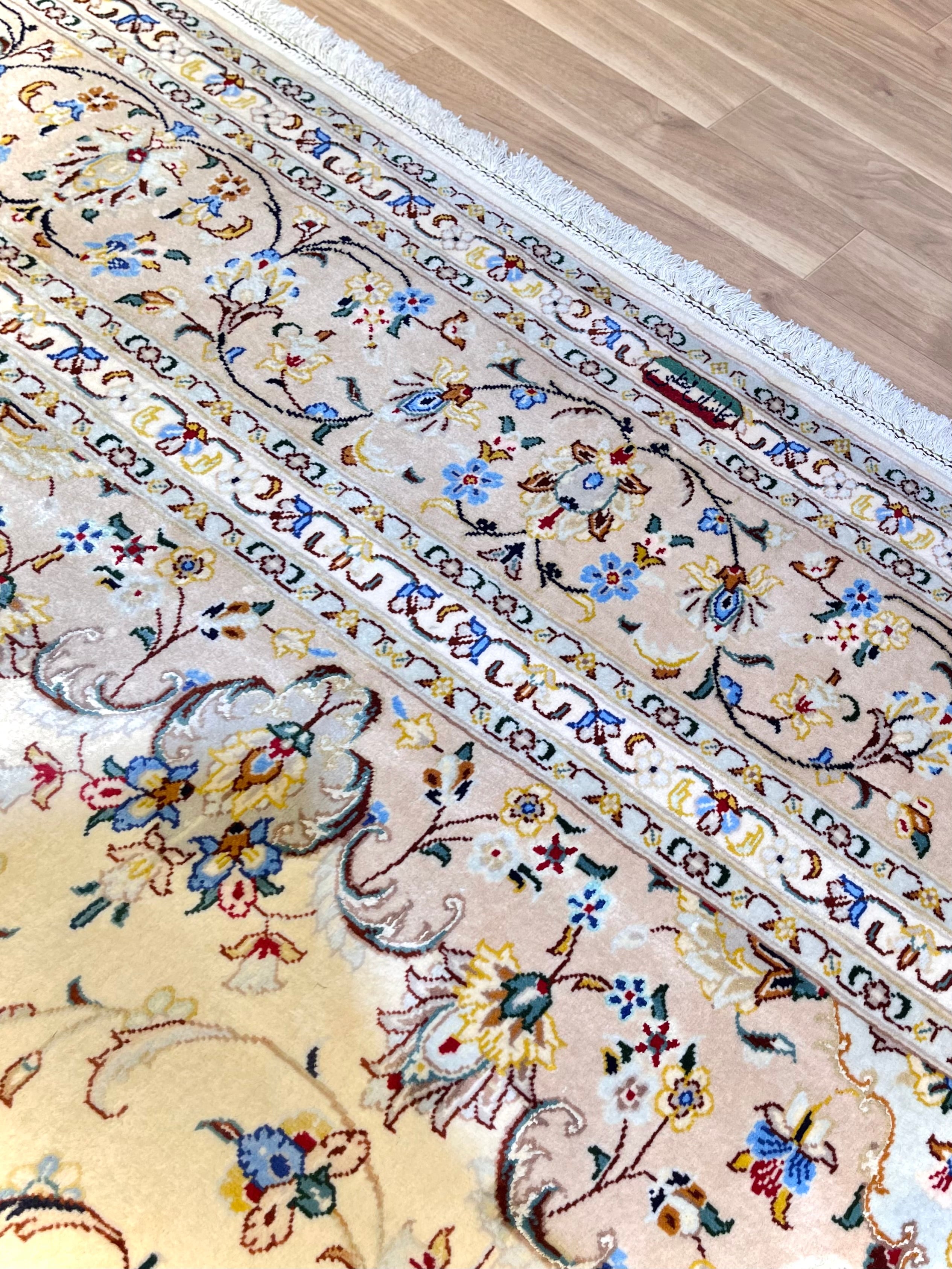 街の人口の3人に1人が絨毯産業に携わる、イラン国内でも、生粋の「絨毯の街」として認知の高いカシャーンのお品です。上質なコルクウールと共にシルクが織り混ぜられ、角度により煌めきを見せます。唐草をはじめとする、紋様一つ一つの「線の細さ」に織りの緻密さが表れ、ペルシャ絨毯の中ではシンプルで主張が控えめながらも、上質さゆえの「品の良さ」が滲み出る一枚です。