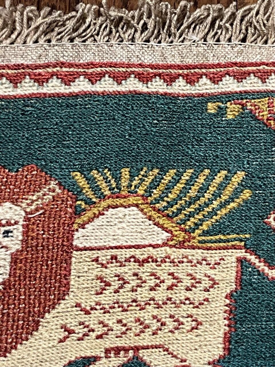 小さなソマック織りキリムです。イランでは力の象徴とされているライオンのモチーフがアクセントになっています。