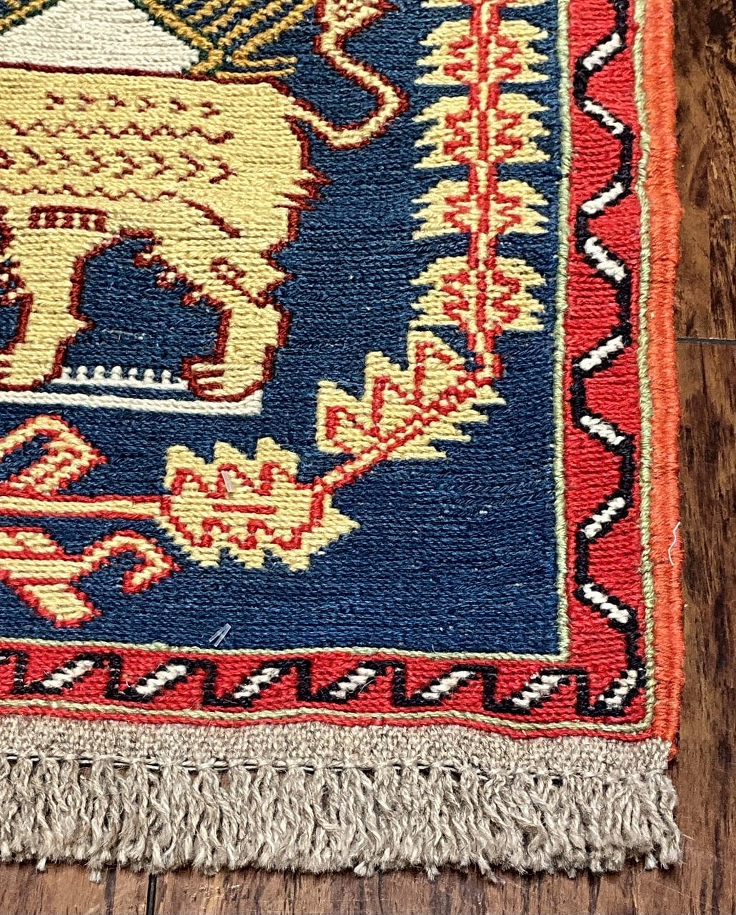 小さなソマック織りキリムです。イランでは力の象徴とされているライオンのモチーフがアクセントになっています。