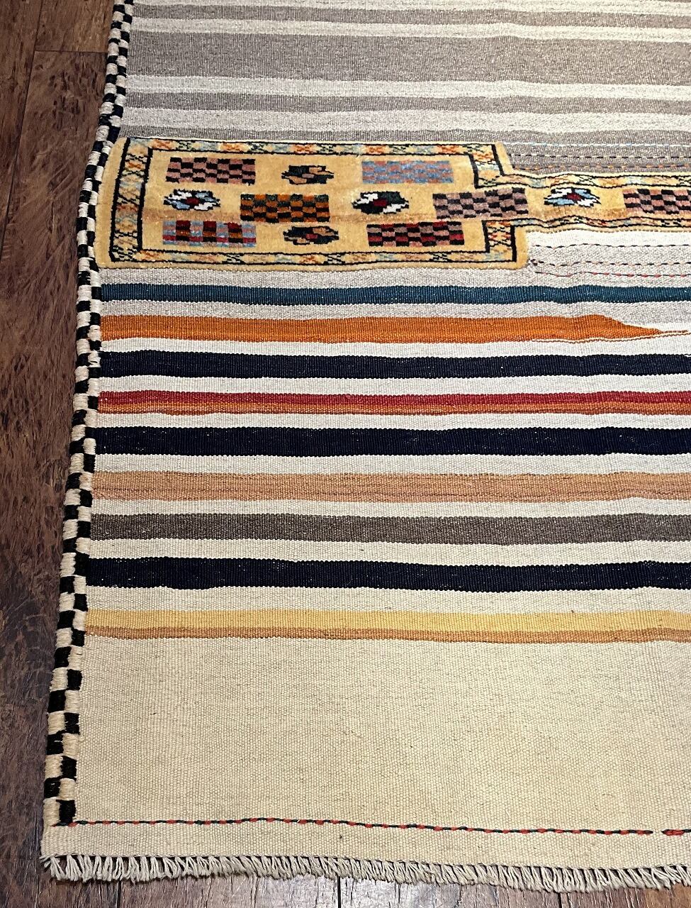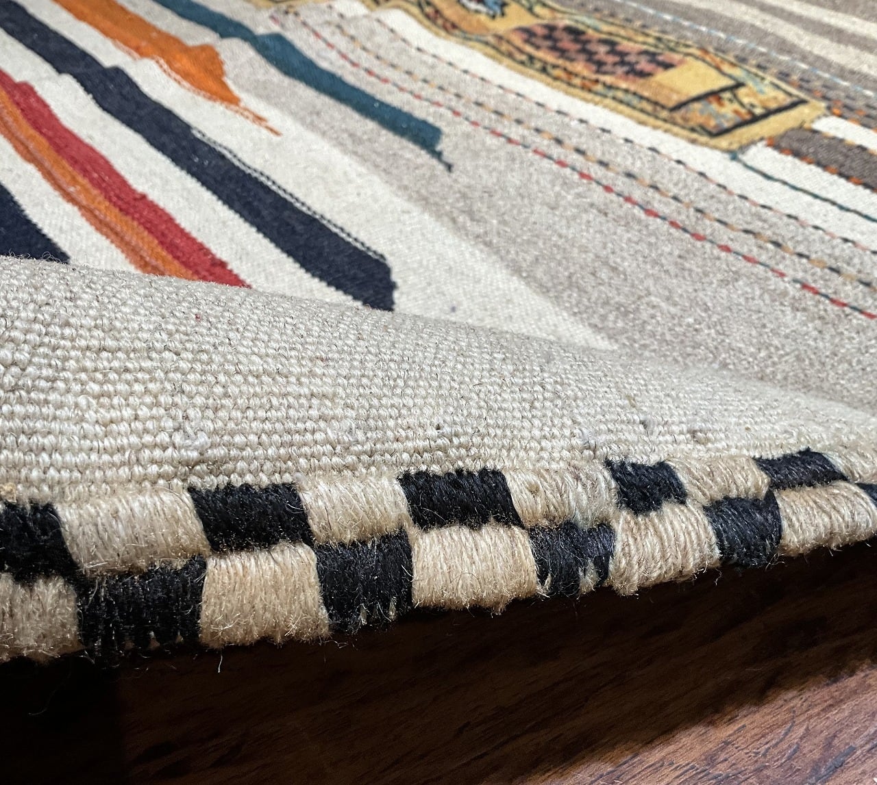 ザックリな絨毯織り部分と緻密な平織り部分との、このギャップがオシャレです。平織りと絨毯織りで織られたオールドアイテム。ホルジンと呼ばれ、元々は馬の背がけのサドルバックとして作られたものを、開いて仕立て直したものになります。パッチワークしたのではなく、一枚で織り上げています。