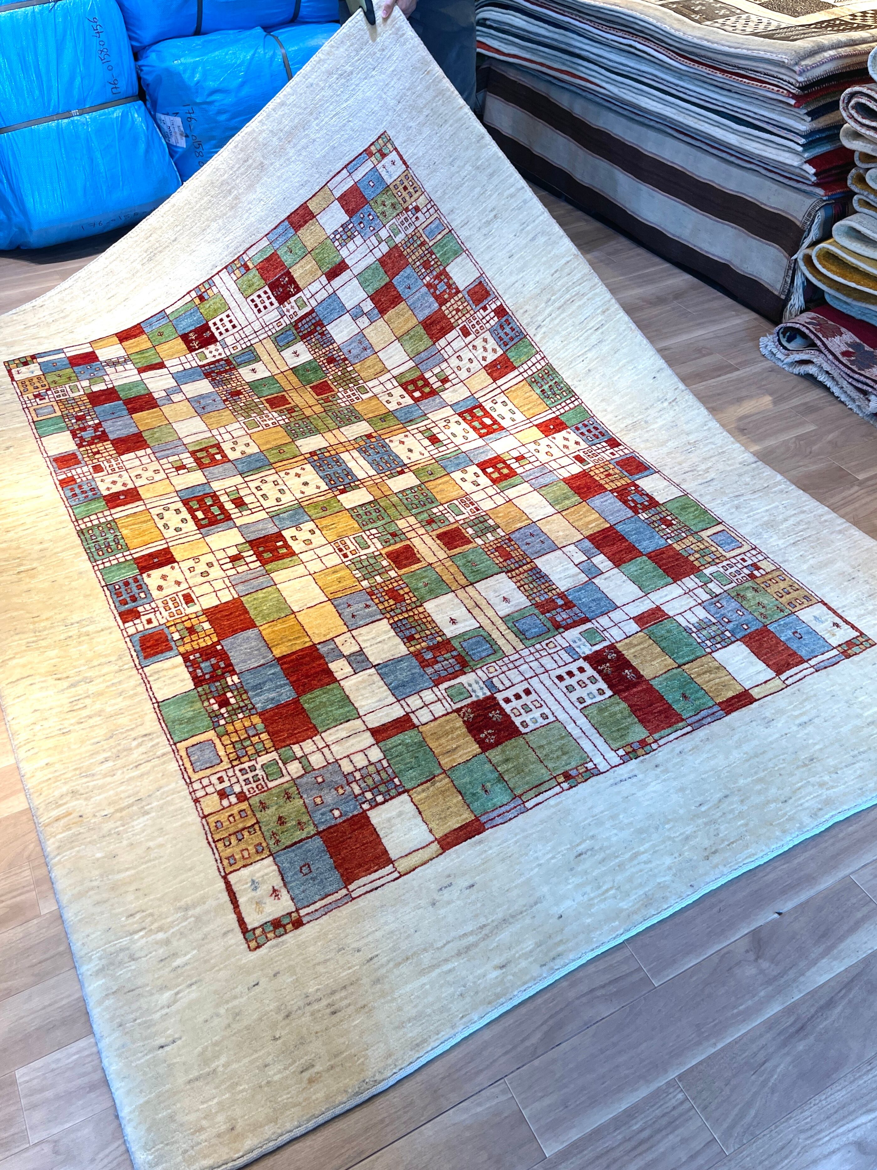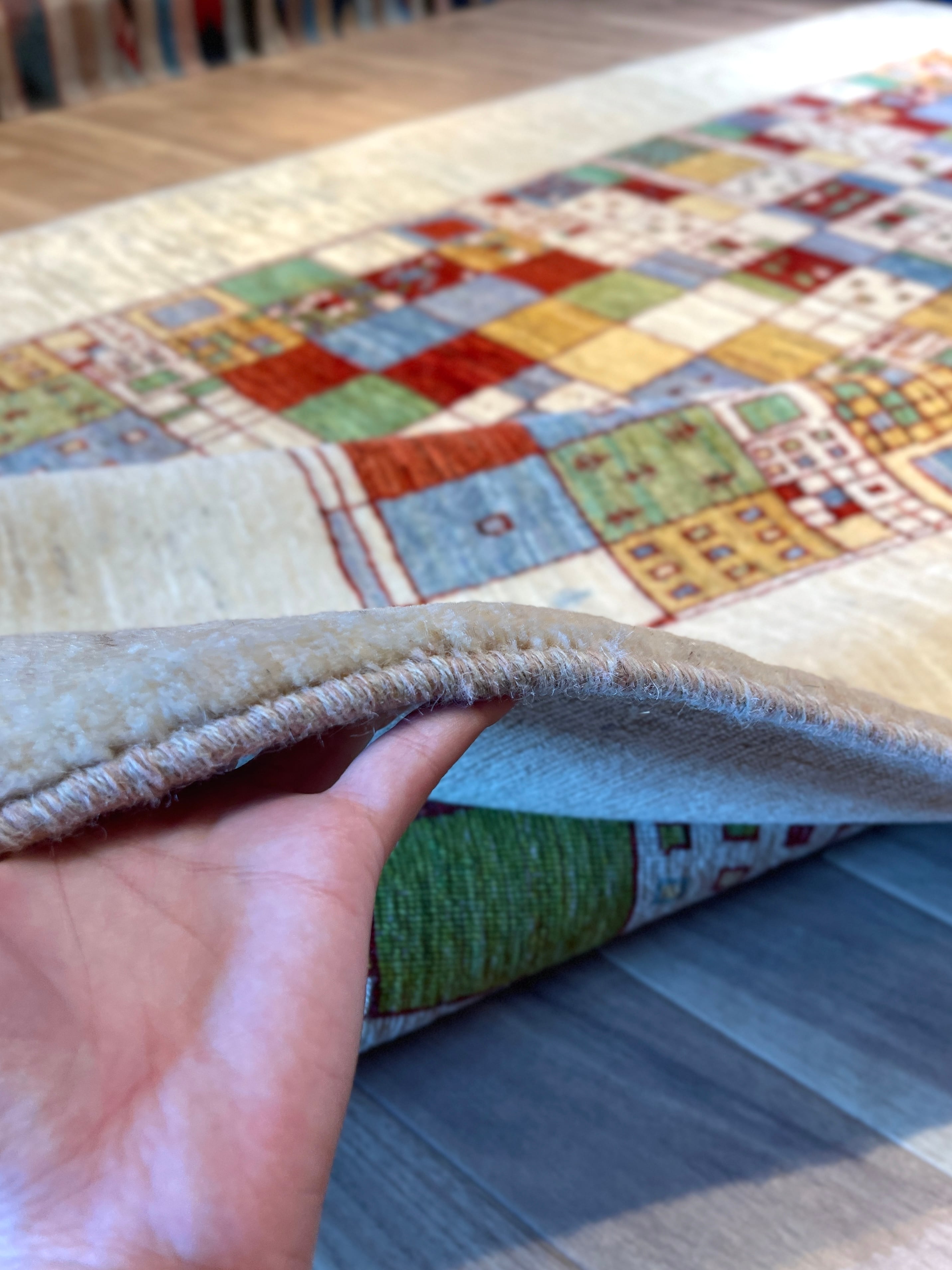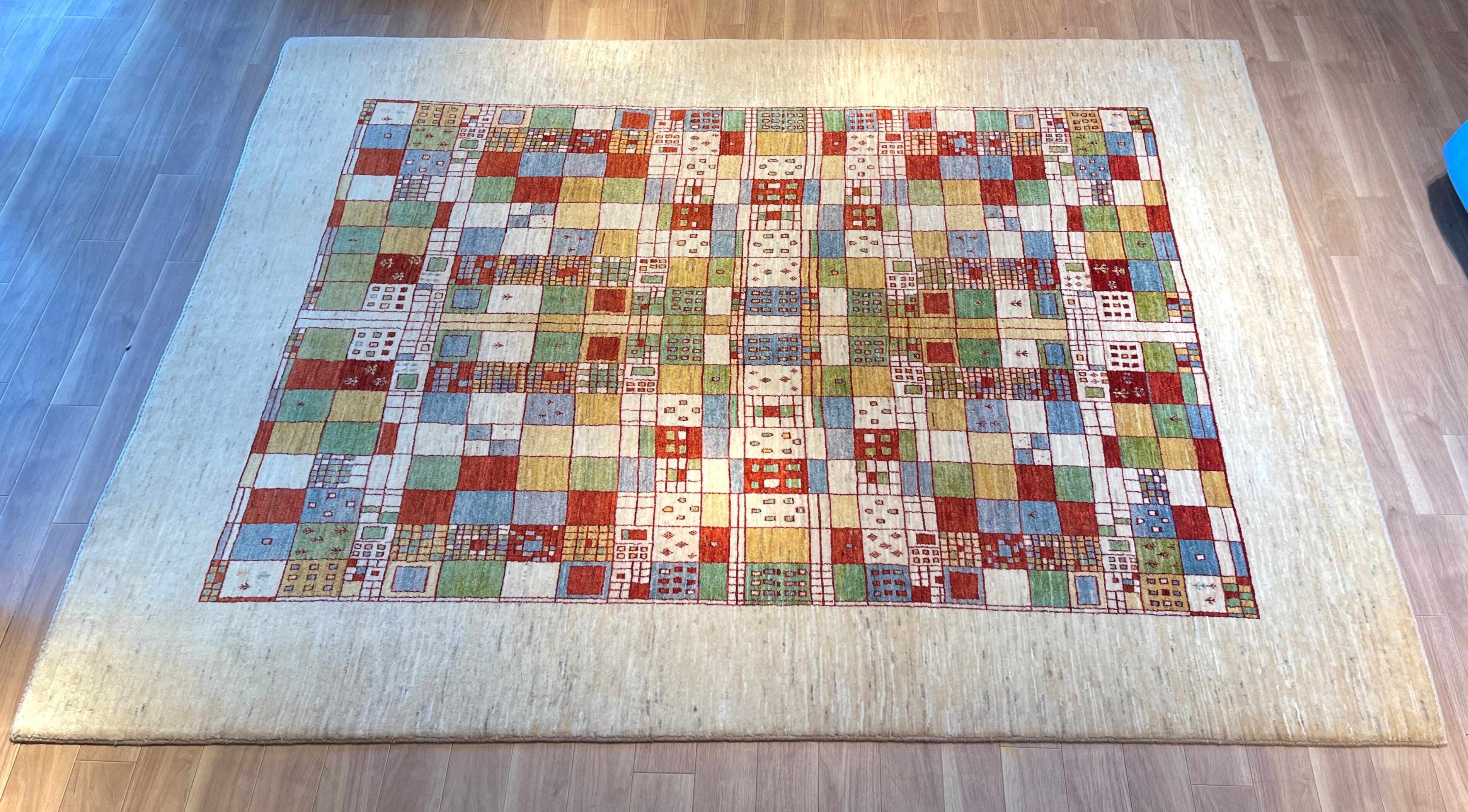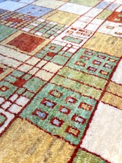 タイルのような整ったデザインと爽やかな配色。モンドリアンのコンポジションをも彷彿とさせます。一見モダンな印象に見えますが、ディテールにはギャッベの伝統的なモチーフが、極小サイズで織り込まれています。
