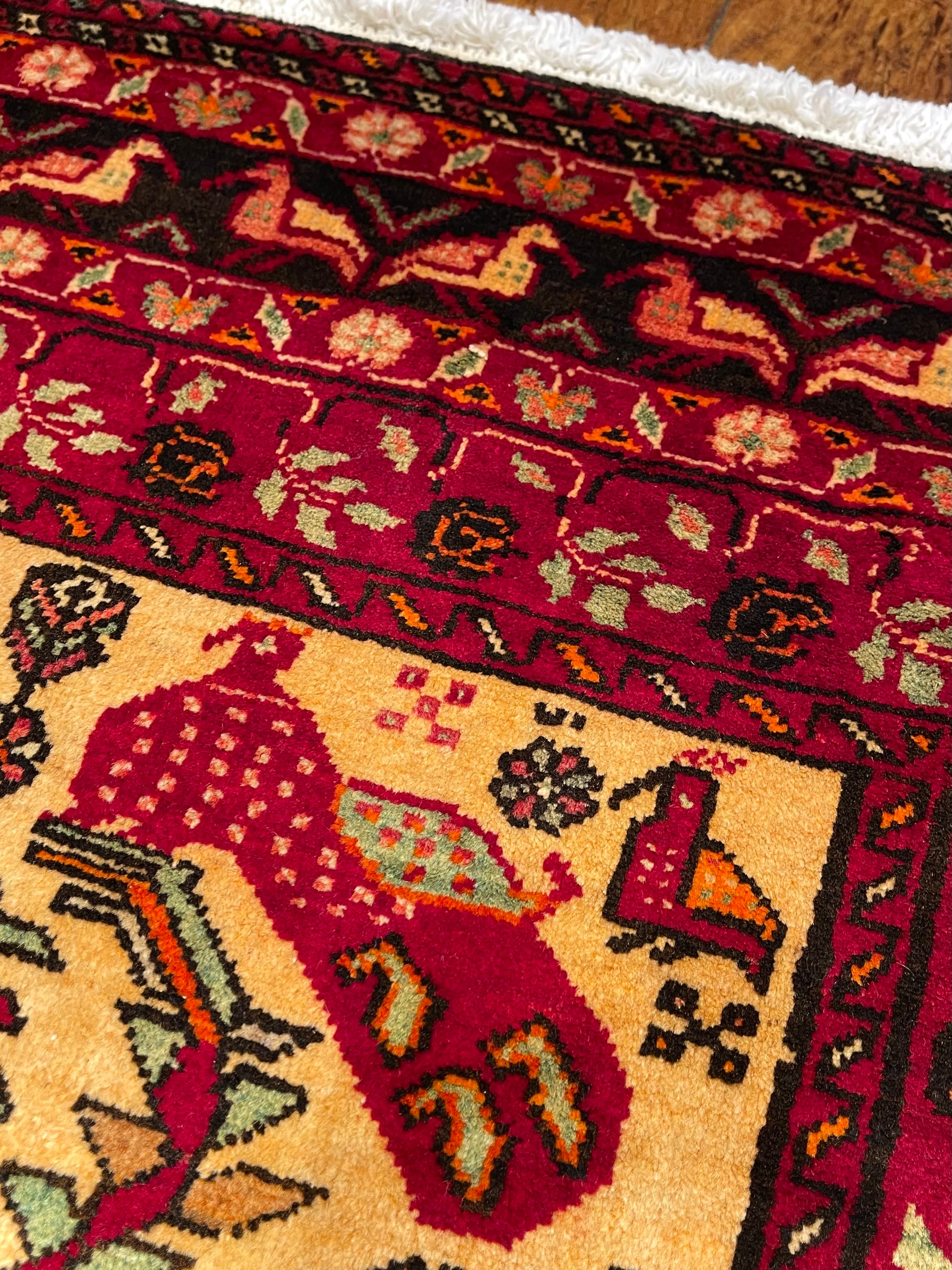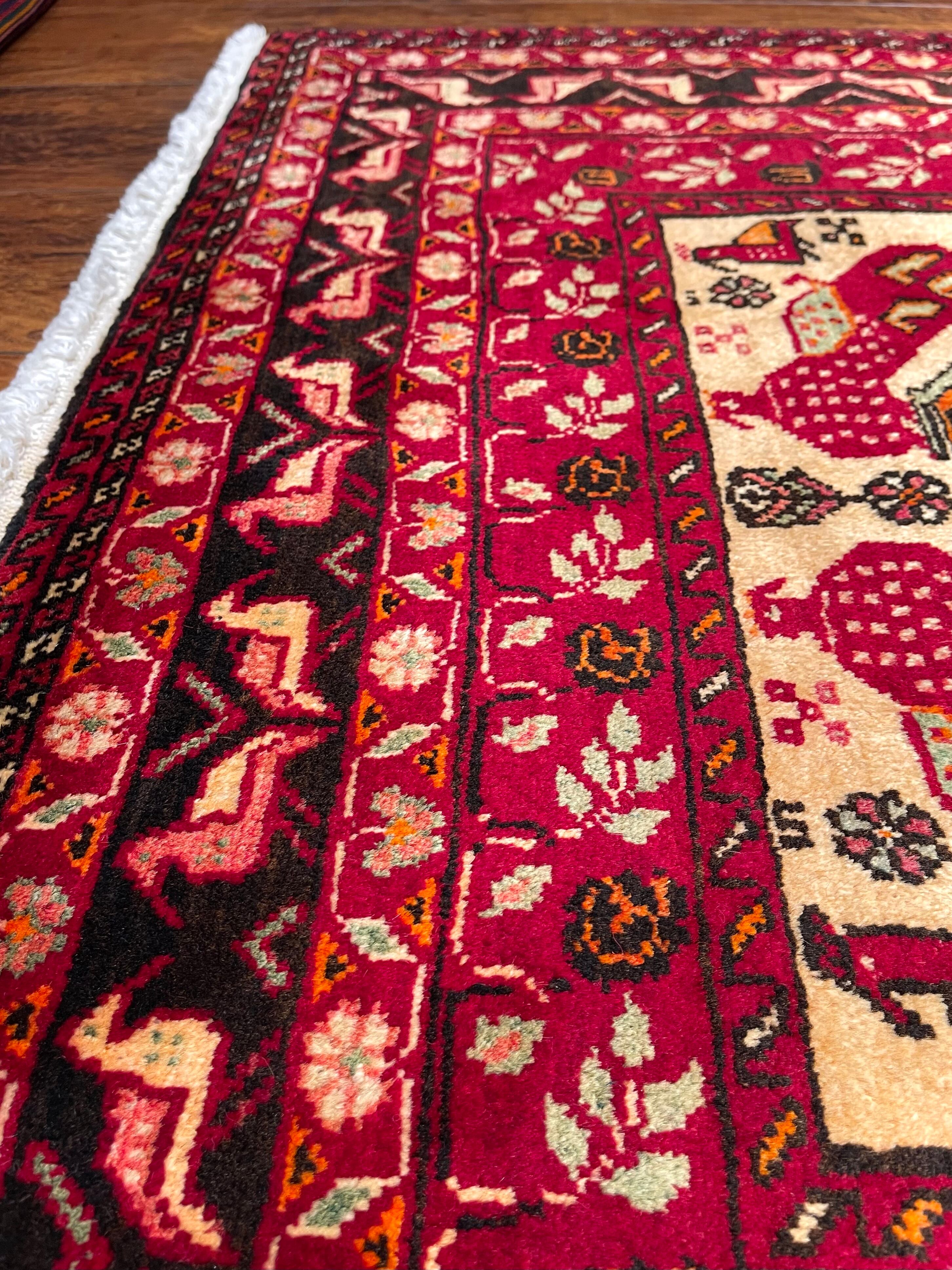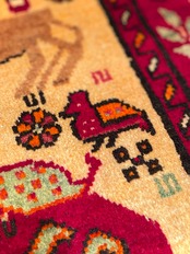 バルーチ族は東イラン、アフガニスタン、パキスタンに渡り住んでいる部族ですが、絨毯を織っているのは東イランと西アフガニスタンにいるバルーチ族だと言われています。バルーチ族の絨毯は重厚な色合いのものが多く、東洋的で渋い印象ですが、実は幾何学紋様へと姿を変えた動物柄が多く含まれています。