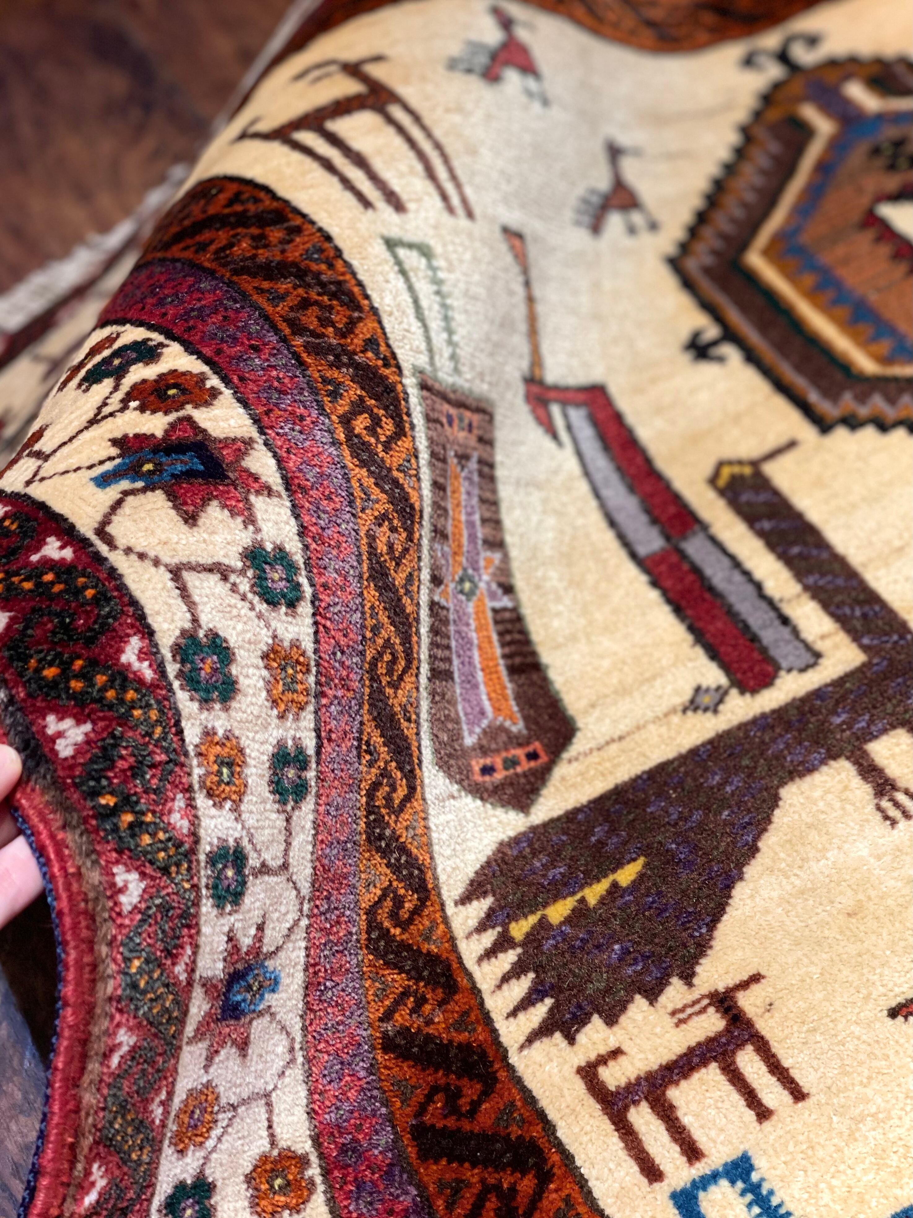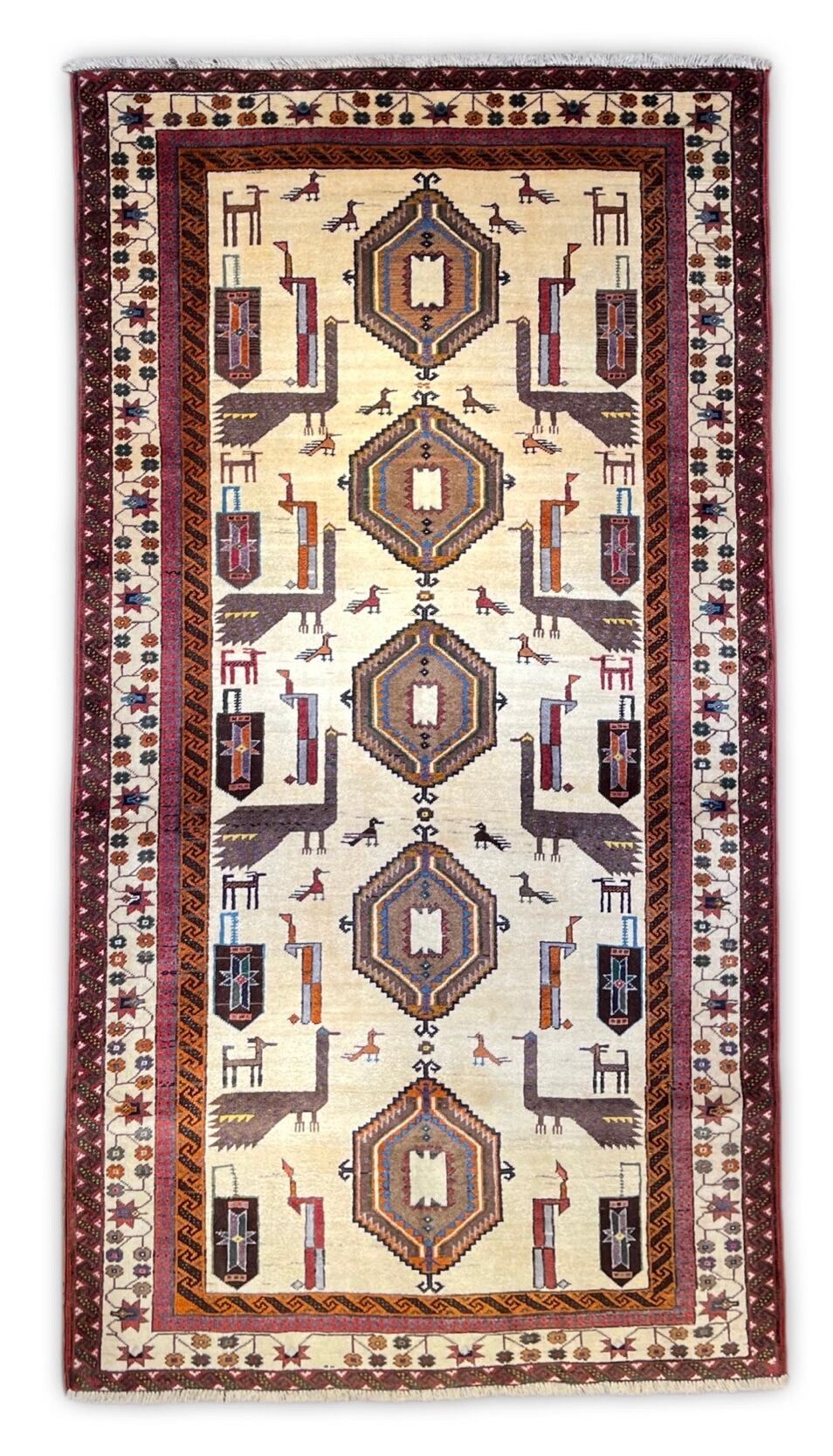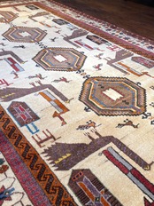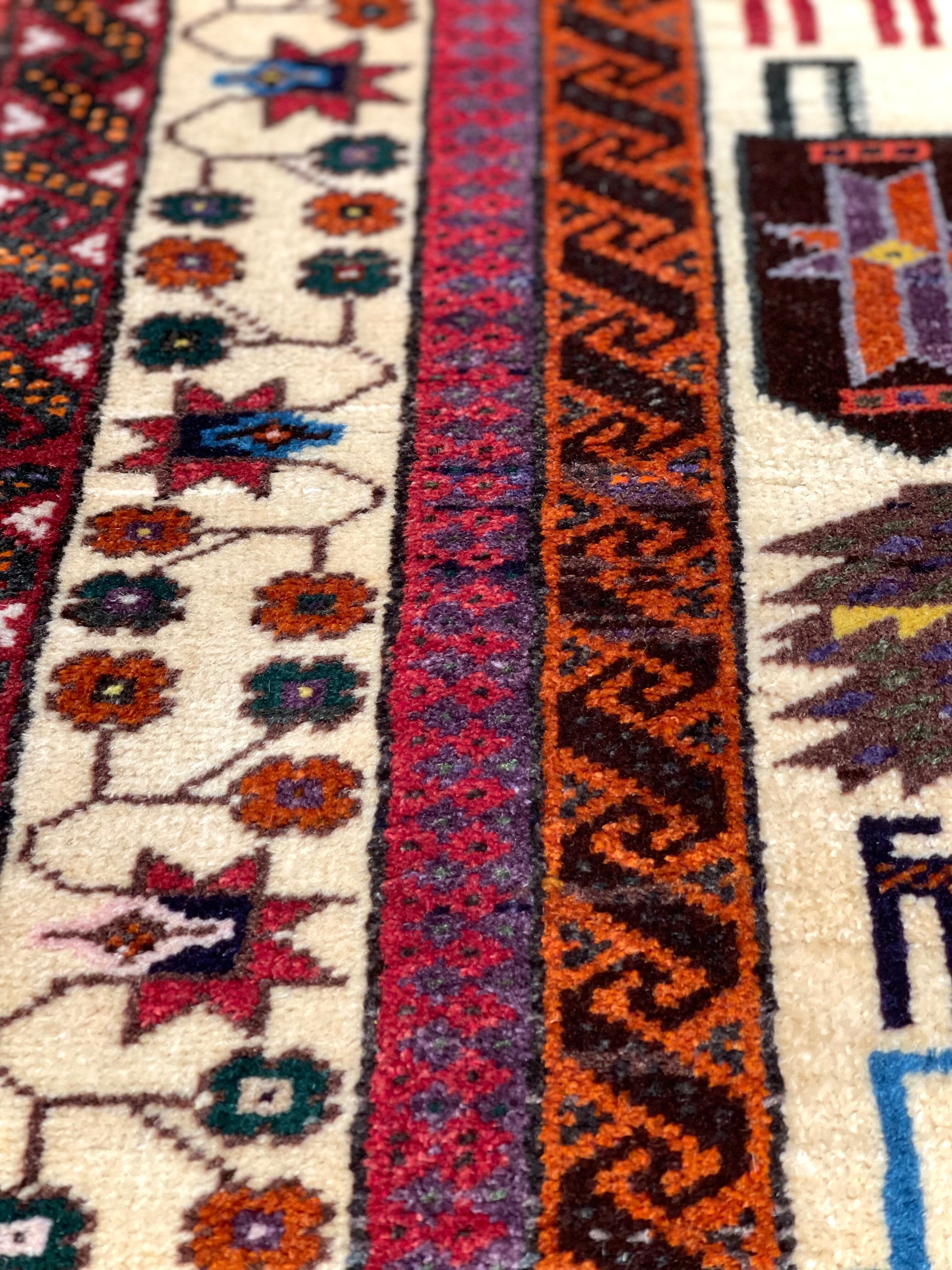バルーチ族は東イラン、アフガニスタン、パキスタンに渡り住んでいる部族ですが、絨毯を織っているのは東イランと西アフガニスタンにいるバルーチ族だと言われています。バルーチ族の絨毯は重厚な色合いのものが多く、東洋的で渋い印象ですが、実は幾何学紋様へと姿を変えた動物柄が多く含まれています。