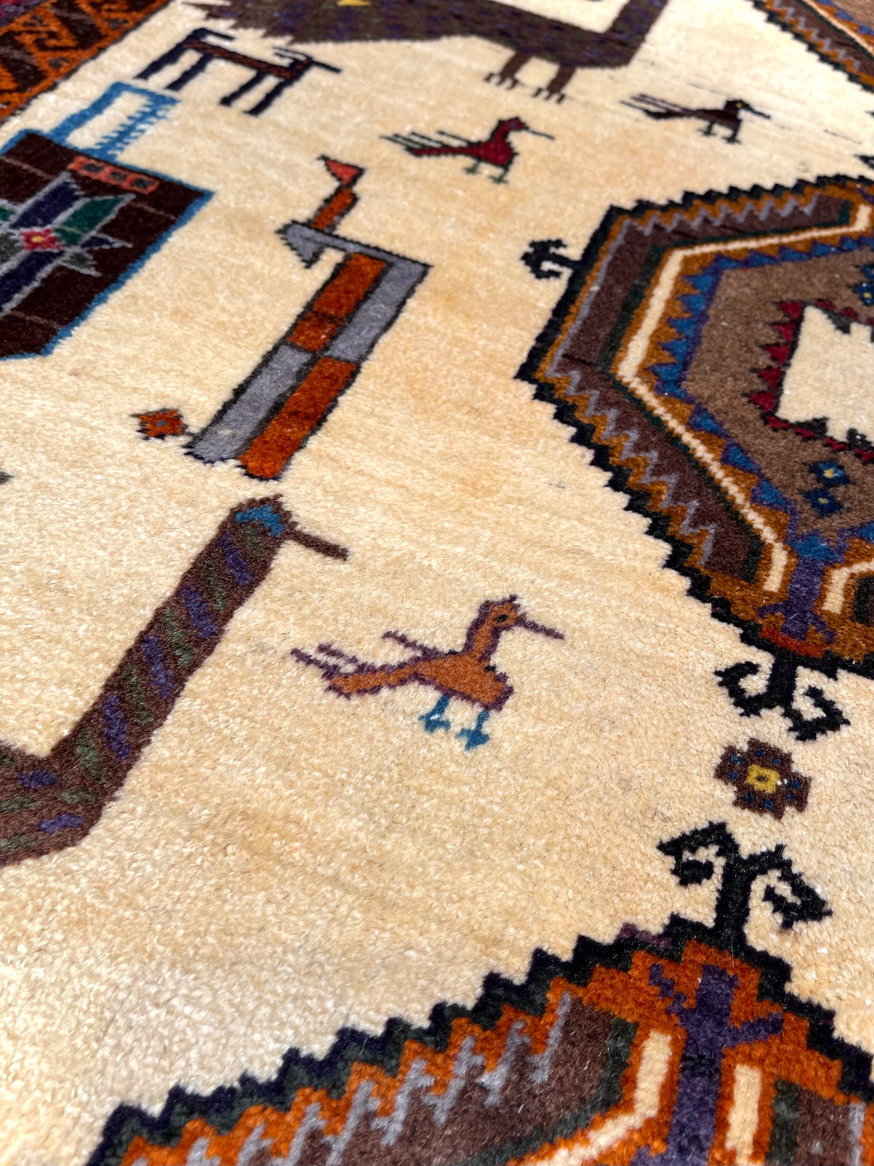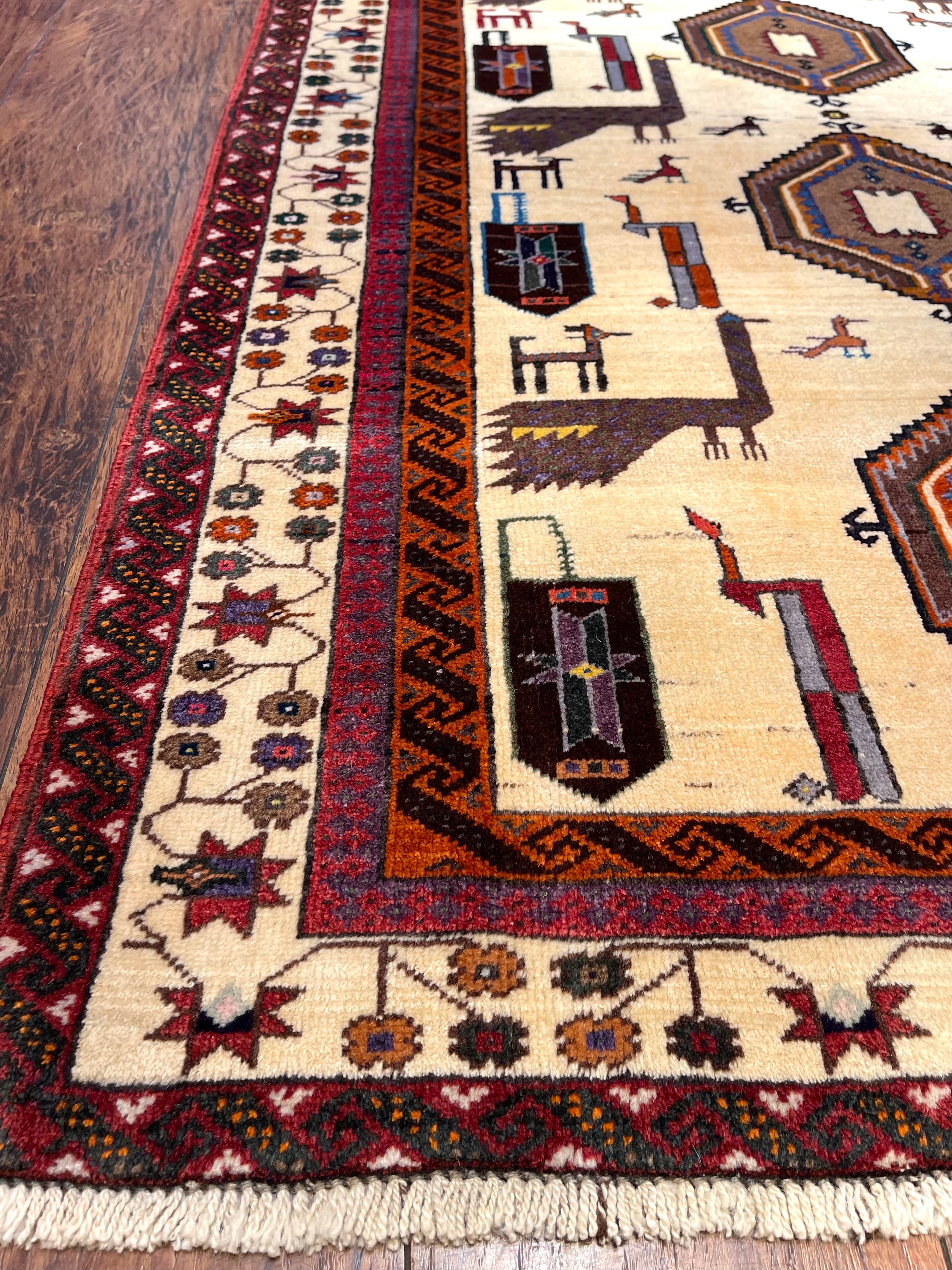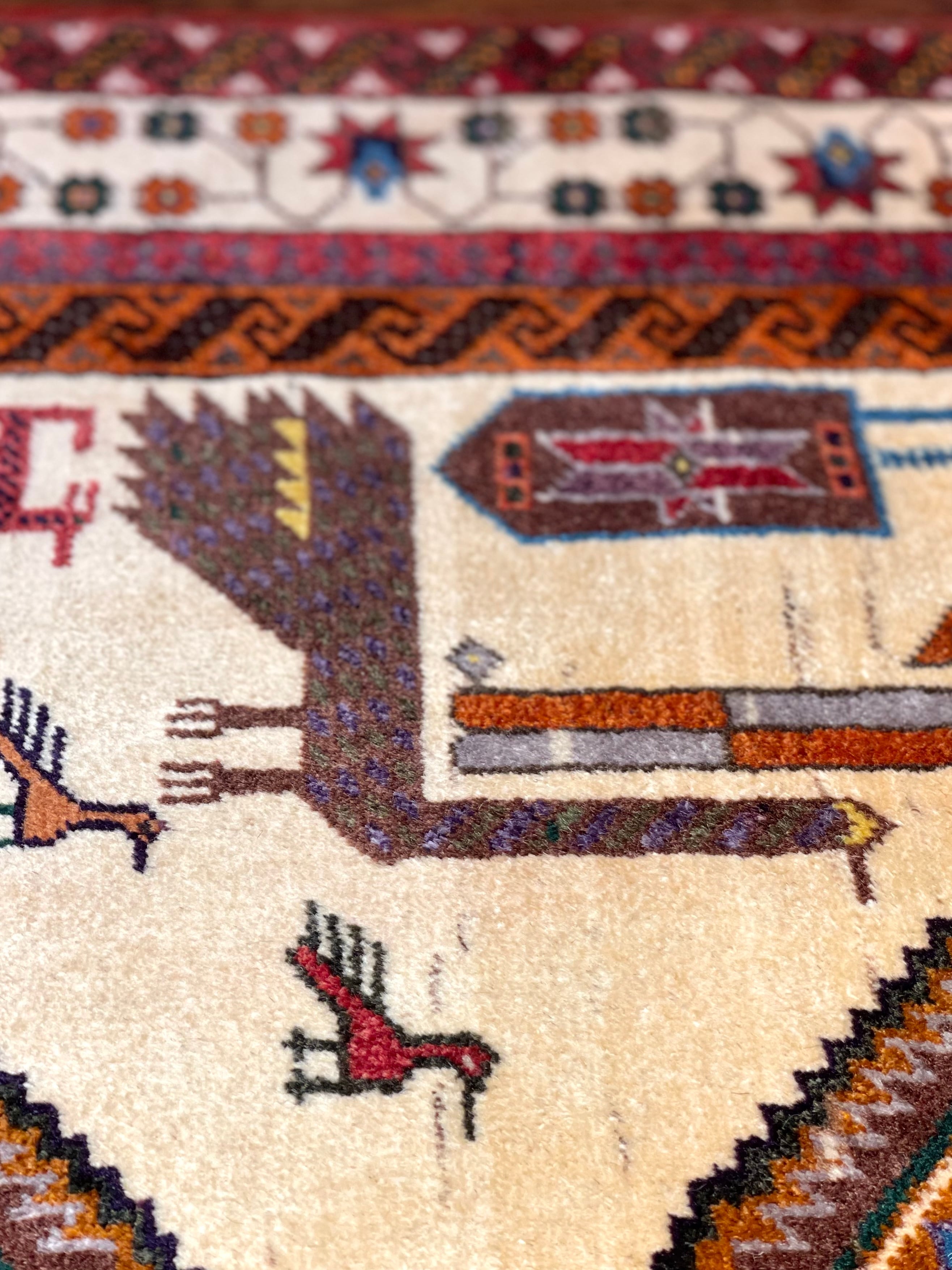 バルーチ族は東イラン、アフガニスタン、パキスタンに渡り住んでいる部族ですが、絨毯を織っているのは東イランと西アフガニスタンにいるバルーチ族だと言われています。バルーチ族の絨毯は重厚な色合いのものが多く、東洋的で渋い印象ですが、実は幾何学紋様へと姿を変えた動物柄が多く含まれています。